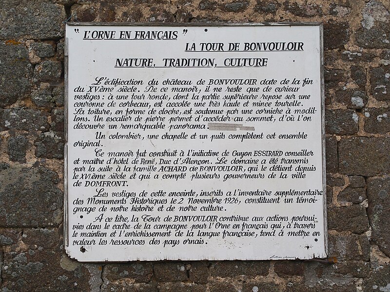Ancien château de la fin du XVe siècle, Bonvouloir s'organisait autour d'une vaste basse-cour. Située à la limite de la forêt d'Andaine, la tour de Bonvouloir se dresse sur le territoire de l'ancienne commune de Juvigny-sous-Andaine, à 1,6 km au NNE de l'église Notre-Dame-de-l'Assomption, dans la commune nouvelle de Juvigny Val d'Andaine (Orne, Normandie). Le fief a été créé en 1485 par le duc d'Alençon René en faveur de son conseiller Guyon Essirard ; en 1515, il échoit à la famille Achard de Bonvouloir. À partir du XVIIe siècle, le château a été transformé en ferme, entraînant la démolition de la plupart des courtines, et la Révolution a contribué à sa ruine progressive. Au XVIIIe siècle, la tour sud-ouest est devenue un colombier.