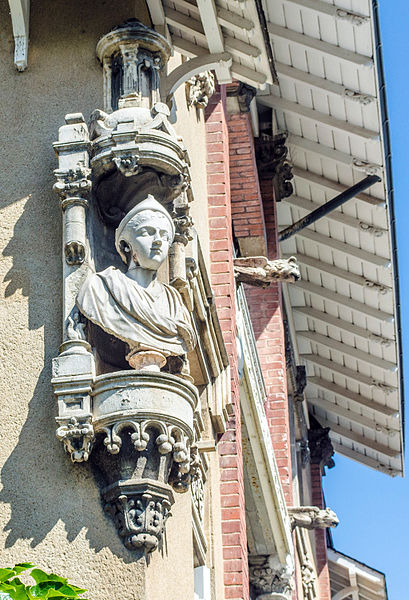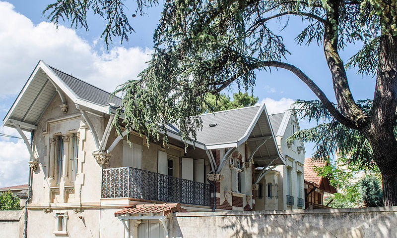 La villa des Cigales, premier élément subsistant, est composée de plusieurs pavillons juxtaposés de hauteurs variables et d'unités ne dépassant pas un étage, coiffés de toitures aux pentes marquées ; sous leurs avancées, poutres et solives saillantes sont sculptées de têtes fantastiques et grotesques. La décoration emprunte au vocabulaire médiéval et renaissant avec des fenêtres à meneaux et des décors sculptés, tandis que l'intérieur conserve des gypseries riches et des pavages en mosaïque de verre ; l'un des derniers pavillons servait d'atelier à Casimir Genest.