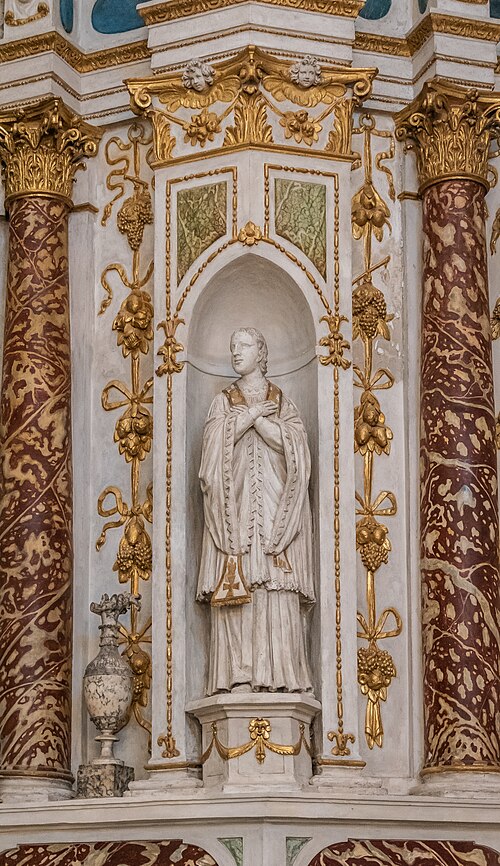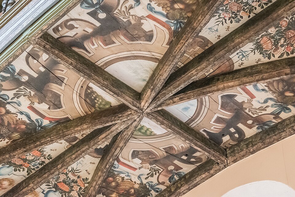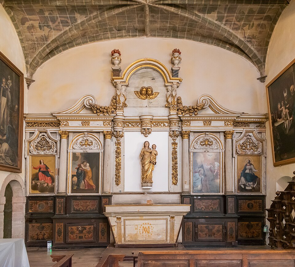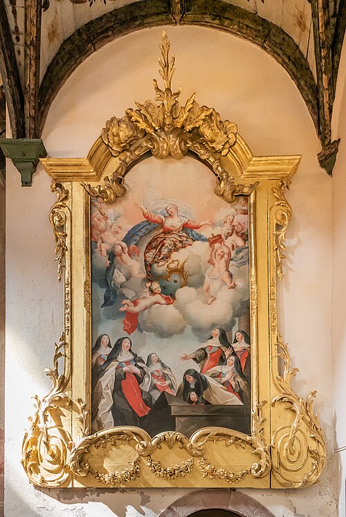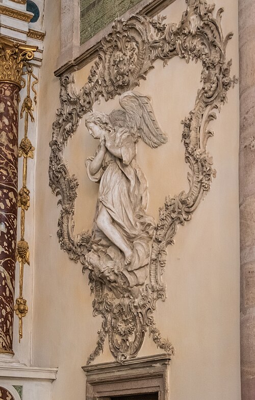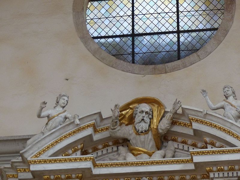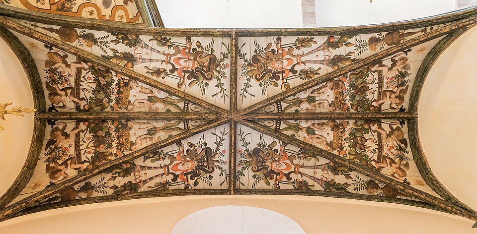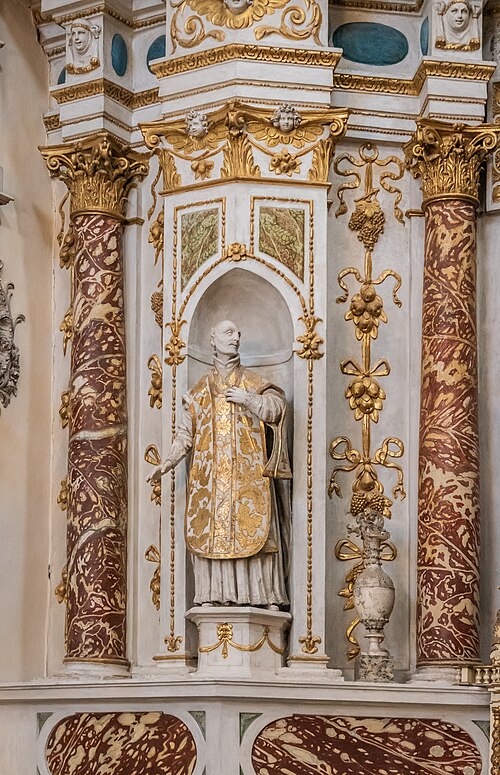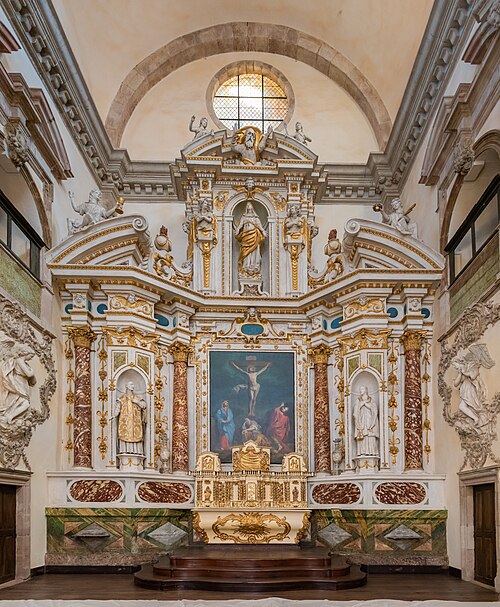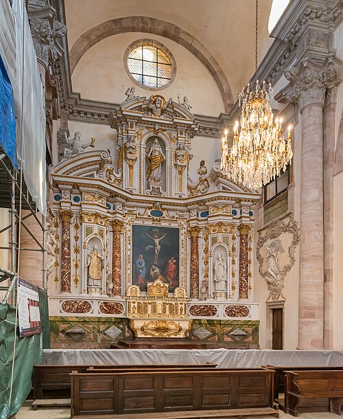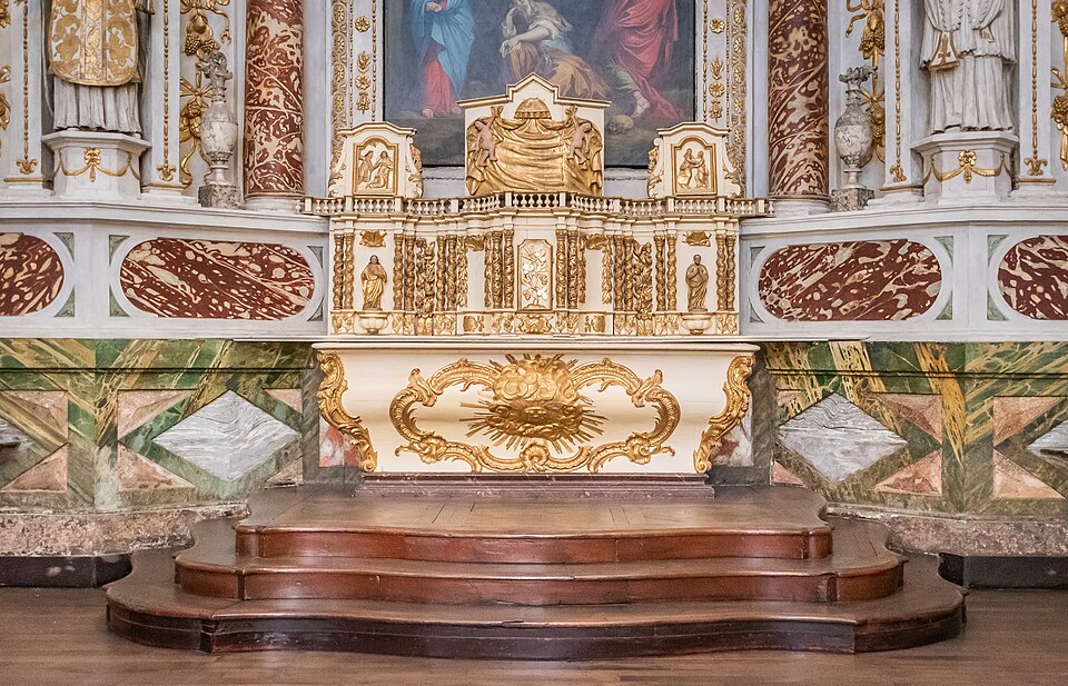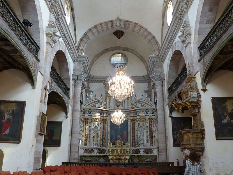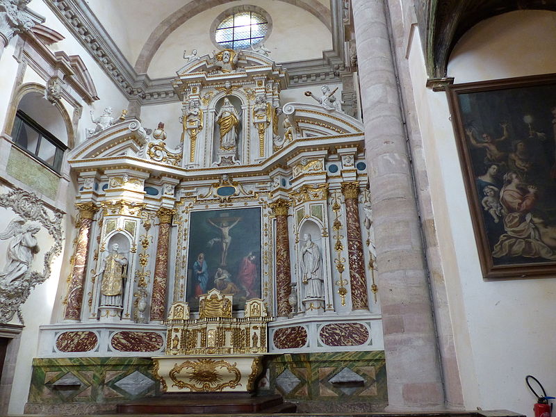 Sur le plan, l'édifice s'inspire de l'église du Gesù à Rome et présente une nef longitudinale en croix latine composée de trois travées carrées, un transept peu saillant et une coupole sans tambour à la croisée. Les collatéraux sont remplacés par un déambulatoire ouvrant sur de petites chapelles rayonnantes, tandis que le chœur, très peu profond, se réduit à une abside voûtée en berceau. Le maître‑autel tridentin ferme le chœur et, derrière lui, un espace pratiquement clos accueille les stalles pour le service religieux. La nef est divisée par des doubleaux reposant sur des pilastres corinthiens ; chaque travée est voûtée par une coupole sur pendentifs et les caissons des voûtes en bois sont ornés de peintures.
