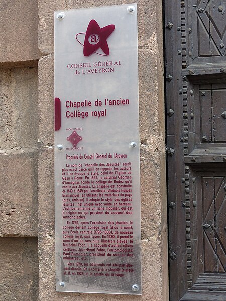 L'ancien collège des Jésuites, aujourd'hui lycée Foch à Rodez (Aveyron, Midi‑Pyrénées), comprend une chapelle, un bâtiment de galerie et la fontaine de Vors. La chapelle, qui appartenait au collège, a été construite entre 1596 et 1635 et présente des éléments datés du 4e quart du XVIe siècle et du 2e quart du XVIIe siècle. L'architecte Hugues de Bramarigues fut chargé des travaux après la fondation du collège engagée en 1562 par le cardinal Georges d'Armagnac ; la construction s'est poursuivie de 1619 à 1649. Confié aux jésuites pour la maîtrise d'œuvre et l'administration, l'établissement devint un collège renommé jusqu'à l'expulsion des religieux en 1769. Par la suite, il porta successivement des noms tels qu'École centrale ou Lycée impérial tout en conservant un niveau d'enseignement élevé. La chapelle est classée au titre des monuments historiques depuis 1927.