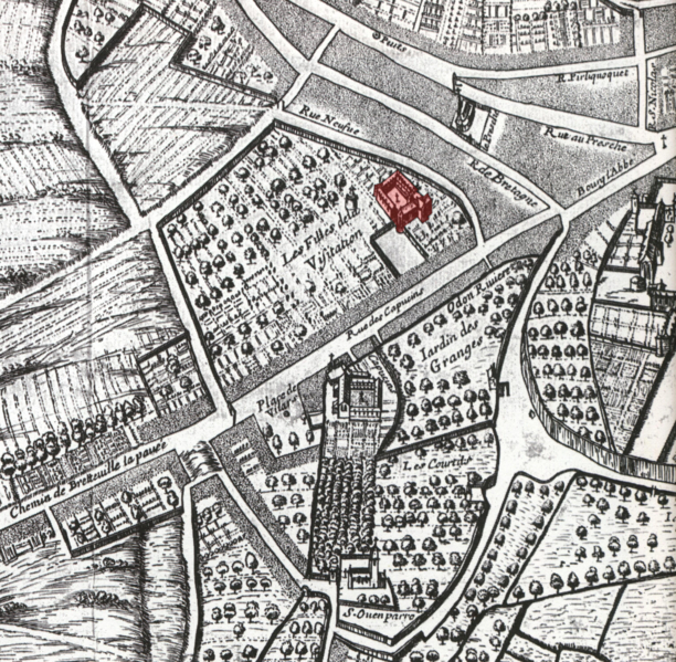 L'ancien couvent de la Visitation de Caen, aussi appelé monastère de la Visitation de Sainte-Marie de Caen, se situe dans le Calvados et a été fondé par l'Ordre de la Visitation au début du XVIIe siècle dans le quartier du Bourg-l'Abbé. Transformé en caserne pendant la Révolution, il fait désormais partie de l'emprise du Quartier Lorge ; il ne doit pas être confondu avec le nouveau monastère des Visitandines où les sœurs se sont installées au début du XIXe siècle après la refondation de l'ordre. Le cloître a été inscrit au titre des monuments historiques le 13 juin 1927 et les bâtiments conventuels ont reçu une inscription complémentaire le 18 novembre 1988. L'implantation des Visitandines à Caen s'inscrit dans les fondations nombreuses liées à la Contre-Réforme ; l'ordre, fondé à Annecy par François de Sales et Jeanne de Chantal, s'est développé en France au cours du XVIIe siècle. Après un séjour à Dol-de-Bretagne en 1627, six religieuses vinrent s'établir à Caen en 1631 puis, en 1632, s'installèrent définitivement en périphérie de la ville en achetant un ancien manoir entouré de murs, comprenant la maison dite du Grenadier, une cour, un colombier et un jardin. Sous la direction de Marie-Élisabeth de Maupeou et par les soins de l'architecte Guillaume Brodon, l'église et les bâtiments conventuels furent édifiés entre 1632 et 1661 ; les constructions conventuelles entourèrent une cour carrée aménagée en cloître dans les années 1650. L'église, consacrée par l'évêque de Bayeux Mgr de Nesmond, remplaça une chapelle plus exiguë et bruyante proche de la route de Bretagne, et sa réalisation fut en partie financée par la famille d'Harcourt, qui obtint le privilège d'un caveau funéraire dans l'édifice. Un pensionnat fut ajouté à l'ensemble dans les années 1780. À l'origine orientées vers une vita activa, les Visitandines de Caen se consacraient au secours des filles et femmes à la santé fragile et intervinrent ponctuellement dans des institutions comme le Refuge fondé par Jean Eudes, qu'elles dirigèrent brièvement entre 1644 et 1649 avant d'en être contraintes à partir faute de moyens et à cause d'oppositions. Progressivement, la règle de la clôture s'imposa et la communauté adopta une vie plus contemplative, tandis que d'autres initiatives caritatives non cloîtrées prirent le relais au XVIIIe siècle, notamment à Vaucelles. À la suite des décisions révolutionnaires mettant les biens ecclésiastiques à la disposition de la Nation, la chapelle fut utilisée par une section révolutionnaire et, après l'interdiction des monastères, le pensionnat fut fermé et l'armée occupa les lieux à partir de 1792, entraînant l'expulsion des religieuses. Des commissions municipales organisèrent ensuite l'hébergement des soldats dans l'ancien établissement et des procès-verbaux signalèrent des dégradations commises par des troupes de passage. Au début du XIXe siècle, le monastère fut définitivement transformé en caserne ; l'église servit d'annexe militaire pour la manutention et le stockage, des écuries furent établies dans les anciens jardins à partir de 1835, et la caserne prit successivement les noms de dépôt de Remonte puis de Quartier Lorge. Restauré pour accueillir le Fonds régional d'art contemporain de Normandie-Caen, le couvent a vu son ancienne architecture réaménagée pour une vocation culturelle, le FRAC y ayant été inauguré en 2019. L'inscription de 1927 concernait la chapelle et le cloître, mais l'église fut détruite par un bombardement en 1944 et radiée de la liste des monuments historiques en 1946 ; en revanche, le reste du monastère et les bâtiments militaires du XIXe siècle furent inscrits en 1988. Le cloître, dont les galeries datent des années 1650, présente des arcades en plein cintre encadrées par des pilastres à chapiteaux d'ordre toscan, un parti sobre caractéristique du classicisme français local ; lors de la restauration pour le FRAC, ces arcades ont été fermées par des baies vitrées pour former des couloirs de circulation. L'église disparue, construite entre 1648 et 1661, avait un plan en croix grecque avec deux transepts occupés par des chapelles dédiées à Saint-François-de-Sales et à Saint-Joseph, et comportait un chœur pour les sœurs séparé du chœur principal par une grille aujourd'hui disparue ; après la transformation en caserne son sol fut recouvert et certains décors, comme un bas-relief de la fuite en Égypte, furent mutilés. La façade rappelait les modèles jésuites, avec un clocher en dôme surmonté d'un lanternon et un portail rythmé par des ordres dorique et ionique, ce qui lui valut des éloges dès la fin du XVIIe siècle. Enfin, les arrêtés d'inscription protègent aujourd'hui le cloître, la maison dite du Grenadier — notamment ses façades, toitures, sa tour à escalier en colimaçon et son pigeonnier — ainsi que les façades et toitures des bâtiments conventuels et du pensionnat, y compris l'extension du XIXe siècle.