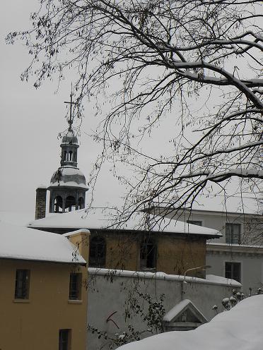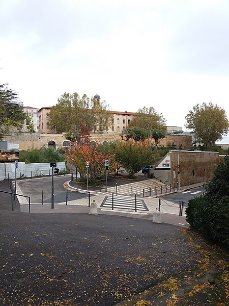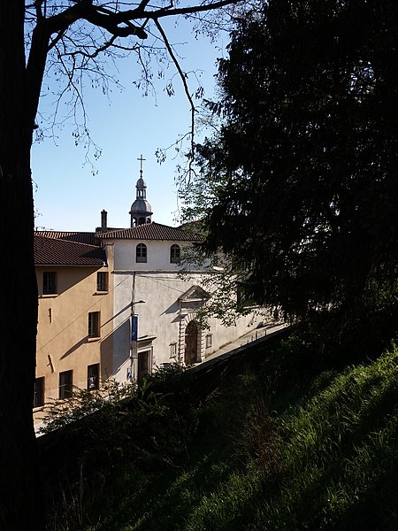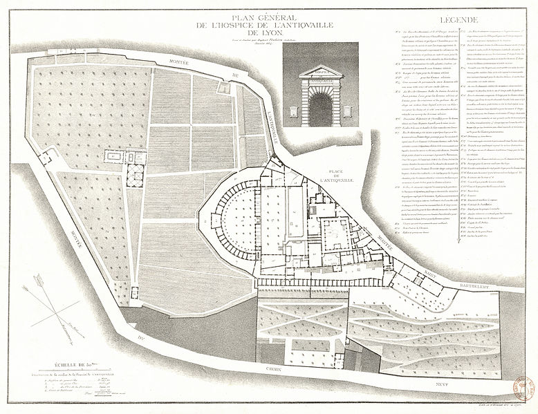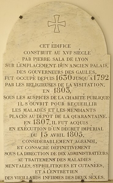 Le site de l'Antiquaille à Lyon occupe l'emplacement d'une ancienne ville romaine où, entre 1505 et 1514, fut édifiée une maison de campagne comprenant un logis précédé d'une terrasse, d'un jardin et d'une chapelle. Le logis est reconstruit au XVIe siècle à plus grande échelle. En 1629, le domaine est acquis par les religieuses de la Visitation qui le remodèlent entre 1632 et 1639 : un cloître est adossé à l'ouest du logis, les ailes ouest et sud sont neuves et l'aile nord intègre des éléments de l'ancienne maison, prolongée vers le sud. En 1672-1673, les religieuses ajoutent deux pavillons et un pavillon central pour rétablir la symétrie du corps de bâtiment. Devenu bien national à la Révolution, le domaine est occupé en 1803 par l'hospice de la Quarantaine, qui se spécialise ensuite dans les soins des maladies vénériennes et des aliénés. Un projet d'extension en 1807 est confié à l'architecte Louis Flachéron, qui fait édifier une nouvelle aile au nord et un bâtiment en hémicycle au sud. À l'ouest de cet hémicycle, François Hurasco construit, de 1834 à 1840, un bâtiment conduisant à la reconstruction de la deuxième chapelle latérale de l'église, ornée d'une fresque de Louis Janmot. À la fin du XIXe siècle, l'établissement devient un hôpital de quartier et d'institution; en 1881 une partie de l'aile centrale et la moitié de l'aile sud sont reconstruites par Paul Pascalon. Le bâtiment en hémicycle est détruit en 1935 et remplacé par une construction dessinée par R. Giroud et L. Weckerlin. Sous le préau du cloître, un local creusé dans le rocher, probablement du XVIe siècle, est considéré comme la prison de Saint-Pothin et des premiers martyrs lyonnais ; une chapelle souterraine y est adjointe et décorée entre 1886 et 1893 sous la direction de l'architecte Sainte-Marie Perrin. L'ensemble, qui occupe l'ancien couvent de Visitandines et les parties construites au XIXe siècle, est inscrit au titre des monuments historiques depuis le 21 janvier 2005.