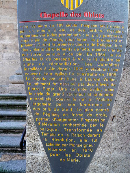 L'ancien couvent des Carmélites, aujourd'hui couvent des Oblats, se situe place Forbin, en haut du cours Mirabeau à Aix-en-Provence. Le couvent a été fondé en 1624 et une première chapelle construite en 1625 desservait la communauté. La chapelle actuelle a été édifiée de 1695 à 1701 d'après les plans de Thomas Veyrier, la façade étant réalisée par Laurent Vallon en 1697. Un décor peint du XVIIe siècle, attribué à Trophime Bigot, orne l'édifice. À la Révolution, les carmélites furent expulsées et la chapelle transformée en temple de la Raison ; en 1796 le couvent fut vendu comme bien national, l'autel baroque fut vendu et le mobilier dispersé. Au XIXe siècle, une partie des bâtiments fut occupée par les Missionnaires de Provence, appelés aussi Oblats de Marie-Immaculée. En 1816, saint Eugène de Mazenod acquit l'ancien couvent et sa chapelle pour y établir une maison de formation destinée aux jeunes prêtres ; une statue de saint Eugène de Mazenod se trouve à l'intérieur de la chapelle. L'édifice a été classé au titre des monuments historiques en 1911. La maison appartient toujours à la congrégation des Oblats et, depuis octobre 2012, elle dépend directement du supérieur général ; elle accueille le Centre international Eugène-de-Mazenod (CIEM), foyer pour étudiants et maison de sessions pour les oblats du monde entier. La chapelle a fait l'objet d'une rénovation en 2014. Elle est desservie par quatre prêtres oblats et un frère oblat de nationalités différentes. La messe est célébrée en semaine à sept heures, et les dimanches et fêtes à neuf et onze heures ; le sacrement de réconciliation est proposé les mardis, jeudis et samedis de 10 h à 12 h et de 16 h à 18 h. En juillet et août, une messe en anglais est célébrée le dimanche à 11 heures, spécialement pour les touristes. La chapelle accueille également régulièrement des expositions d'art et des concerts. D'architecture classique, elle présente une coupole elliptique de style proche de celui de Pierre Puget qui couvre une nef en croix latine sans collatéraux, accentuant l'effet de hauteur. L'édifice, largement éclairé par un lanterneau et quatre oculi, repose sur des pilastres composites au décor original. Deux bas‑reliefs de Thomas Veyrier, qui ornaient initialement le maître-autel, sont aujourd'hui déposés au musée des Tapisseries.