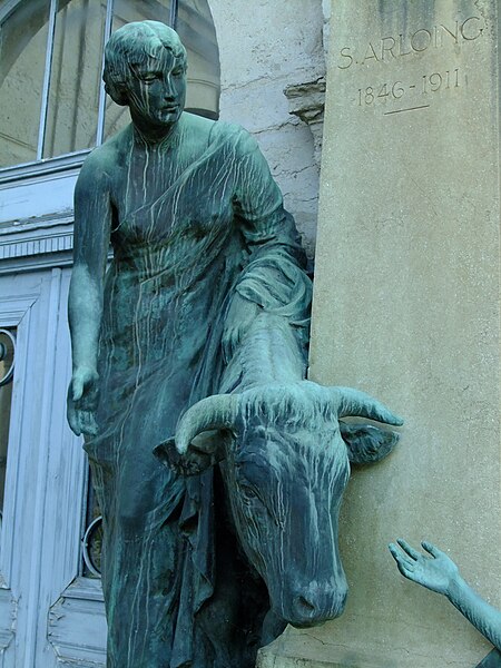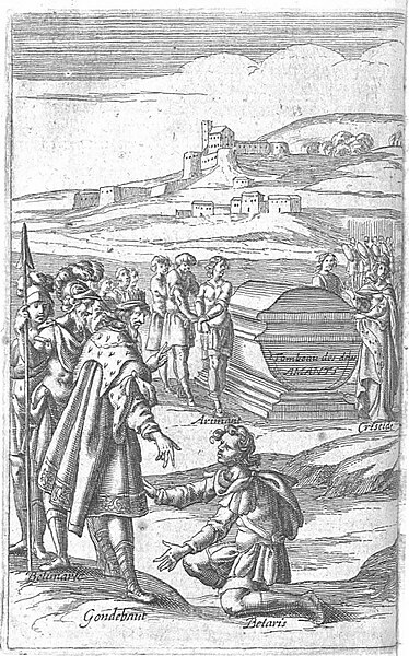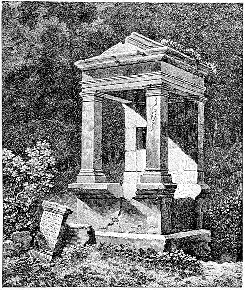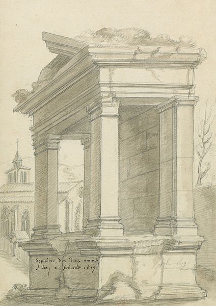 Sur l'origine du tombeau des Deux‑Amants, Jean‑Baptiste Monfalcon recense plusieurs hypothèses anciennes : monument funéraire attribué à Hérode Antipas et Hérodiade selon Guillaume Paradin, monument élevé à la mémoire de deux prêtres nommés Amandus selon Claude‑François Ménestrier, ou tombeau d'un frère et d'une sœur portant le nom d'Amandus selon Claude Brossette ; Jacob Spon rapporte que l'on pouvait lire les noms Amandus et Amanda, mais sa démolition en 1707 n'a apporté aucun élément décisif.