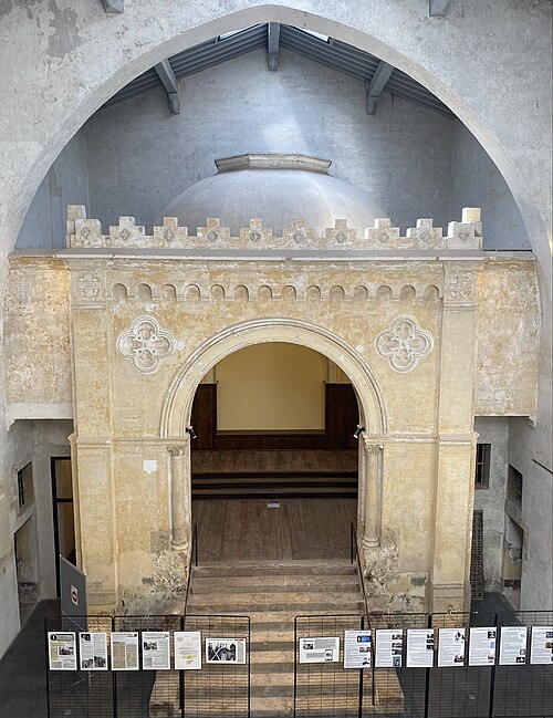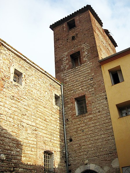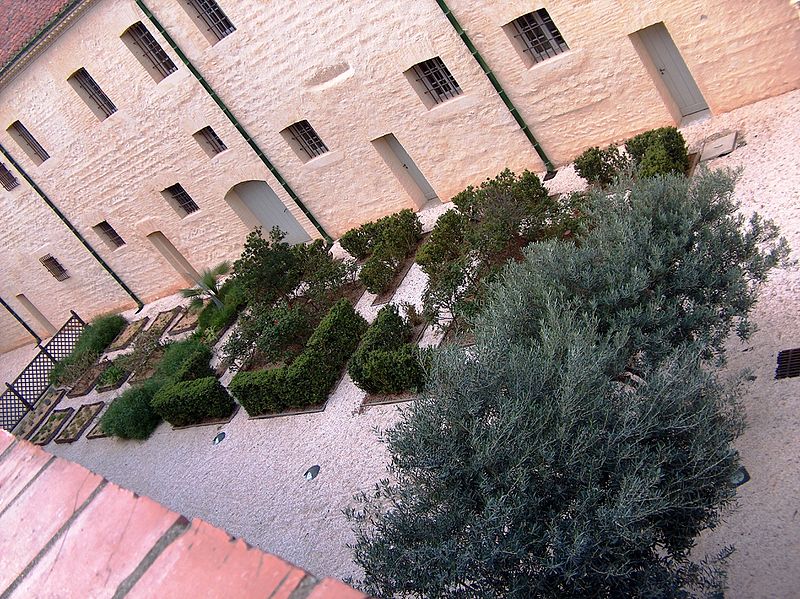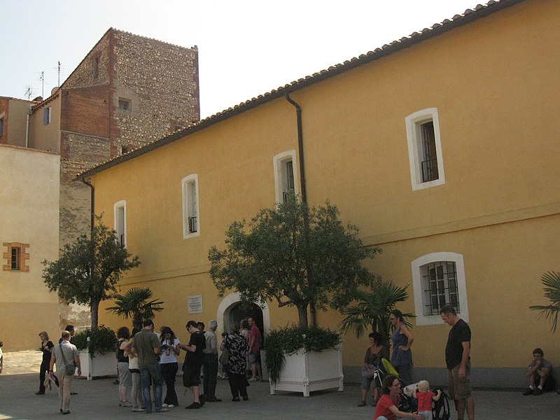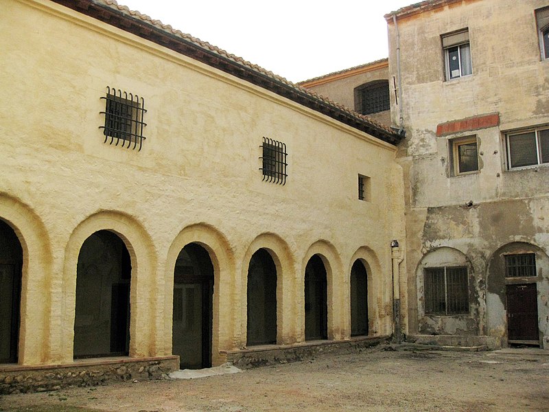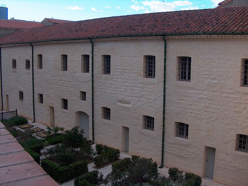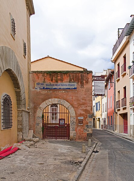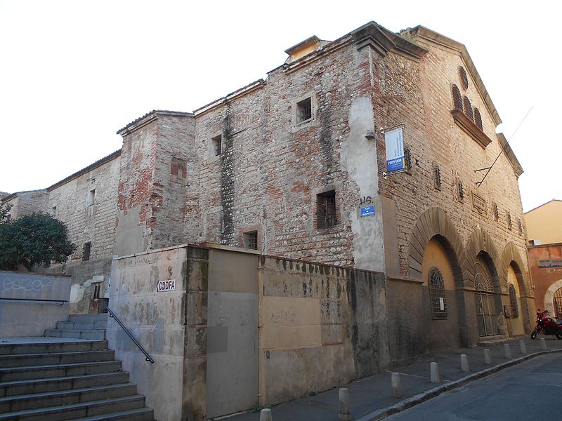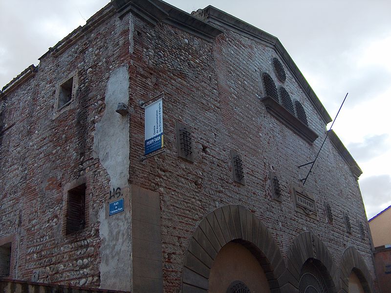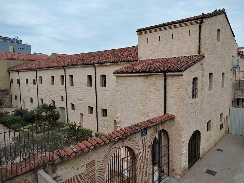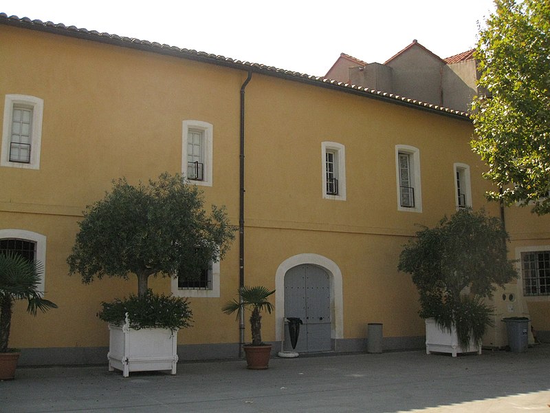 L’ancien couvent des Minimes, situé à Perpignan sur le flanc du Puig Sant Jaume dans l’ancien quartier juif près des remparts, est un édifice classé au titre des monuments historiques. Dédié à Sainte-Marie de la Victoire, il fut fondé à partir de 1573 par Pierre de Valdès grâce à des donations royales et privées et construit essentiellement en brique à partir de 1575. L’église, achevée dix ans après le début des travaux, présente une nef unique de cinq travées bordée de chapelles latérales et se termine par un chœur à sept pans. La nef est couverte d’une toiture charpentée portée par des arcs doubleaux diaphragmes tandis que le chœur est voûté sur nervures rayonnant à partir de la clé, qui porte un relief représentant la Vierge vêtue de la bure des Minimes. De petits passages relient les chapelles latérales, elles-mêmes couvertes de voûtes en croisée d’ogives. La façade sud-ouest s’ouvre par une porte en arc plein cintre montée dans un appareil de marbre blanc ; les fenêtres en arc brisé du chœur et les oculi de la nef sont aujourd’hui murés. Le cloître, commencé vers 1617, se développe au sud-est de l’église autour d’une cour quadrangulaire pavée sous laquelle se trouve une importante citerne dont l’aménagement est mentionné en 1638. Les quatre corps de bâtiment qui entourent la cour sont en brique ; deux galeries superposées ouvraient autrefois sur la cour par une suite d’arcs en plein cintre organisée par travée : un grand arc au rez-de-chaussée et deux petits arcs jumelés au premier étage. Les galeries du rez-de-chaussée sont couvertes de voûtes en pénétration, celles du premier étage sont charpentées, et les arcades ont été murées ou transformées en fenêtres depuis la Révolution. Certaines travées du rez-de-chaussée sont ornées de peintures murales disposées dans les lunettes des voûtes et accompagnées d’inscriptions ; ces peintures semblent illustrer la vie de saint François de Paule, de saint Antoine de Padoue et l’histoire de l’ordre des Minimes, et les portes d’accès aux galeries présentent un décor sculpté. Après le départ des pères Minimes à la Révolution, en 1791 l’administration militaire affecta les lieux aux offices de la Manutention et de l’Intendance ; les bâtiments furent ensuite transformés en caserne par l’armée jusqu’au XXe siècle, quand la ville de Perpignan en fit l’acquisition. Malgré ces différentes affectations, l’ensemble est aujourd’hui pratiquement intact et accueille de nombreuses expositions annuelles, ainsi que le festival de photojournalisme Visa pour l’Image en septembre. Des sondages archéologiques menés en 1991 puis en 1997 lors de travaux dans la cour ont mis en évidence plusieurs niveaux de sol attribués à la fin du XVIe siècle, des potences de puisage autour du puits central et un remplissage rapide au-dessus de la citerne. Un troisième sondage a montré deux marches traduisant le rehaussement des niveaux de sol dans la galerie et la cour et a confirmé un décaissement général du substrat à environ quatre mètres des murs de la galerie. Le mobilier recueilli est essentiellement composé de céramiques fragmentées — tessons de coupes vernissées brunes et assiettes en faïence — issues du comblement de la fosse d’implantation de la citerne, ce qui suggère l’usage de vaisselle commune. L’étude des fouilles confirme l’existence et l’organisation de la citerne sous la cour et son lien étroit avec la structure du cloître.