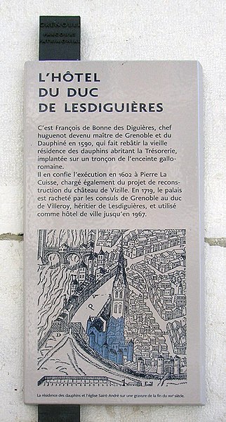L’ancien hôtel de Lesdiguières occupe à Grenoble un site qui reprend la Tour de la Trésorerie, dont les fondations s’appuient sur l’enceinte romaine et qui dépendait du palais delphinal. En 1602, François de Bonne, lieutenant-général du Dauphiné et futur duc de Lesdiguières, commande à l’architecte Pierre La Cuisse la construction de son hôtel particulier; les travaux se poursuivent jusqu’à vers 1650 et un jardin est aménagé à proximité. La base de la tour intégrée à l’édifice remonte à l’époque gallo-romaine et la demeure demeure propriété des descendants de Lesdiguières qui l’agrandissent, notamment par l’aile Créqui au xviie siècle, puis la partagent avec les intendants du Dauphiné à partir de 1683. La ville acquiert l’ensemble en 1719; l’édifice abrite dès lors conjointement les administrations municipales et préfectorales et sert d’hôtel de ville jusqu’en 1967. Au xixe siècle la préfecture occupe plusieurs salons et conserve des services annexes jusqu’à son transfert sur la place d’Armes en 1866; à partir de 1867 divers services communaux sont regroupés dans l’ancien hôtel de préfecture. Après 1967 l’édifice accueille successivement le procureur de la République, puis, à partir de 1970, le musée Stendhal et, en 1971, une bibliothèque de quartier; le musée ferme en 2004 et la Maison de l’International s’y installe en 2006, complétée en 2013 par un American Corner. L’ancien ensemble fait l’objet d’une inscription au titre des monuments historiques le 15 novembre 2021.