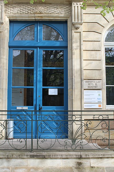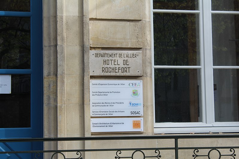 L'ancien hôtel de Rochefort est un hôtel particulier situé à Moulins (Allier), en région Auvergne-Rhône-Alpes. Le bâtiment présente deux façades contrastées. La façade sud, rectiligne, s'élève sur deux étages et comporte sept ouvertures par niveau. Les baies du rez-de-chaussée s'ouvrent sous des arcs en plein cintre, à l'exception d'une porte-fenêtre qui donne sur un balcon de pierre bordé d'une balustrade en fer forgé. Aux extrémités du rez-de-chaussée se trouvent également des portes-fenêtres précédées d'un perron en pierre accessible par un escalier, et chaque fenêtre possède un balcon en fer forgé. La façade nord s'ouvre sur une cour d'entrée fermée par un mur de clôture reliant les façades des ailes en retour. L'ensemble des constructions sur cour et le mur de clôture sont en briques rouges et noires, ornés d'un décor losangé décliné en quatre variétés. L'hôtel a été construit dans la seconde moitié du XVIIIe siècle pour Antoine Grimaud, lieutenant général du roi en la sénéchaussée de Bourbonnais, vraisemblablement par l'architecte Joseph Evezard. Acquis aux enchères en 1835 par Frédéric de Chabannes La Palice, marquis de Curton, il passa ensuite à sa fille Octavie, épouse du baron Émile de Rochefort, qui a donné son nom à l'hôtel. Vendu en 1951 par sa petite-fille, la comtesse Louis de Diesbach, au département de l'Allier, il abrite actuellement le comité d'expansion économique du département. Les façades et les toitures sont inscrites au titre des monuments historiques par arrêté du 6 février 1965. Des notices et illustrations sont accessibles, notamment sur Wikimedia Commons et dans la base Mérimée, ainsi que via les portails consacrés aux monuments historiques français et au patrimoine de l'Allier et du Bourbonnais.