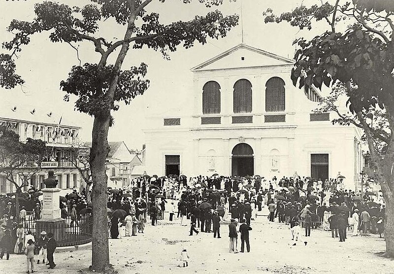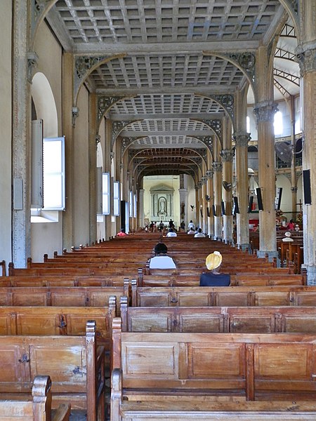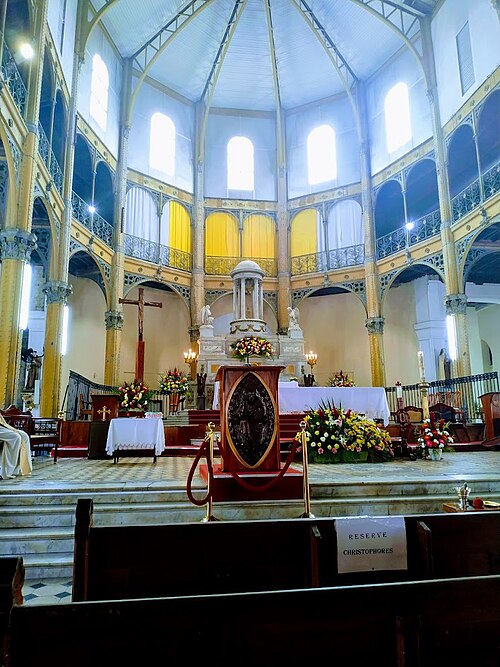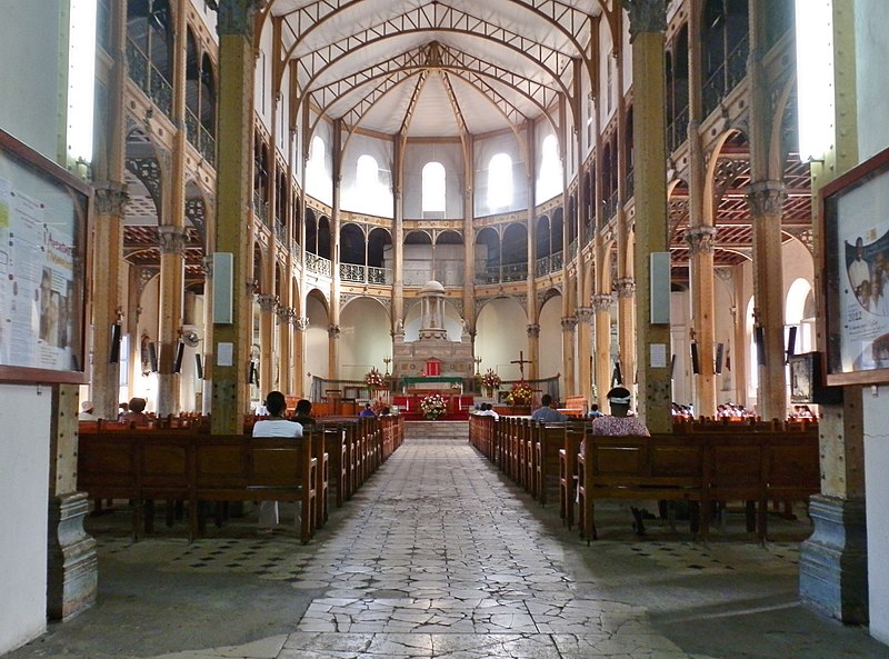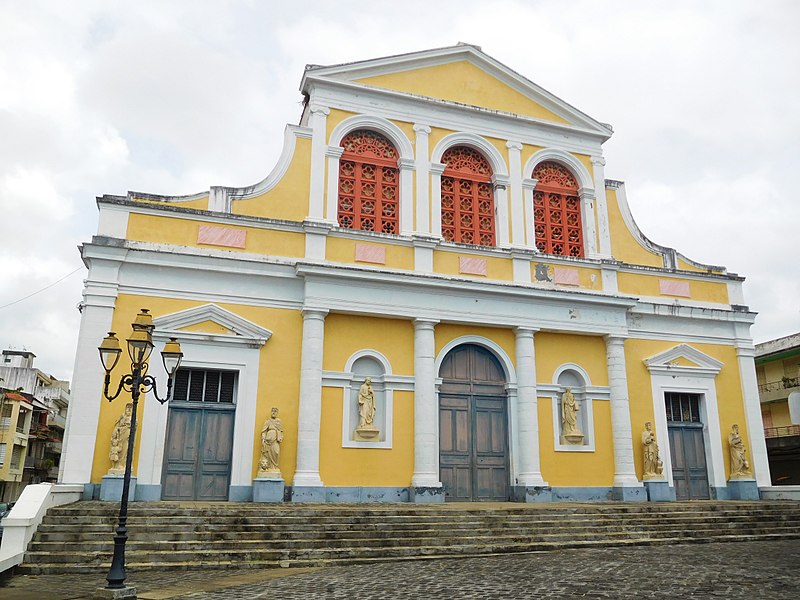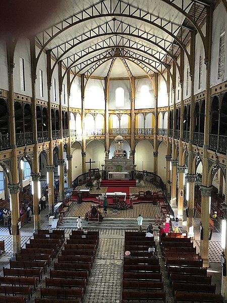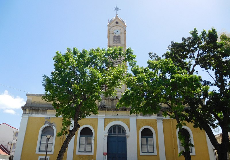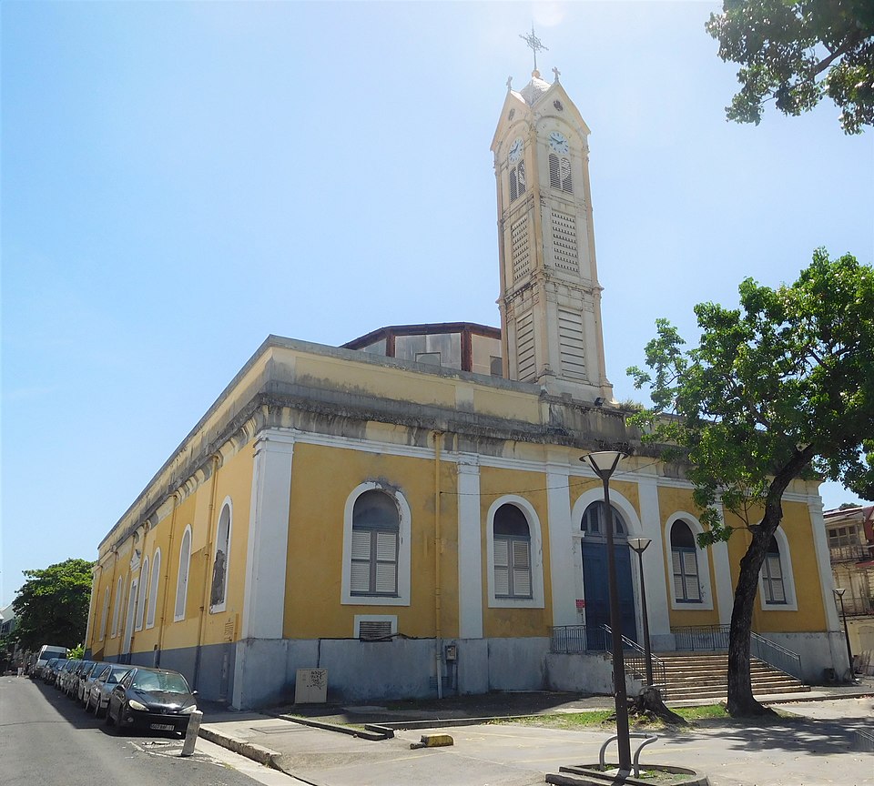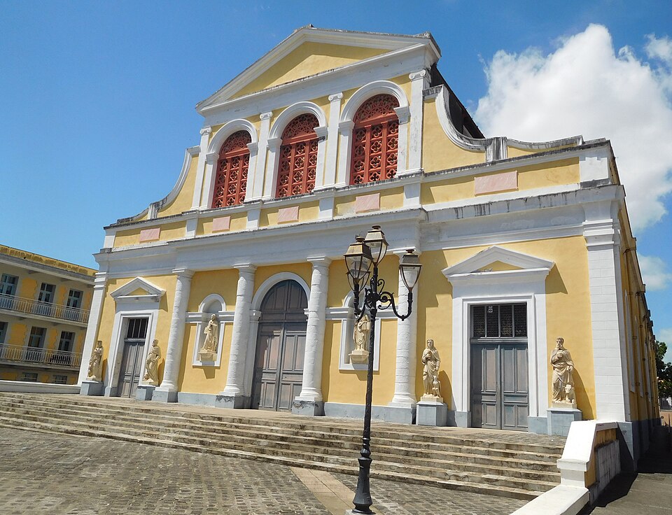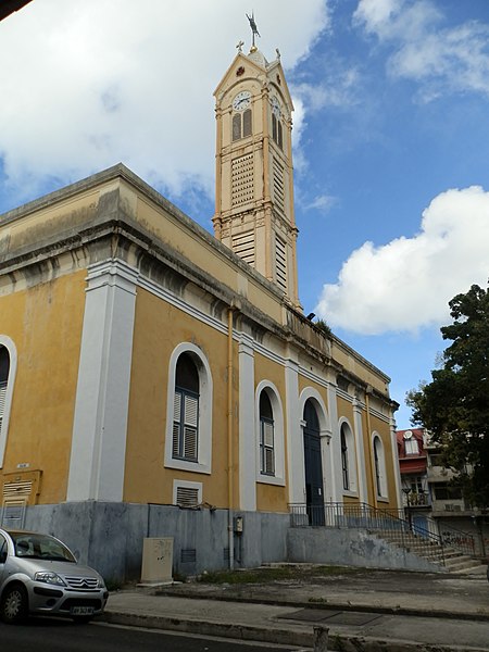 L'église Saint-Pierre-et-Saint-Paul, située place Gourbeyre à Pointe-à-Pitre en Guadeloupe, est l'édifice paroissial localement appelé « cathédrale » sans avoir été consacrée comme telle. Classée monument historique en 1978, elle a été retenue en 2021 comme site prioritaire par le Loto du patrimoine. La reconstruction d'une nouvelle église débute le 22 septembre 1807 après la destruction de l'ancienne en 1794 ; les travaux sont interrompus en 1810 puis repris sur des plans de l'architecte Nassau, la réception ayant lieu le 1er décembre 1817. Le tremblement de terre de 1843 endommage profondément l'édifice ; les reconstructions dirigées par Alexandre Petit et l'inspecteur Auguste de Prémonville s'étendent de 1847 à 1853. En 1865, la toiture menaçant de s'effondrer conduit à une restructuration confiée à Charles Trouillé, qui propose une charpente métallique exécutée par la maison Joly d'Argenteuil ; ces travaux, achevés en 1876, comprennent également la construction du clocher métallique par la même maison. Entre la fin du XIXe siècle et la seconde moitié du XXe siècle, plusieurs tremblements de terre et cyclones (1897, 1928, 1956, 1966) compromettent à plusieurs reprises la stabilité du bâtiment et entraînent des fermetures temporaires. D'importants travaux de restauration, notamment sur les parties métalliques assurant la stabilité de l'ossature, sont en cours depuis plus de vingt-cinq ans. En 2019, une commission de sécurité recommande la fermeture de l'édifice en raison du retard des travaux de mise en conformité incendie demandés depuis 2012 ; la première tranche, financée par l'État et la région à hauteur de 600 000 euros, a permis de réparer la toiture et de renouveler l'installation électrique, rendant possible la réouverture en août 2020. Sur le plan architectural, la façade s'inspire de la Renaissance italienne : elle est rythmée par colonnes, pilastres et arcs en plein cintre, comprend trois portes donnant accès à la nef centrale et aux bas-côtés, et de hautes fenêtres éclairent la tribune et l'orgue. La façade a été ornée de statues, dont les apôtres Pierre et Paul commandés en 1878 à un statuaire nantais, et de quatre évangélistes déplacés au niveau du parvis après les dégâts de 1897. La structure métallique interne, prévue par Trouillé et réalisée par la maison Joly, repose sur des piliers en fonte ornés de chapiteaux qui supportent une ossature indépendante de la maçonnerie ; les fermes cintrées de la toiture sont apparentes et la voûte de la nef centrale était à l'origine ornée d'un décor en plâtre néogothique. Le clocher, entièrement métallique, s'élève au-dessus du chevet plat, mesure 35 mètres et contient trois cloches, dont deux livrées en 1880 ; ses angles sont soulignés par des piliers décorés de motifs floraux. L'orgue, placé sur la tribune, a connu plusieurs incarnations : construit par Cavaillé-Coll en 1856, relevé et augmenté par Henri Didier en 1888, détruit par le cyclone de 1928, remplacé par un instrument de Frédéric Haerpfer inauguré en 1934, réparé en 1953 par la maison Roethinger, puis remplacé en 1981 par un orgue à traction mécanique des établissements Laval-Thivolle. Le maître-autel, commandé au marbrier Bellami à Carrare et daté de 1872, est en blocs de marbre polychrome à gradins ; la table porte un bas-relief de la Cène, le tabernacle est encadré d'angelots et l'ensemble est surmonté d'un édicule circulaire soutenu par six colonnes. Les chapelles de la Vierge et de saint Joseph, offertes et réalisées par Bellami dans les années 1870, présentent des tables d'autel et des retables en marbre décorés de colonnes, pilastres et motifs floraux ; la statue de la Vierge en marbre blanc date de 1873 et la statue de saint Joseph est également en marbre blanc. Les fonts baptismaux, en marbre blanc ovale creusé dans un bloc carré et ornés de colonnes et de motifs floraux, ont été déplacés de la chapelle de saint Joseph vers l'entrée de la nef conformément aux prescriptions liturgiques. Le bénitier, livré par Bellami lors des rénovations de 1867–1876, est en marbre blanc ; sa vasque repose sur une colonne cannelée et présente des guirlandes et une base ornée de feuilles d'acanthe. Les autels et bas-côtés accueillent plusieurs statues en plâtre polychrome, dont le Sacré-Cœur, saint Michel, saint Antoine et sainte Thérèse, bien que certains décors anciens aient disparu à la suite des séismes et du cyclone de 1928. L'ostensoir solaire en argent, daté de 1821 et réalisé par l'orfèvre Antoine-Louis Joseph Loque, a été offert en 1826 par un membre de la famille Picou, qui donna également le terrain du presbytère ; il est orné d'angelots et d'un Agneau mystique sur sa base. La collection de paramentique est importante et variée, comprenant notamment une chasuble en soie noire brodée, des ornements dorés, une dalmatique en soie dorée et une pente de dais à décor floral sur fond d'or.