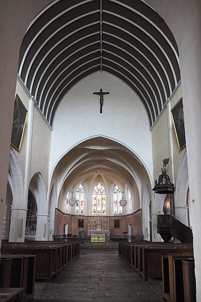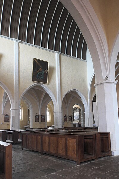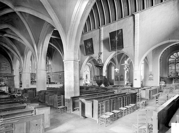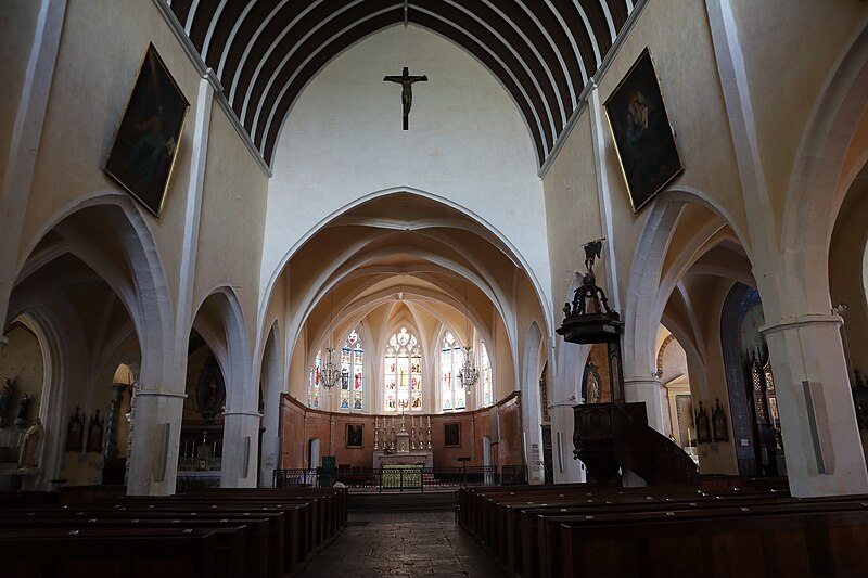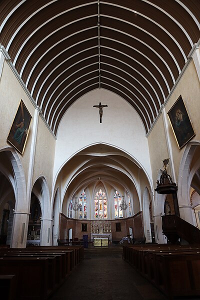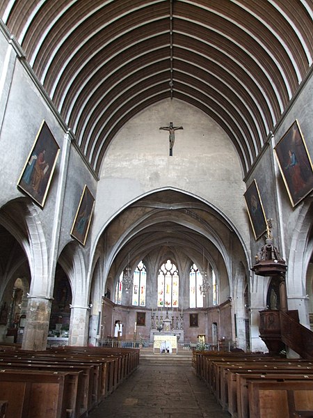 L'église compte dix chapelles et renferme de nombreuses œuvres d'art, parmi lesquelles deux statues du XVIe siècle représentant saint Jean‑Baptiste et saint Michel, un groupe sculpté du XVIe siècle représentant la Vierge de Pitié, six bougeoirs et une croix d'autel datés de 1860, ainsi que des peintures des XVIe et XVIIe siècles illustrant l'Adoration des Mages, l'Adoration des bergers, Sainte Marie auxiliatrice, la Dormition de la Vierge, un donateur et une donatrice, et le Martyre de saint Laurent. On y trouve également un monument aux morts de 1924 signé Paul Cappelare et des peintures murales de la fin du XIXe siècle représentant la Vierge et saint Joseph. La chapelle des défunts, fondée par la famille Merlan, présente un remarquable plafond Renaissance bourguignon composé de petits caissons ornés de figurines, d'écussons et de sujets mythologiques. La voûte en bois du XIXe siècle a la forme d'une coque de bateau renversée. Lors du début du chantier de restauration, quatre sarcophages d'époque mérovingienne furent découverts. L'église Saint‑Laurent est classée au titre des monuments historiques depuis 1875.