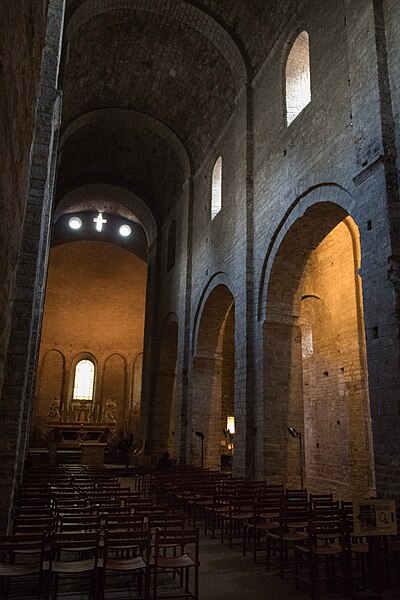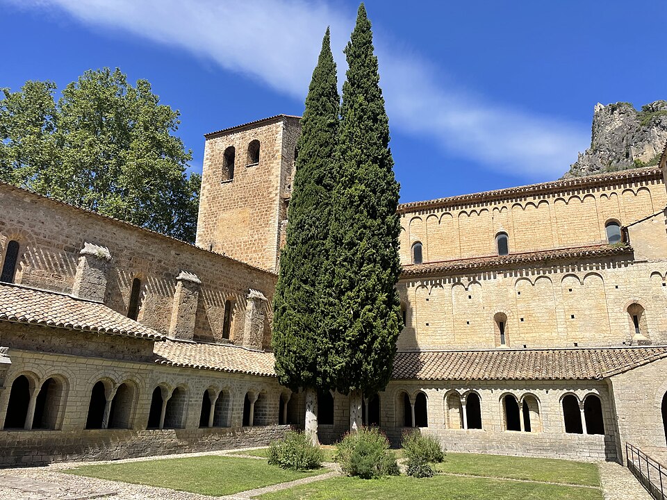 Le réfectoire, qui ferme le côté ouest du quadrilatère cloîtral au sud de l'église, se présente comme une vaste salle de cinq travées voûtées d'arêtes datant du XVIIe siècle, chacune éclairée par une longue baie en plein cintre ; à l'origine ces travées étaient couvertes d'une charpente. La salle capitulaire, bâtiment rectangulaire à étage fermant le cloître à l'est, conserve une façade ouest essentiellement médiévale dont le niveau inférieur intègre des baies et des arcades murées provenant de la galerie orientale du cloître. Parmi les structures préromanes subsistent la tour Saint-Martin accolée à l'angle sud-ouest de l'église, les murs de la première travée de la nef et la crypte ; les galeries basses nord et ouest du cloître renvoient aussi au XIe siècle, tandis que des traces d'une galerie haute gothique apparaissent dans le mur est de la salle capitulaire.
