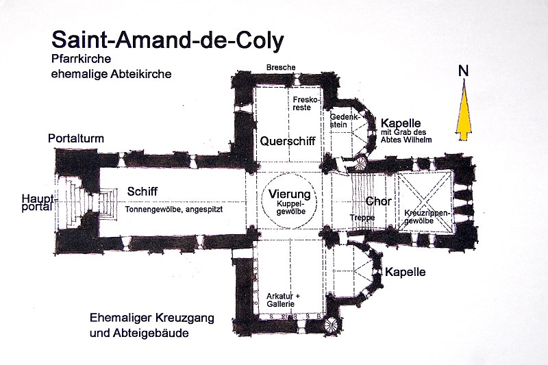 L’ancienne abbaye de Saint-Amand-de-Coly, située sur la commune éponyme en Dordogne, ne conserve aujourd’hui que l’église abbatiale entourée des vestiges d’une enceinte fortifiée. À l’origine, un simple ermitage aurait été établi par Armand, chevalier d’origine limousine, et la tradition hagiographique relate aussi l’installation, au VIe siècle sur le domaine de Genuliacus (Genouillac, aujourd’hui Terrasson), du moine Sorus (Saint Sore) et de ses disciples Amand et Cyprien. Selon ces récits, le roi Gontran accorda ensuite des biens pour fonder une communauté chrétienne consacrée au martyr Julien de Brioude, et une communauté monastique s’y développa progressivement. Aux VIIIe et IXe siècles cette communauté multiplia la fondation d’édifices religieux alentour, mais l’ensemble subit des destructions lors des incursions normandes en 857. Le renouveau semble lié à l’intervention d’Odon, abbé de Cluny, qui au Xe siècle obtint la protection de l’abbaye face aux seigneurs locaux. Le plus ancien document connu citant Saint-Amand apparaît dans un rotulus de l’abbé Oliba en 1046, attestant l’existence de l’abbaye et son lien avec Saint-Sore à Genouillac. Sous l’influence de l’abbaye de Saint-Martial de Limoges, la réforme clunisienne fut imposée à Saint-Sore en 1101; certains religieux refusant cette mainmise adoptèrent la règle des chanoines augustins et s’installèrent à Saint-Amand, dont la fondation augustinienne remonte au début du XIIe siècle. L’église abbatiale, en partie élevée à cette époque, connaît au XIIe siècle une période de prospérité et étend son influence aux siècles suivants. Les murs de l’église et du couvent furent entourés de remparts, agrémentés de tours carrées, d’escaliers étroits, d’archères et de consoles de mâchicoulis, conférant à l’ensemble le surnom de « fort Saint-Amand ». Au cours de la guerre de Cent Ans et des conflits du XIVe et XVe siècles, l’abbaye subit destructions et dépeuplement; après une première destruction, peut‑être liée aux Anglais, elle est restaurée au XVe siècle et connaît une reconstruction partielle soutenue par Jean de Bretagne jusqu’au début du XVIe siècle. Les guerres de Religion l’atteignent à nouveau : occupée en 1575 par des troupes protestantes, elle est bombardée puis défendue et sommairement restaurée à la fin du XVIe siècle. Au XVIIIe siècle, la communauté décline et Louis XV autorise la suppression de l’abbaye; ses biens sont vendus à la Révolution et le château abbatial de Coly est détruit, entraînant la perte des archives. Après la Révolution l’église devient paroissiale, mais elle tombe dans le ruineux avant qu’un premier mouvement de restauration ne s’engage au XIXe siècle sous l’impulsion de l’abbé Carrier et de la population locale. Classée dès 1886, l’abbatiale fait l’objet de multiples travaux de consolidation et de restauration réalisés au tournant des XIXe et XXe siècles par des architectes tels qu’Anatole de Baudot et Rapine, qui interviennent sur la charpente, les voûtes, les murs et les soutènements entre 1894 et les années 1930. Un toit de lauzes est posé en 1947 et des consolidations complémentaires sont menées en 1962; l’ensemble est classé monument historique en 1965.