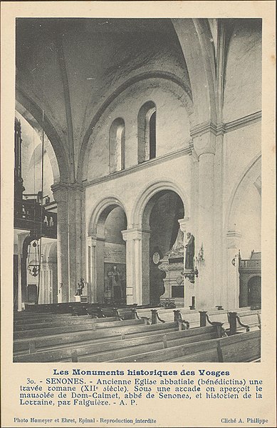 Fondée selon la tradition par Gondelbert vers 640, l’abbaye s’est implantée sur un lieu de culte préexistant et a été marquée par la présence de bénédictins jusqu’à la Révolution. Le premier document conservé la mentionne dans une charte d’immunité attribuée à Childéric II vers 661. Après des phases de déclin et de reprise du vieil établissement, la règle bénédictine fut réaffirmée au haut Moyen Âge, l’abbaye s’inspirant des réformes de Moyenmoutier pour relancer sa vie spirituelle et sa gestion. Elle s’enrichit ensuite, dut instituer une charge d’avoué pour protéger ses biens et contribua à la formation du village puis de la petite ville de Senones. Au XVIIIe siècle, sous l’abbatiat de Dom Calmet, l’abbaye connaît d’importantes reconstructions et atteint son apogée ; Dom Calmet réunit une riche bibliothèque et entretint une correspondance célèbre, notamment avec Voltaire. La ville devint, après 1751, capitale princière de la principauté de Salm-Salm.