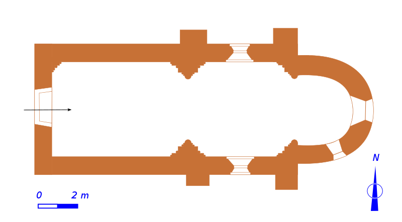 La chapelle présente un plan simple : une nef de deux travées terminée par une abside en cul‑de‑four ; ses dimensions intérieures sont indiquées à 17,2 × 3,15 m, hors‑œuvre 19 × 9 m. Les deux travées sont de longueur inégale (la travée occidentale mesure 8 m, la travée jouxtant le chœur 6 m et le chœur est profond de 3,20 m). Les murs ont une épaisseur d’environ un mètre, la façade étant plus mince ; les murs gouttereaux sont épaulés par deux contreforts par côté et un clocher‑peigne a peut‑être surmonté la façade, mais il a disparu. La partie orientale de la nef conserve des voûtes caractéristiques du gothique de l’Ouest, tandis que la travée occidentale a perdu les siennes ; cette travée était à l’origine éclairée par deux hautes baies (une par face), réduites avant le XIVe siècle puis entièrement murées, peut‑être après l’accident de 1756. Un arc brisé sépare la nef du chœur.
