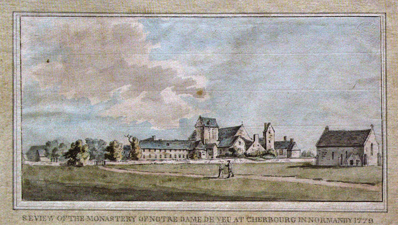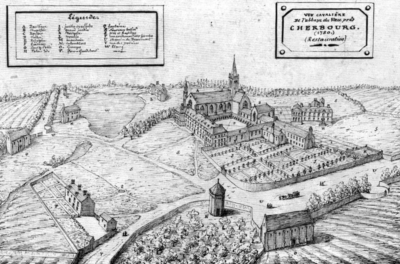 L'abbaye Notre-Dame du Vœu est un ancien monastère de chanoines réguliers augustins de Saint-Victor dont les vestiges se dressent à Cherbourg-en-Cotentin (Manche, Normandie). Elle aurait été fondée en 1145 par Mathilde l'Emperesse et consacrée en 1181. Une légende tardive associe la fondation au vœu de sauver Mathilde d'une tempête et à l'appellation de "Chantereyne", mais les sources contemporaines sont muettes sur ce récit. Les cuisines et le cellier datent de la fin du XIIe siècle ; le réfectoire et la salle capitulaire furent élevés au premier tiers du XIIIe siècle. L'abbaye connut une prospérité au XIIIe siècle, recevant dons et visites royales, mais elle fut pillée et incendiée à plusieurs reprises à la fin du XIIIe siècle et durant la guerre de Cent Ans. Les chanoines se réinstallèrent vers 1450-1460 et reconstruisirent l'église abbatiale en 1464. Elle subit de nouveaux dommages pendant les guerres de Religion et connut un net déclin après son placement sous le régime de la commende en 1583. Un grand bâtiment occidental fut élevé en 1727, mais l'abbaye fut supprimée par décret royal en 1774. Annexés au projet du port militaire, ses terrains furent réquisitionnés en 1778 et l'Hôtel d'Harcourt, construit à l'ouest, servit de résidence au duc d'Harcourt ; Louis XVI y séjourna lors d'une inspection des travaux de la rade. De 1793 à 1866, les bâtiments furent employés comme hôpital de la Marine ; la maison abbatiale fut détruite en 1839 et sa grande cheminée du XVIe siècle démontée pour être installée à la mairie. L'ensemble passa ensuite à la caserne Martin des Pallières puis fut vendu en 1928 et transformé en cité ouvrière dite Cité Chantereyne. Épargné par les bombardements, le site fut incendié en juin 1944 par les forces allemandes au moment de leur départ. La municipalité acquit les ruines en 1961 et engagea des travaux de consolidation et de restauration dès 1964 ; des campagnes plus importantes eurent lieu entre 1972 et 1986, puis des interventions archéologiques et de mise en valeur se sont poursuivies. Le portail occidental du XIIIe siècle fut redécouvert en 1892, remonté dans le jardin public et classé en 1909 ; les bâtiments conventuels firent l'objet d'un classement partiel en 1913 et l'ensemble des vestiges et sols de l'abbaye fut classé en 2002. Les fouilles ont notamment mis au jour en 1994 une plate-tombe en terre cuite datée de la fin du XIIIe siècle, classée en 1995 et exposée sur le site ; la grande cheminée sculptée du logis abbatial est conservée dans la salle du conseil de l'hôtel de ville. Des éléments mobiliers et sculptés, dont des statues d'albâtre, ont été déposés dans les églises locales. Aujourd'hui subsistent de l'époque médiévale la façade de l'église abbatiale, la salle capitulaire, des bâtiments conventuels et un logis isolé ; le logis de l'abbé fut reconstruit au XVIIIe siècle. L'église, à nef unique et chevet plat, mesure environ 40 mètres sur 14 ; elle comportait une tribune voûtée et s'éclairait par des baies à lancettes ; son portail ouest est visible dans le jardin public. La chapelle Saint-Hélier, reconstruite au XVe siècle, conserve notamment une vaste baie gothique, sa tour d'escalier et des assises de l'église du XIIe siècle. Le chauffoir et les cuisines, qui fermaient le cloître à l'est, sont voûtés en arêtes et divisés par une série de piliers ; le réfectoire du XIIIe siècle, élevé sur un cellier, se présente comme une haute salle de sept travées éclairée par des lancettes et dotée d'une tribune de pierre. La salle capitulaire, également gothique, est organisée en deux nefs de six travées et ouvre sur le cloître ; des traces d'arcades et d'arrachements subsistent sur le mur sud du cloître dont les galeries ont disparu. L'Hôtel d'Harcourt, édifié au XVIIIe siècle pour les chanoines puis transformé en résidence, est aujourd'hui en partie ruiné. Les vestiges témoignent d'une histoire longue et mouvementée, marquée par des phases de prospérité, de dommages répétés, d'occupations militaires et de réaffectations, et enfin par une restauration et une valorisation patrimoniale menées par la ville.