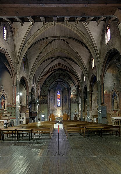 L'ancienne église des Carmes, dite aussi chapelle Notre‑Dame des Carmes, est située à Carcassonne (Aude, Occitanie). Édifice de style gothique languedocien, elle a été élevée par l'ordre des Carmes à partir de 1297 et rebâtie après l'incendie de 1355, les travaux de reconstruction s'étendant jusqu'en 1370. Des éléments sculptés datant de la fin du XIVe siècle subsistent dans la première travée de la nef. L'église présente une nef unique de six travées et un chœur polygonal. Le décor peint de l'ensemble de l'église et des chapelles, ainsi que la mise en place des autels et des statues, s'est déroulé entre 1851 et 1877 ; l'édifice a été peint au XIXe siècle par Joseph Engalières. Le programme iconographique carmélitain célèbre les grandes figures de l'Ordre — Élie, Thérèse d'Avila, Jean de la Croix — et l'arc triomphal du chœur est orné de personnages de Carmes et de Carmélites, peints en pied ou en médaillon. La chapelle du Saint‑Sacrement conserve un plafond peint et les vitraux figurent des scènes bibliques et des saints. Le clocher a été ajouté au XIXe siècle. Après la Révolution, l'église fut désaffectée et utilisée comme entrepôt ou tribunal, puis restaurée par la suite. Elle est attenante aux bâtiments du siège du diocèse de Carcassonne et Narbonne. L'édifice a été inscrit au titre des monuments historiques en 2014 ; des campagnes de restauration ont été conduites et la reprise des travaux de consolidation est prévue en 2025, après la clôture d'un contentieux entre l'évêché et la municipalité. L'intérieur comprend l'autel principal et plusieurs chapelles, dont celle du Saint‑Sacrement, ainsi que des statues comme l'Immaculée Conception et une sculpture sur le porche ogival ; le toit de l'église est visible depuis la tour Saint‑Vincent.
