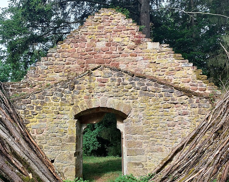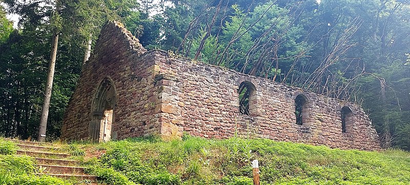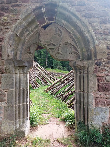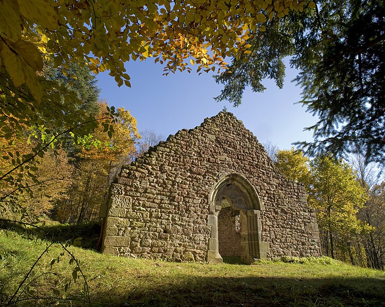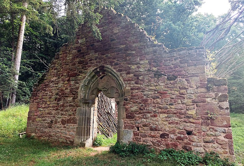 La Heidenkirche, ancienne église en ruine, se dresse sur un promontoire rocheux de la commune de Butten, en Alsace, au pied du Katzenkopf, dans la forêt communale et à l’écart des habitations. Aujourd’hui isolé, le site desservait autrefois le village disparu de Birsbach et se trouvait relié, jusqu’au XVIIIe siècle, à des chemins très fréquentés menant à Diemeringen, Soucht et Bitche. Un document de 1361 atteste que Birsbach accède au statut de paroisse, et l’essentiel de l’édifice tel qu’on le connaît date du XIVe siècle; un massif oriental est ajouté ultérieurement et la nef est voûtée dans la seconde moitié du XVe siècle. Le village se vide à la fin du XVe siècle, mais l’église, dédiée à l’apôtre Saint-Mathieu, conserve un rôle de pèlerinage jusqu’à l’introduction de la Réforme vers 1570, qui met fin à son usage régulier; des monnaies et des tessons des XVIe et XVIIe siècles montrent toutefois une fréquentation occasionnelle après cet abandon. Paul Amiet fouille et photographie les vestiges en 1911, mais l’arrêt du chantier expose les restes aux intempéries et aux pilleurs et entraîne la disparition de nombreux éléments sculptés. Des travaux de reconstruction entrepris dans les années 1950 par le curé de Lorentzen sont réalisés sans respect des vestiges et entraînent de nouvelles destructions. Les vestiges médiévaux, principalement le mur-pignon, ont été inscrits au titre des monuments historiques le 5 septembre 1996, et un projet de mise en valeur lancé en 1998 a conduit à des consolidations et à deux campagnes de fouilles en 1999 et 2001. L’église repose sur une butte naturelle dont le socle de grès du Buntsandstein est atteint par des fondations soignées, engagées jusqu’au rocher à environ 1,60 m et mises en œuvre avec peu de mortier, sans doute pour faciliter le drainage des eaux de ruissellement. Le chevet médiéval, connu par les fouilles et les photographies d’Amiet, formait un rectangle voûté, doté de contreforts orientaux et de nervures d’ogives; Amiet note aussi une base monolithe d’autel et un linteau prétendument du XIIe siècle au droit d’une porte sud, constatations qui ont disparu et ne peuvent plus être vérifiées. Les campagnes récentes ont mis au jour deux chœurs médiévaux successifs : un premier chevet irrégulier, probablement contemporain du portail occidental du XIVe siècle, puis un chevet régulier lié à la mise en place des voûtes au XVe siècle; ces remaniements ont coupé des tombes d’un cimetière comportant trois niveaux d’inhumations, la plupart d’enfants et d’adolescents enterrés en pleine terre sans cercueil. La nef médiévale a en grande partie été détruite par les travaux des années 1950, qui ont notamment fait disparaître le dallage d’origine dont quelques dalles subsistent seulement à l’extrémité nord-ouest mises au jour en 2001; des fondations subsistent toutefois et le tracé médiéval est encore reconnaissable malgré des réutilisations. La façade occidentale constitue le principal vestige visible : la partie authentique est limitée à la hauteur du portail gothique du XIVe siècle, aux piédroits ornés de trois colonnettes à chapiteaux tronconiques et à un tympan monolithique à trilobes, tandis que le pignon élevé en 1955 est en grande partie moderne. L’église était entourée d’un mur d’enceinte postérieur à sa construction, conservé sur moins d’un mètre d’élévation et d’environ 0,85 m d’épaisseur; les fouilles de 1999 ont montré que sa fonction principale était la stabilisation du terrain et la limitation de la pression de la pente sur les fondations, plutôt qu’une protection défensive. Seul vestige du village de Birsbach, la Heidenkirche illustre les transformations et les ruptures subies par de nombreuses églises rurales, et le site a fait l’objet d’interventions archéologiques et de travaux de consolidation pour en préserver les restes.