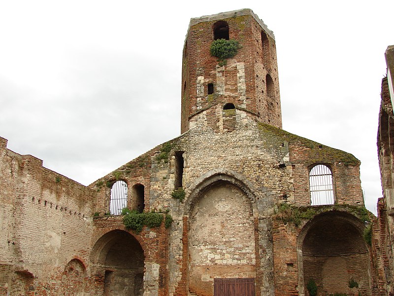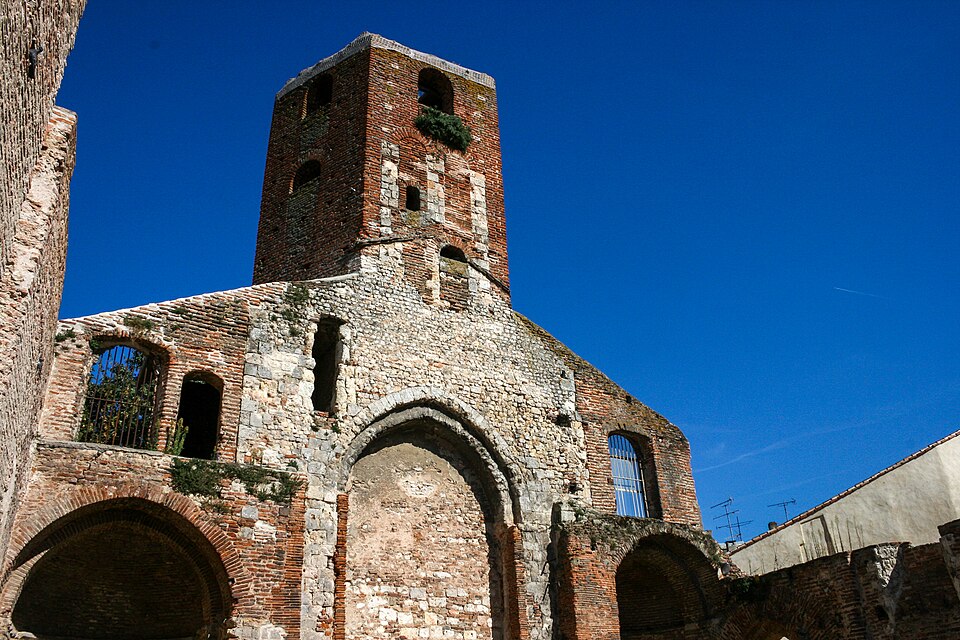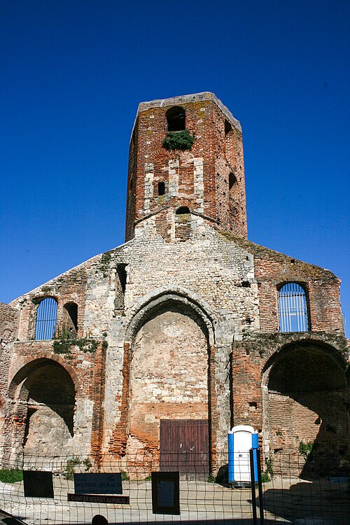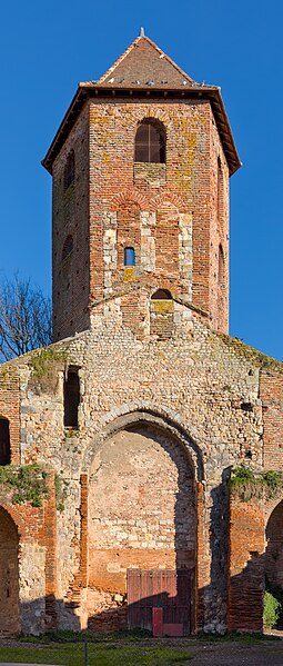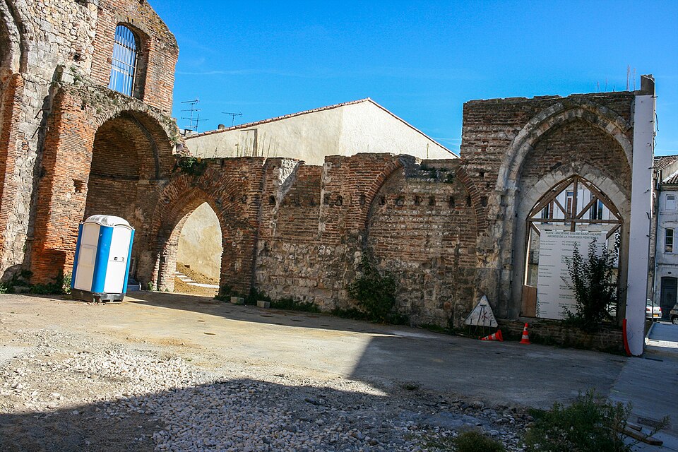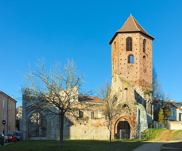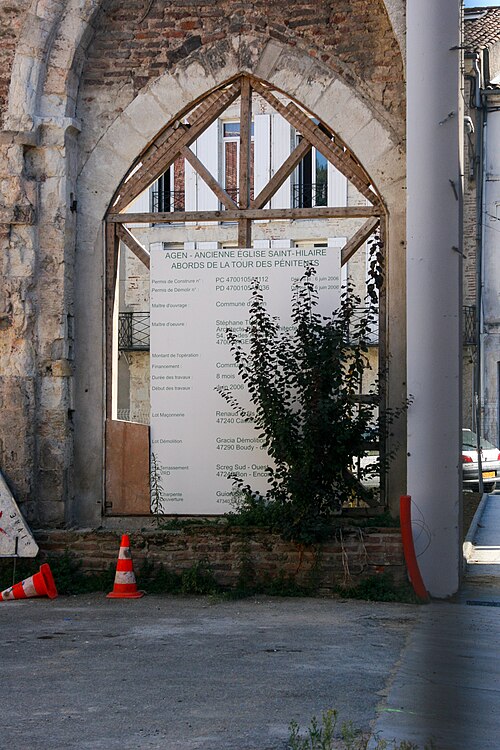 Situées rue Georges-Thomas à Agen (Lot-et-Garonne), les ruines de l'ancienne église Saint‑Hilaire, dite aussi Tour des pénitents blancs, forment un bâtiment d'origine romane dont certaines parties semblent remonter au XIe siècle. Les vestiges montrent plusieurs états : on relève des éléments d'un vaisseau presque carré à trois nefs terminé par trois absides, tandis que d'autres observations décrivent une origine à nef unique prolongée par un chœur plus étroit, l'ensemble datant au plus tôt du XIe ou de la première moitié du XIIe siècle. L'abside principale, en hémicycle, est la seule abside conservée ; elle était précédée d'une travée de chœur voûtée en berceau plein cintre et ornée d'une arcature extradossée de cinq arcades sur colonnes. Au début du XIIIe siècle, l'église fut agrandie par l'ajout de deux collatéraux et de deux absidioles voûtées en cul‑de‑four ; les murs des collatéraux furent élevés pour permettre un toit unique sur l'ensemble. Le clocher primitif, un clocher‑mur en pierre surmontant le pignon séparant nef et abside, fut ensuite intégré à une tour hexagonale en brique qui constitue le clocher gothique : le rez‑de‑chaussée, quasiment accolé au mur d'enceinte, est bâti en grand appareil, les contreforts plats sont réunis par des arcatures de quatre arcs en encorbellement, et la tour hexagonale en briques date de la fin du XIVe siècle ou du XVe siècle. Un couvent des Cordeliers, installé près de la porte Saint‑Georges au XIVe siècle, fut saisi en 1790 ; une partie du couvent servit de caserne de gendarmerie de 1795 à 1840. Après 1790, l'église des Cordeliers accueillit l'assemblée électorale du département, puis fut utilisée comme écurie et magasin à fourrage. L'église paroissiale Saint‑Hilaire, trop petite et menaçant ruine, donna lieu à une pétition appuyée par les autorités locales et l'évêque, aboutissant au transfert de la paroisse dans l'ancienne église des Cordeliers en 1818. Le plan d'alignement d'Agen de 1861 entraîna la création d'une nouvelle rue et la destruction de la façade ouest ainsi que de la première travée de la nef, sur plus de six mètres ; le bâtiment servit alors d'entrepôt jusqu'à un incendie en 1913. La municipalité envisagea la vente du clocher en 1911. Les ruines de l'ancienne église Saint‑Hilaire ont été inscrites au titre des monuments historiques le 20 juin 1950. L'église contient des sépultures notables : Nicolas de Bastard y fut inhumé le 22 février 1722 devant l'autel de Saint‑Martin, et son fils Dominique de Bastard y fut enterré le 7 mars 1729 dans le caveau familial sous le même autel ; ce tombeau servit de lieu de sépulture pour les seigneurs de Saint‑Denis‑sur‑Garonne décédés à Agen.