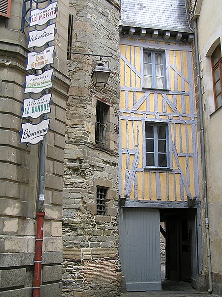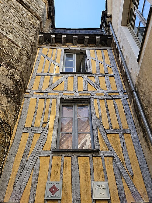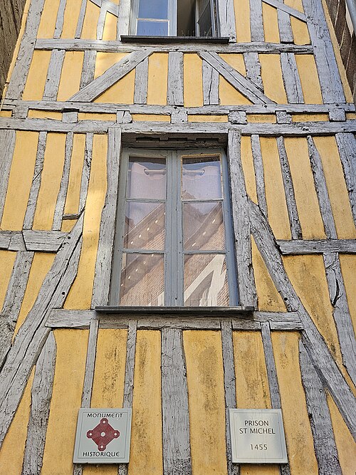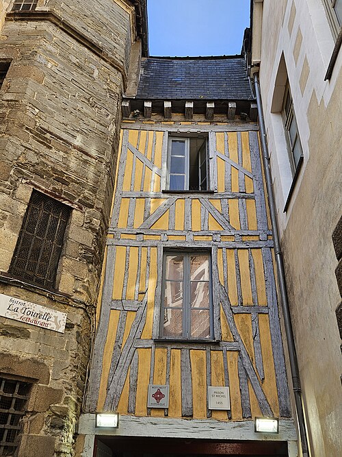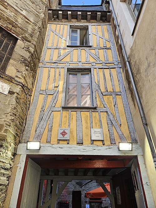 L'ancienne prison Saint-Michel, mentionnée pour la première fois en 1455, occupe l'emplacement d'un prieuré qui se trouvait sur le site du XIIe siècle à 1450. Elle a fonctionné comme lieu d'incarcération du milieu du XVe siècle jusqu'à la fin du XIXe siècle (les sources indiquent 1870 ou 1878 pour son arrêt) et fut ensuite réaffectée à des magasins et entrepôts. Le bâtiment se situe au fond de l'impasse Rallier du Baty, dans le centre de Rennes, au sein du secteur sauvegardé ; il repose d'un côté sur les anciens remparts et de l'autre sur les murs des maisons du Champ-Jacquet. Au cours de son histoire, il a porté plusieurs appellations : la Feillée, la Conciergerie, prison Marat pendant la Révolution, Grande-Prison, et plus couramment prison de la porte Saint-Michel, nom lié au prieuré et à la porte Saint-Michel. Édifiée vers 1450 sous le duc Pierre II de Bretagne, la prison conserve globalement la disposition médiévale de ses bâtiments tout en montrant des aménagements postérieurs, en particulier au XVIIIe siècle. Au XIXe siècle, et notamment entre 1802 et 1838, elle a servi de prison militaire ; sa fonction a encore évolué en 1840 à la suite de la construction d'une nouvelle maison d'arrêt, puis les services pénitentiaires y ont finalement été transférés en 1878 vers la Maison Centrale dite Saint-Hélier. Au XXe siècle, les lieux ont connu des usages civils : en 1937 un négociant en vin l'occupe, puis, à partir de 1965, les combles sont aménagés par le peintre Pierre Gilles pour accueillir l'Académie Libre de peinture et de gravure l'« Escabeau », activité dirigée par lui jusqu'en 1972 puis par Mariano Otero jusqu'à la cessation de l'atelier en 1976. En 2012 le bâtiment abritait plusieurs restaurants et bars de nuit, et il a été inscrit aux monuments historiques en juin 2014. L'ensemble s'organise sur deux niveaux autour d'une cour carrée centrale et son aspect a peu changé depuis le XVIIIe siècle. À la fin du XVIIIe siècle, l'entrée depuis la « rue de la prison » conduisait au rez-de-chaussée où se trouvaient les chambres des femmes prolongées par une petite cour, une cave, deux cachots, différentes cellules — certaines nommées « la Dorée », « la Portière » ou « la Quarrée » — et la cour des hommes. À l'étage se trouvaient la chambre des sœurs, les infirmeries, une chapelle, l'appartement et la chambre du concierge, des latrines et plusieurs cellules désignées « la Dorée », « la Brillante », « le Lansquenet » ou « la Quarrée ». Une tourelle polygonale contenant un escalier en vis occupe l'angle ouest de la cour, à gauche de l'entrée.