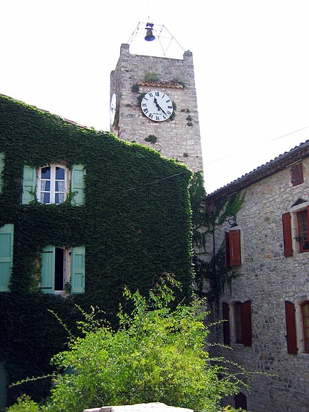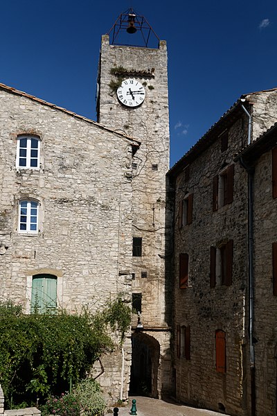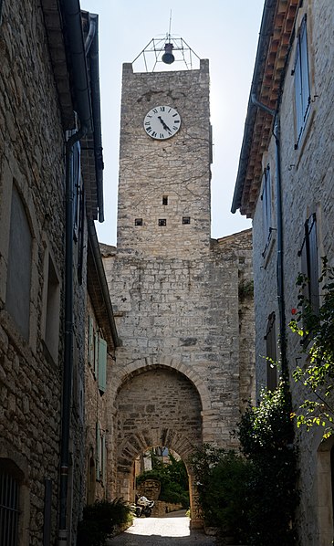 La porte fortifiée de Vézénobres se situe rue de l'Horloge, sur la commune de Vézénobres dans le Gard, et a été inscrite au titre des monuments historiques en 1964. Le village, bâti en amphithéâtre sur le flanc d'une colline dominant la vallée du Gard, a été fortifié de bonne heure ; la mention d'un castrum dès 1050 concerne les ruines de l'ancien château du plateau supérieur. Les vestiges conservés permettent de situer la fortification du village au moins aux XIIe–XIIIe siècles : certains éléments — tracé des arcs, disposition défensive et appareil à bossages — suggèrent une datation au XIIIe siècle (ou à la fin du XIIe siècle), tandis que d'autres observations placent la construction au début du XIIe siècle. L’organisation défensive comprenait plusieurs portes échelonnées du pied de la colline jusqu'au sommet, des rues comportant des parcours souterrains et des accès principaux défendus par des portes. La porte protégée ici pourrait être celle dite de Bitarne ; on rencontre aussi, dans les sources locales, l’appellation porte de Sabran pour la porte de ville qui commandait la route d’Uzès et qui est la seule des cinq portes médiévales des remparts à avoir subsisté. L’ouvrage s’ouvre côté campagne par un arc extérieur en plein cintre, appuyé sur des piédroits ; cet arc est suivi d’un mâchicoulis puis de l’arc d’entrée, également en plein cintre. La voussure arrière résulte d’une reprise ; le tympan compris entre les deux arcs a été bâti puis percé d’une fenêtre, et une autre fenêtre, issue d’une retouche ancienne, éclaire l’étage supérieur. À une époque relativement récente — peut‑être à la fin du XVIIe siècle ou au XVIIIe siècle — la porte a été surmontée d’un petit beffroi faisant office de tour de guet et d’horloge ; l’horloge primitive est exposée dans le petit musée jouxtant la tour, en face du presbytère protestant. En descendant la rue de l’Horloge et après avoir franchi la porte, on peut, en se retournant, voir un fragment des anciens remparts et du chemin de ronde. Le nom de Sabran renvoie à la Maison de Sabran, famille illustre du Languedoc présente dès le XIIe siècle dans le duché d’Uzès ; Guillaume I de Sabran suivit le comte de Toulouse à Jérusalem lors de la première croisade, en 1099, et la famille fournit de nombreux chevaliers et commandeurs à l’Ordre de Malte après l’admission de Claude de Sabran en 1531.