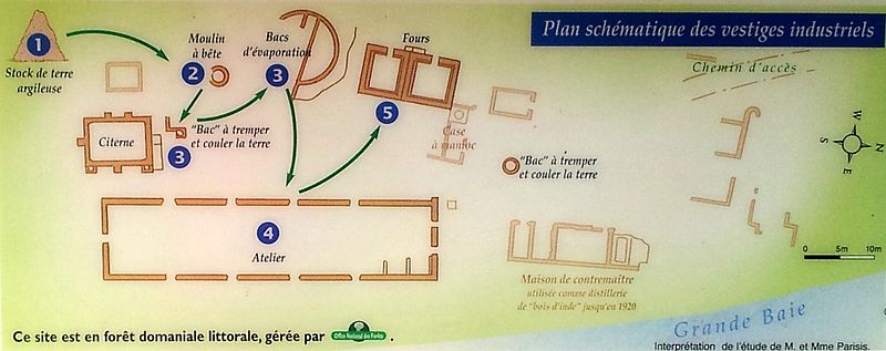Située en bordure de la Grande-Baie, sur l'île de Terre-de-Bas (Guadeloupe), la poterie est classée au titre des monuments historiques depuis le 15 décembre 1997. La création du site est attribuée soit à Pierre Guichard, soit à Jean‑Pierre Fidelin, peu après 1760; Jean‑Pierre Fidelin l'exploite jusqu'en 1809 avant de la transmettre à ses descendants. Les Fidelin constituent l'une des plus anciennes familles créoles de la Guadeloupe et possèdent des terres aux Saintes et à Trois‑Rivières, où ils exploitent aussi une poterie citée dès 1716. La fabrication, principalement destinée aux sucreries, portait sur des formes à sucre et des pots à mélasse utilisés pour l'affinage et la cristallisation du sucre. Chaque sucrerie utilisait de deux à trois mille de ces récipients et le renouvellement lié à la casse entraînait une forte demande. Les formes à sucre, hautes de plus de 50 cm, étaient cuites dans d'imposants fours d'environ 7 m sur 5 et plus de 8 m de haut, doublés de briques réfractaires et chauffés pendant plusieurs heures à près de 900 degrés. L'argile provenait de Terre-de-Haut et était mise en forme sur des tours à manivelle sur le site. Le travail était assuré par des esclaves ; l'habitation en comptait 121 en 1811 puis 130 en 1837. Ils exerçaient les fonctions de potiers, transportaient la terre et les poteries sur des pirogues à rames, coupaient le bois nécessaire aux fours, alimentaient ceux-ci ou battaient la terre, et étaient logés dans une trentaine de cases en bois ou en gaulettes recouvertes de paille. Après l'effondrement du marché du sucre blanc à partir de 1815, la poterie diversifie sa production en fabriquant des pots de fleurs, des jarres, des pots à anses et des carreaux. Jusqu'en 1830, un quart de la population de Terre-de-Bas travaille à la poterie. Globalement, l'activité principale se déroule entre 1760 et 1860, puis le site s'oriente vers la distillation de bois d'Inde, fonctionnement qui devient intermittent dans la seconde moitié du XIXe siècle et se poursuit jusqu'en 1920. Parmi les propriétaires successifs figurent peut‑être Pierre Guichard, puis assurément Jean‑Pierre Fidelin de 1764 à 1809, ensuite son gendre Marie‑Joseph Grizel Sainte‑Marie et d'autres descendants; depuis 2015, le propriétaire est le docteur Pierre Sainte‑Luce. L'ensemble, implanté en bord de mer sur plus de deux hectares, se distingue par l'ampleur des installations et le nombre de bâtiments conservés. Sur le terrain subsistent des murs en élévation, la masse de deux fours, une citerne, les vestiges d'un moulin à bêtes et plusieurs bâtiments en ruine non identifiés. L'habitation principale associée à la fabrique, citée dans les sources, n'a pas été localisée ; elle a pu disparaître lors des ouragans particulièrement dévastateurs de 1825 et 1865, qui ont entraîné de nombreuses reconstructions des bâtiments de production. Les vestiges témoignent du rôle industriel et maritime de l'atelier, qui profitait d'un mouillage favorable dans la Grande-Baie pour l'acheminement des matières et des produits. Le site, par son étendue et ses restes matériels, illustre l'importance de la céramique utilitaire dans l'économie sucrière et la transformation progressive des activités au XIXe siècle.