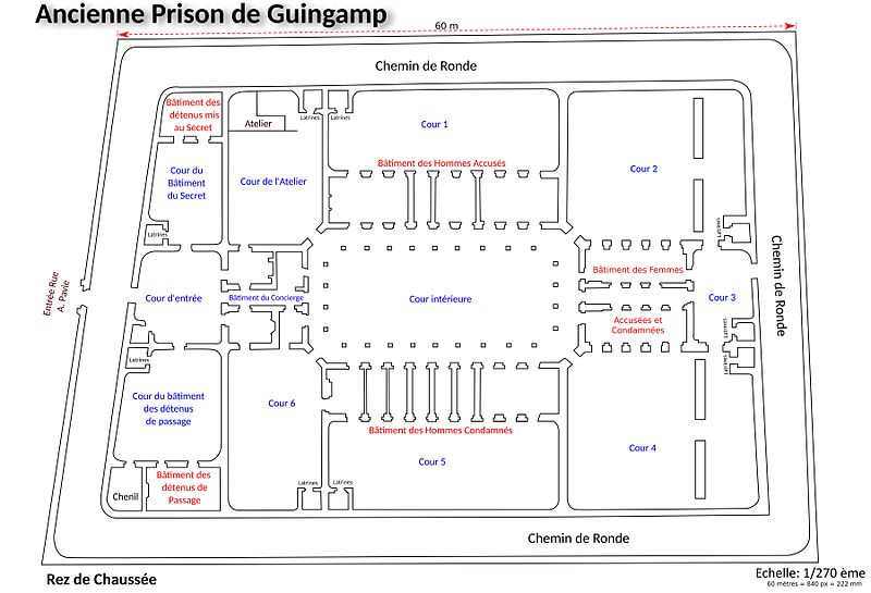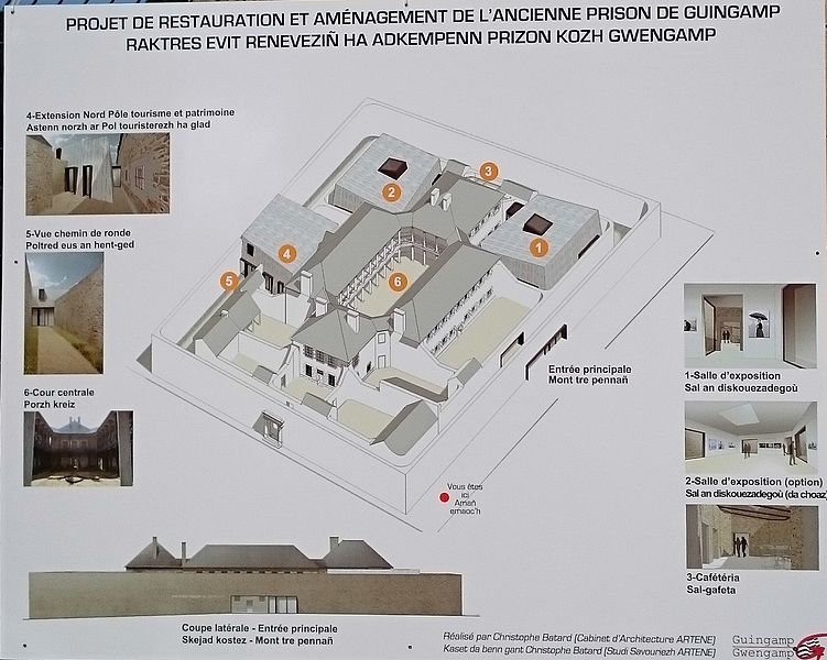 L'ancienne prison de Guingamp, située 4 rue Auguste Pavie, est l'une des premières prisons cellulaires des Côtes-d'Armor. Construite entre 1834 et 1841 selon les sources, elle a été conçue par l'architecte Louis Lorin sous l'impulsion de l'inspecteur général Charles Lucas. Inspirée du modèle pennsylvanien préconisé après les rapports de Tocqueville et Beaumont, l'édifice organise des cellules individuelles autour d'une cour centrale desservie par des galeries soutenues par des colonnes. Cette disposition, première en France à proposer une vision plus humaniste de l'enfermement, a fait de la prison un élément majeur de l'histoire de l'architecture carcérale. L'établissement occupe un plan rectangulaire de 3 038 m² au sol et comprend des logements de gardiens, des bâtiments de service et plusieurs petites cours. Il comportait trente-cinq cellules pour hommes, la plupart mesurant environ 4 m sur 1,75 m, et des aménagements permettant une surveillance permanente depuis les galeries. L'aile nord abritait l'atelier et des cellules pour les prévenus, l'aile sud accueillait les hommes condamnés et l'aile est, sur deux niveaux, était réservée aux femmes. Une fontaine au milieu de la cour assurait l'approvisionnement en eau et l'ensemble était ceint d'un chemin de ronde large de 3,40 m et de hauts murs extérieurs d'environ 7 m. Mise en service en 1841, la prison a connu plusieurs usages au XXe siècle, avec transferts de détenus vers Saint-Brieuc, accueil de réfugiés espagnols et périodes de réemploi pour des personnes détenues pour des délits de droit commun. Désaffectée au début des années 1950, elle a ensuite servi jusqu'au début des années 1980 de lieu de stockage pour les archives départementales des hypothèques. La ville de Guingamp est devenue propriétaire du site en 1992 et la prison est classée au titre des monuments historiques depuis 1997. En 2008, la municipalité a engagé des travaux de sécurisation et de restauration d'un montant de 850 000 €, destinés à mettre l'édifice hors d'eau et hors d'air ; les planchers, piliers en bois, garde-corps et la charpente ont été restaurés par la société Ateliers DLB. Depuis le début des années 2010, un projet de réhabilitation en cinq phases, commandé au cabinet d'architecture ARTENE, vise la réutilisation progressive du site ; le programme complet est chiffré à 6 785 000 € HT, avec un budget de pré-étude de 237 000 € en 2013 et un engagement prévisionnel de 2 818 000 € HT pour les deux premières phases. La ville a par ailleurs débloqué 5,3 millions d'euros pour accélérer les phases 3 et 4. L'ancienne prison abrite depuis 2019 le centre d'art GwinZegal, labellisé par le ministère de la Culture, qui propose expositions, résidences et actions pédagogiques autour de la photographie. L'Institut national supérieur de l'éducation artistique et culturelle (INSEAC) s'est installé dans l'enceinte en septembre 2021 pour y assurer des formations et des activités liées à l'éducation artistique et culturelle. Le site est ouvert au public du mercredi au dimanche et propose des parcours immersifs binauraux intitulés "Des mots et des murs", disponibles au Centre d'art GwinZegal. Un ouvrage collectif, La prison de Guingamp de 1841 à nos jours, édité par la ville en partenariat avec l'INSEAC et les archives départementales, complète les ressources disponibles. Des clichés pris lors des Journées européennes du patrimoine en 2013 et 2015 illustrent l'entrée rue Auguste Pavie, les cellules (dont celles de l'isolement), les bâtiments des gardiens, les piliers en bois, le chemin de ronde, les bâtiments des hommes et des femmes et l'accès créé en 2013 à partir de la Cour 6. L'ensemble reste au centre d'un projet de transformation destiné à concilier conservation patrimoniale et nouvelles affectations culturelles et éducatives.