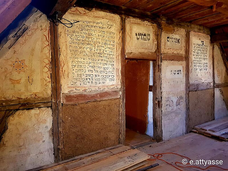 L'ancienne synagogue se situe au 27, rue des Usines à Traenheim, dans le Bas-Rhin. Une inscription portée sur la voussure de la porte de la cave indique la date 1582, qui concerne la maison. Dans le comble subsistent les vestiges d'un aménagement de synagogue datable de 1722-1723, constitué de cloisons en pan de bois peintes sur enduit. Le décor comporte des textes rituels en hébreu, des motifs figuratifs rarement représentés évoquant une fête juive — probablement Souccot — ainsi que des motifs floraux. Après le départ des occupants juifs, les murs du grenier furent passés à la chaux et les traces de cette petite synagogue furent redécouvertes dans la seconde moitié du XXe siècle. Il s'agit de la seule synagogue d'Alsace à présenter des peintures murales. L'édifice a été inscrit au titre des monuments historiques en 1996, puis classé en 1998. Ce grenier aménagé en synagogue, intégré à une maison particulière, constitue un témoignage rare du patrimoine juif d'Alsace.