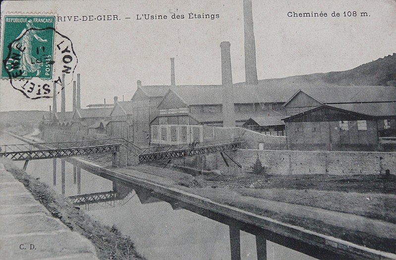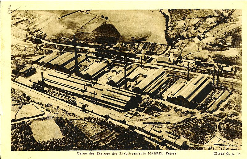 Les frères Marrel, qui exploitèrent une forge à Rive-de-Gier depuis 1853, installèrent une nouvelle usine aux Étaings, à Châteauneuf, pour disposer de locaux et d'équipements plus importants. L'ensemble industriel occupa finalement 12 hectares et comprenait de vastes bâtiments pour les laminoirs à tôles et les blindages, des marteaux-pilons de 25, 50 et 100 tonnes, une fonderie d'acier et une aciérie Martin. De cette vaste usine, il ne subsiste que la cheminée, construite entre 1867 et 1868 et haute de 108,7 mètres ; à son inauguration elle fut considérée comme la plus haute d'Europe, et la plus haute construite en briques. Classée monument historique en 1992, elle présente un fût octogonal en briques cerclé de fer, posé sur une embase carrée de 8 mètres de côté et de 16 mètres de hauteur ; les parois du fût ont 1,50 m d'épaisseur. Le couronnement est formé d'un chapeau de briques et de mortier, l'ensemble étant dominé par un paratonnerre, et des anneaux scellés dans la paroi servent d'échelle intérieure. Le briquetage diminue en épaisseur vers le sommet et des cerclages métalliques équidistants, visibles, renforcent la solidité de l'ouvrage ; le cerclage de fer et le couronnement ont été refaits régulièrement. En 1874 la cheminée connut une inflexion qui la mena au bord de l'effondrement ; un ingénieur nommé Adolphe Henri parvint à la redresser par un procédé habile. Le fût repose sur un bâtiment de briques aux hauts pignons de 16 mètres, qui lui confèrent une silhouette évoquant celle d'un édifice à vocation religieuse. Une tradition locale rapporte que l'évasement a un diamètre de quatre mètres, assez large pour qu'un tombereau tiré par deux bœufs puisse tourner sur sa margelle. La Cheminée des Étaings constitue aujourd'hui un repère du patrimoine industriel du Pilat et reste le seul élément protégé en lien avec la production de l'usine Marrel. En 2007, un nichoir a été installé à 70 mètres de hauteur par des cordistes, avec le soutien financier de la mairie de Châteauneuf et l'autorisation de la société Industeel ; en 2016 des ornithologues ont observé un couple de faucons pèlerins s'y établir. En 2015, la cheminée fut utilisée comme phare de l'entrée Est de la métropole de Saint-Étienne en s'illuminant la nuit pour annoncer la 10e Biennale internationale du Design : elle reçut 32 guirlandes d'environ 300 LED chacune, permettant le défilement d'une vidéo en très basse résolution (32 x 40 pixels). La maison de la famille Marrel se situait à Rive-de-Gier, 38 rue du Professeur-Roux.