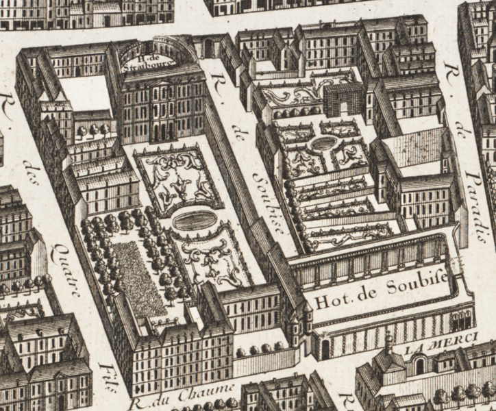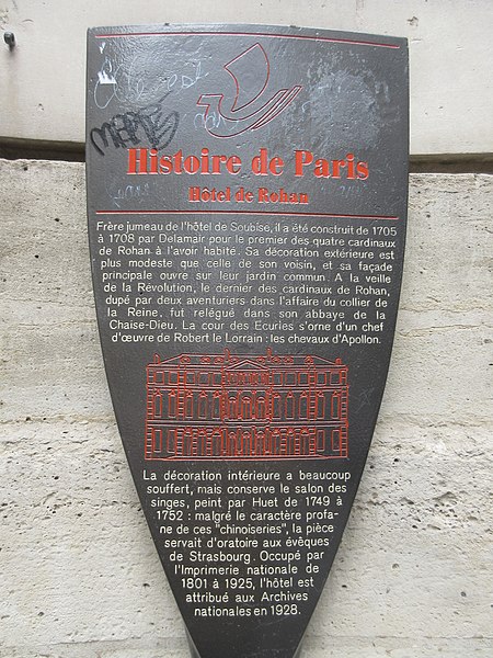 Les anciens hôtels de Rohan et de Soubise, édifiés aux XVIIe et XVIIIe siècles, abritent aujourd’hui les Archives nationales. L’ensemble comprend notamment le bas‑relief des Chevaux du Soleil, la porte de l'ancien hôtel de Clisson et d’autres décors remaniés lors de réaménagements aux XIXe et XXe siècles, ainsi que la construction du CARAN. Les Archives nationales conservent les archives des organes centraux de l’État, à l’exception des fonds des ministères des Armées, de l’Économie et des Finances et des Affaires étrangères. L’institution trouve ses origines dans les décisions de l’Assemblée constituante : un archiviste est nommé dès 1789 et le décret de 1790 définit les Archives nationales comme dépôt des actes établissant la constitution du royaume et son droit public. La loi du 7 messidor an II (25 juin 1794) a renforcé la centralisation en faisant des Archives nationales le centre commun des dépôts publics, avant que l’autorité gouvernementale n’assume leur tutelle sous le Consulat. Avant leur installation à l’hôtel de Soubise en 1808, les archives furent successivement hébergées à Versailles, dans des bibliothèques parisiennes et au palais des Tuileries ; l’armoire de fer, conçue pour protéger des documents sensibles, reste un témoin de cette période. Les fonds couvrent l’histoire de la France depuis le VIIe siècle jusqu’à nos jours et sont répartis entre le site historique de Paris, le centre de Pierrefitte‑sur‑Seine et le site de Fontainebleau, le siège administratif étant situé à Pierrefitte, certains fonds restant à Paris. Deux autres services conservent des fonds d’intérêt national : les Archives nationales d’outre‑mer à Aix‑en‑Provence et les Archives nationales du monde du travail à Roubaix. Rattachées au ministère chargé de la Culture, les Archives nationales ont pour mission de collecter, classer, conserver, restaurer, communiquer et valoriser les archives publiques des services centraux ainsi que des fonds privés d’importance nationale. Les entrées des archives privées se font par donations, legs, achats, dations en paiement ou dépôts, chaque mode répondant à des règles juridiques spécifiques. Le classement repose sur un cadre méthodique ancien et complexe établi au début du XIXe siècle et s’accompagne de la production d’instruments de recherche pour rendre les fonds communicables. La conservation mobilise des actions préventives et curatives, des ateliers de restauration et des transferts de support (microfilm, numérisation) afin de préserver le contenu intellectuel et le support matériel des documents. La communication est conçue comme un principe démocratique : la consultation se fait en salles de lecture, soutenue par des instruments de recherche dématérialisés et des services d’aide à la recherche. Le site parisien, organisé autour des hôtels de Soubise et de Rohan, conserve principalement les archives de l’Ancien Régime, les minutes des notaires de Paris, la bibliothèque et le Musée des Archives nationales ; la consultation y est organisée notamment au CARAN. L’hôtel de Soubise, acquis par l’État pour y installer les Archives, a été adapté par des travaux successifs au XIXe siècle pour créer des magasins, des bureaux et un musée. L’hôtel de Rohan, affecté aux Archives nationales par décret en 1927 après le départ de l’Imprimerie nationale, a été restauré pour accueillir le Minutier central des notaires de Paris et des salons historiques ; des décors de l’ancien hôtel de Voyer d’Argenson y ont été remontés et ouverts au public à l’issue des opérations de restitution et de conservation. Le site de Fontainebleau, conçu pour accueillir d’importants versements contemporains, a abrité des unités de magasinage, des ateliers spécialisés et des collections d’archives électroniques ; il a été progressivement fermé et ses fonds transférés vers Paris et Pierrefitte. Le nouveau centre de Pierrefitte‑sur‑Seine, conçu pour les archives postérieures à la Révolution, a permis une vaste opération de reconditionnement, de numérisation et de modernisation des instruments de recherche et accueille de nombreux fonds contemporains. Les archives nativement numériques sont désormais gérées par des logiciels spécialisés : environ 200 millions de fichiers sont administrés depuis 2018 par Adamant dans le cadre du programme interministériel d’archivage. Les Archives nationales développent en outre des actions culturelles et artistiques, des expositions et des partenariats scientifiques, et mettent à disposition des chercheurs des instruments de recherche en ligne via la salle des inventaires virtuelle et plusieurs bases de données. La communication et la réutilisation des documents sont régies par le code du patrimoine : la communicabilité immédiate et la gratuité des informations publiques sont la règle, avec des délais ou des restrictions lorsque la loi protège des intérêts privés ou des droits d’auteur.