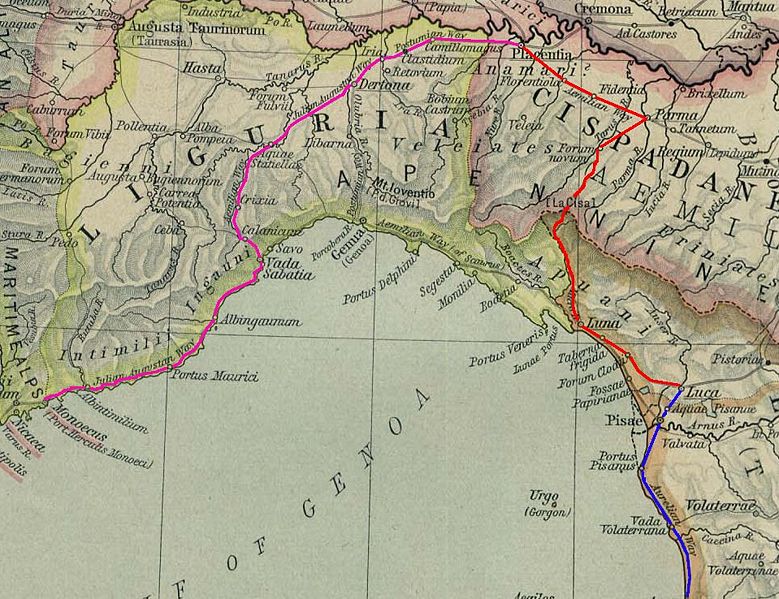 La voie traversait ensuite Antipolis (Antibes), fortement romanisée, puis Forum Julii (Fréjus), cité portuaire prospère dont les vestiges romains — thermes, amphithéâtre, théâtre, remparts, aqueduc et restes du port — sont encore visibles. Elle suivait ensuite le cours de l’Argens, empruntait des voies correspondant à la nationale jusqu’au Muy et à Forum Voconii (Vidauban), puis rejoignait Le Luc, Matavo (Cabasse) et Brignoles, où des milliaires et une villa gallo-romaine ont été mis au jour. Turris (Tourves) constituait une station stratégique avec de nombreuses villae, avant que la voie ne contourne Saint-Maximin-la-Sainte-Baume pour gagner Pourcieux et la Grande Pugère ; entre ces communes subsistent des pierres attribuées au Trophée de Marius.