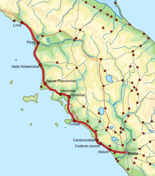 La Via Aurelia, ou voie Aurélienne, est une grande voie romaine qui longeait la côte méditerranéenne depuis Rome jusqu'à Luni puis, prolongée, jusqu'en Gaule narbonnaise où elle se raccordait près d'Arles à la voie Domitienne et à la via Agrippa. Sa construction a été lancée à partir de 241 av. J.-C. par le consul Caïus Aurelius Cotta et la voie a ensuite été prolongée par divers responsables, notamment par Æmilius à partir de 109 av. J.-C. et par l’empereur Auguste qui, après ses campagnes dans les Alpes-Maritimes, étendit la voie de Plaisance au fleuve Var à partir de 13 av. J.-C., donnant ainsi naissance à la Via Julia Augusta. Ce prolongement permit de raccourcir considérablement l’itinéraire vers l’Hispanie en évitant le passage par le col de Montgenèvre et la vallée de la Durance. Le cursus publicus, le service postal romain, parcourait environ 70 kilomètres par jour sur cet axe, avec quatre changements de chevaux.