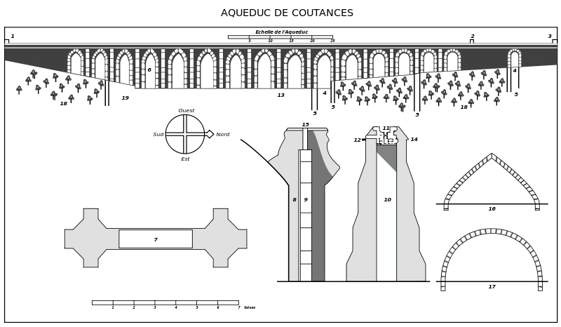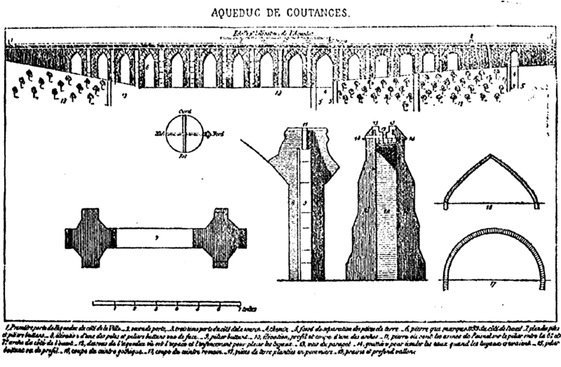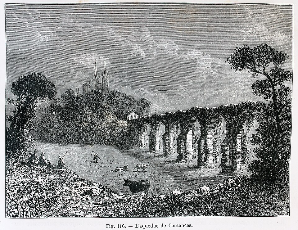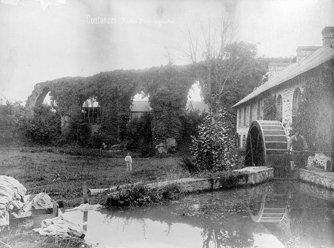 L'aqueduc de Coutances, ancien ouvrage destiné à alimenter la ville de Coutances dans le département de la Manche en Normandie, est classé au titre des monuments historiques. Selon les recherches de Louis-François de Fontenu et Charles de Gerville aux XVIIIe et XIXe siècles, un aqueduc aurait existé à l'époque gallo-romaine, attribué à Constance Chlore et détruit par les Normands, hypothèse qui reste sans preuve archéologique. L'édifice actuel a été élevé à l'instigation du gouverneur Foulques Pesnel : sa construction est décidée en 1277 pour conduire les eaux de la fontaine de l'Écoulanderie vers le couvent des Dominicains et la ville, en traversant la vallée du Bruisard, comme l'indique un acte de Philippe le Hardi. Robert Cenalis, dans la Gallia historica, décrit l'aqueduc sortant d'un segment souterrain ; la partie aérienne mesure 240 mètres et se divise en trois tronçons : un premier qui court sur un mur, un deuxième composé de seize arcades franchissant la vallée du Bruisard, puis un troisième de nouveau sur mur. Cinq de ces arches sont de plein cintre et onze en tiers-point. L'ouvrage employait probablement le principe du pont-siphon, la conduite faisant passer l'eau d'une altitude de 125 mètres à 53 mètres avant de la remonter à 92 mètres. L'aqueduc a été restauré en 1313 puis en 1566 à la suite de l'incendie du couvent par les huguenots, et il a été utilisé jusqu'au XVIIe siècle. Fortement dégradé avec le temps, il est aujourd'hui réduit à trois arches ; Adolphe Joanne signalait déjà en 1867 que onze des seize arches étaient détruites et qu'une pierre de la seconde arcade, vers la ville, portait la date de 1595. Au titre de la protection, l'aqueduc figure sur la liste des monuments historiques de 1840 ; ses abords, situés entre la route et l'ouvrage, ainsi qu'une bande de 25 mètres de largeur à partir de l'aqueduc, ont été classés par décret du 10 août 1939.