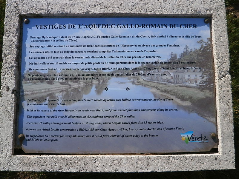 Portion d'aqueduc gallo-romain. L'aqueduc de Fontenay, parfois appelé aqueduc du Cher, est un conduit en grande partie souterrain qui alimentait vraisemblablement la ville antique de Caesarodunum, devenue Tours, en complétant l'apport des sources, puits et d'un autre aqueduc intra-muros. Il prend son nom du lieu-dit Fontenay, près de Bléré, où se trouvaient ses captages principaux, issus d'une nappe phréatique encore exploitée au XXIe siècle, et recevait le concours de plusieurs sources secondaires. Son tracé connu suit la rive gauche du Cher, souvent encastré dans le coteau calcaire, et n'est interrompu que ponctuellement par des ouvrages permettant le franchissement des vallons ; il est reconnu entre Bléré et Saint-Avertin mais sa continuité au-delà de Saint-Avertin reste indéterminée en raison des bouleversements modernes. Daté plausiblement du Haut-Empire, probablement du Ier siècle, il a bénéficié d'entretien et de réfections successives jusqu'à son abandon à une époque difficile à préciser, semble-t-il antérieure au Haut Moyen Âge. Les vestiges conservés, parfois visibles sous forme d'anomalies linéaires du relief ou de maçonneries mises à nu par des éboulements, sont le plus souvent sur des propriétés privées ; quelques éléments aisément accessibles subsistent cependant, comme une portion de canal déplacée exposée à l'entrée du camping de Véretz, des piles et des conduits en bordure de route, ainsi que des arcades et piles de ponts dans plusieurs parcs et vallons. Un tronçon voûté dégagé sur un domaine privé à Athée-sur-Cher fait l'objet d'une protection au titre des monuments historiques.