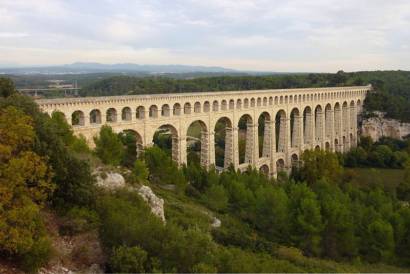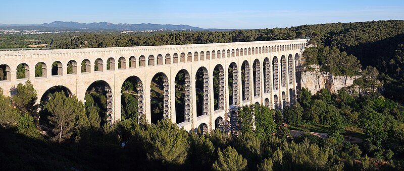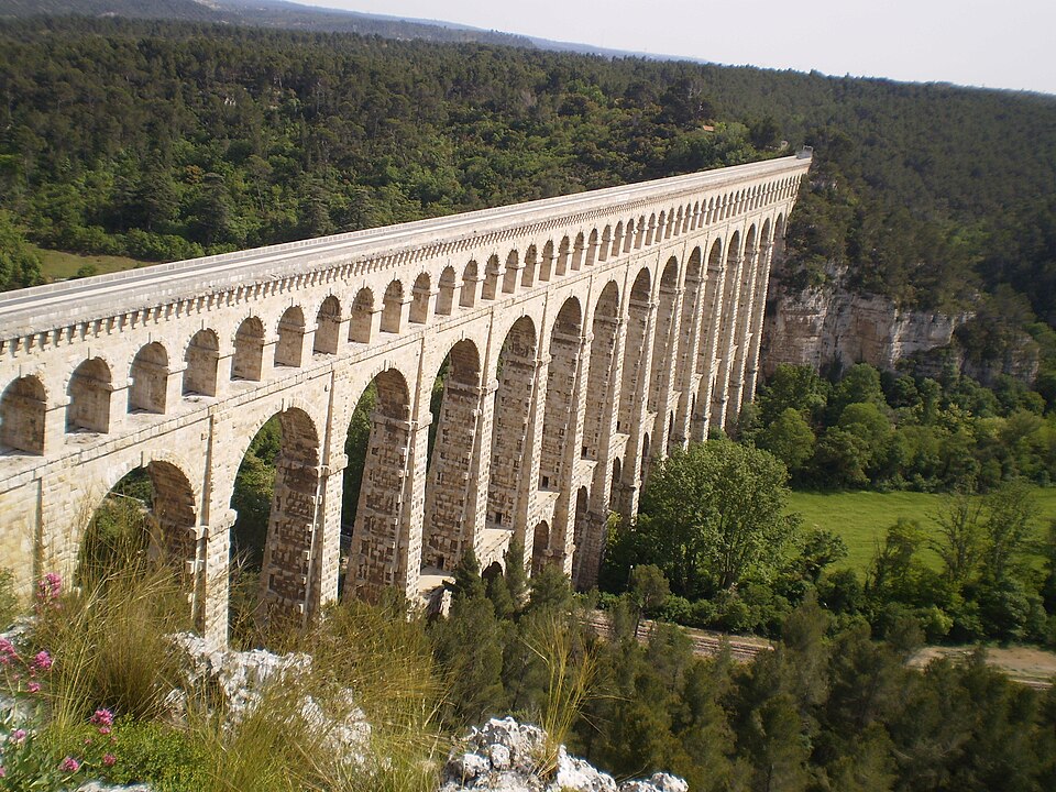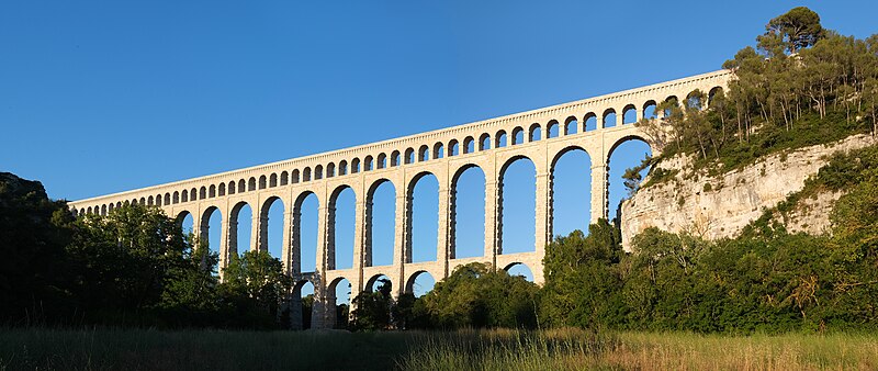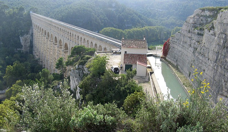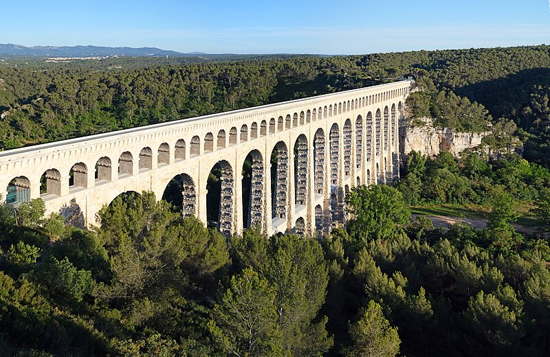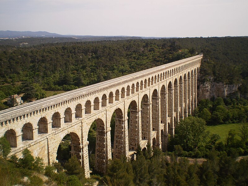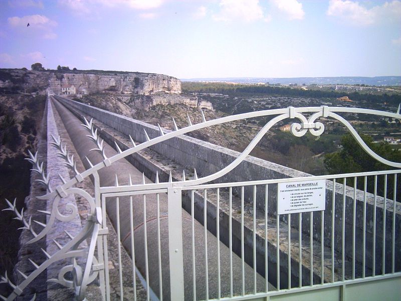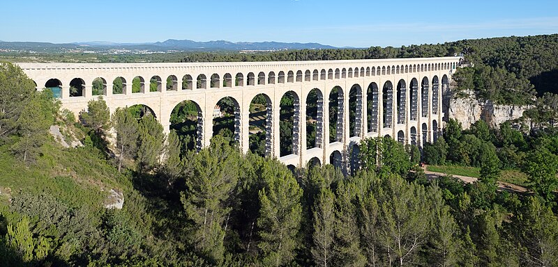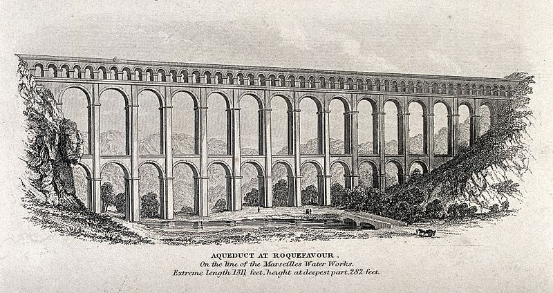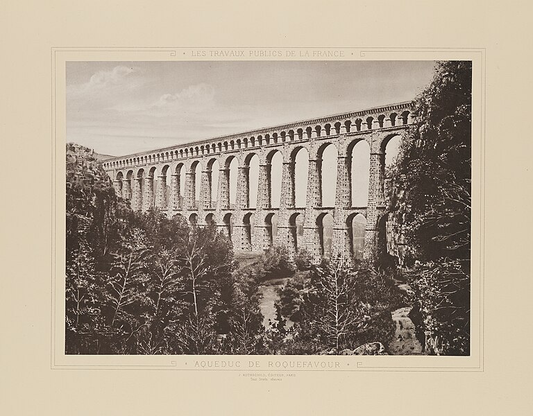 L'aqueduc de Roquefavour est un pont-aqueduc en pierre long de 393 mètres et haut de 82,65 mètres, situé sur la commune de Ventabren (Bouches‑du‑Rhône); il achemine l'eau de la Durance vers Marseille dans le cadre du canal de Marseille et franchit la vallée de l'Arc, la rivière, la route d'Aix-en‑Provence à Berre et la voie ferrée Aix‑Rognac. Sa construction, lancée en 1841 et achevée en 1847, a été dirigée par Jean François Mayor de Montricher; un technicien suisse nommé ingénieur en chef, secondé par William Fraisse, a assuré la conduite du chantier. Le projet, présenté après les sécheresses de 1833‑1834 et les troubles sanitaires qui ont suivi, avait été proposé en 1835 par le maire de Marseille Maximin‑Dominique Consolat; la ville choisit l'option d'un pont‑aqueduc en maçonnerie plutôt qu'un pont‑siphon malgré un coût de 3 784 871 francs‑or, sensiblement supérieur à des ouvrages contemporains. Les sondages et recherches de carrières furent menés en 1839‑1840, l'adjudication intervint en 1840 et les travaux débutèrent l'année suivante. Le chantier mobilisa 5 000 ouvriers, dont environ 300 tailleurs de pierre; les blocs, parfois lourds de 15 tonnes, venaient de carrières à Velaux et étaient acheminés sur une voie ferrée de 9 km créée pour l'occasion. La réalisation se révéla plus complexe et plus coûteuse que prévu; après des tensions contractuelles, le ministre des Travaux publics Jean‑Baptiste Teste ordonna la poursuite des travaux le 16 avril 1842 et la suite se fit en régie. L'ouvrage fut terminé en mai 1847 et, le 30 juin, l'eau de la Durance franchit pour la première fois le pont‑aqueduc. La capacité de transit a été augmentée en 1971 à 4,4 m3/s grâce à deux conduites superposées d'un mètre de diamètre intégrées au troisième niveau, puis en 1975 la cunette a été remplacée par un tuyau de 2,20 mètres de diamètre. L'aqueduc, largement inspiré du pont du Gard et construit sur trois étages, est considéré comme le plus haut aqueduc en pierre du monde; il mesure 393 m de long et sa hauteur atteint pratiquement le double de celle du pont du Gard. Sur le plan architectural, la base comprend 12 arches d'ouverture 15 m et une hauteur de 34,1 m, le deuxième niveau comporte 15 arcades de 16 m d'ouverture et 34,9 m de hauteur, et le troisième niveau compte 53 arches de 5 m d'ouverture pour 13,5 m de hauteur; les faces intérieures des blocs ont été taillées tandis que les parements extérieurs ont été laissés bruts pour des raisons d'économie, produisant des effets d'ombre et de lumière. L'ouvrage a longtemps été présenté comme le plus grand ouvrage en pierre de son type et a joué un rôle symbolique dans l'arrivée de l'eau à Marseille, liée notamment à la construction du Palais Longchamp; Alphonse de Lamartine le qualifia de « merveille du monde ». Le monument a aussi suscité des critiques, par exemple en 1990 de la part de Bernard Marrey au sujet de ses proportions et de son coût; Louis Napoléon Bonaparte récompensa Jean François Mayor de Montricher en lui décernant la croix d'officier de la Légion d'honneur en 1852. L'aqueduc est classé monument historique depuis 2005. En 2016, le canal de Marseille, dont l'aqueduc de Roquefavour, a fourni 240 millions de m3 d'eau potable, soit 80 % de la consommation de Marseille. Des travaux de restauration importants, lancés en 2020 et prévus pour 44 mois afin d'assurer la pérennité de l'ouvrage, se sont achevés avec la pose de la dernière pierre le 17 mai 2024 par Martine Vassal; le chantier a coûté 16,8 millions d'euros hors taxes, financés en majeure partie par la métropole (10,4 M€, soit 62 %), la Direction régionale des Affaires culturelles (2,9 M€) et l'Agence de l'eau (3,5 M€). L'aqueduc a été représenté dès le XIXe siècle, notamment par Édouard Baldus et par un dessin de Freeman, et figure dans des prises de vues modernes ainsi que dans plusieurs productions audiovisuelles, parmi lesquelles des épisodes des séries Draculi & Gandolfi et Tout cela je te le donnerai, ainsi que le film Un petit miracle.