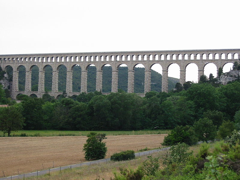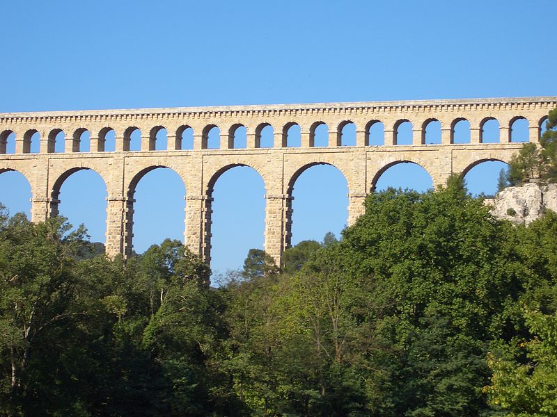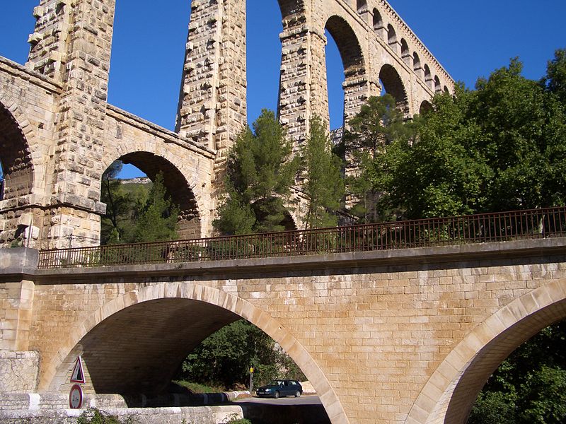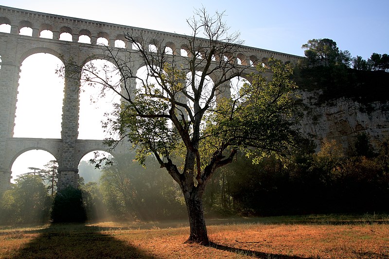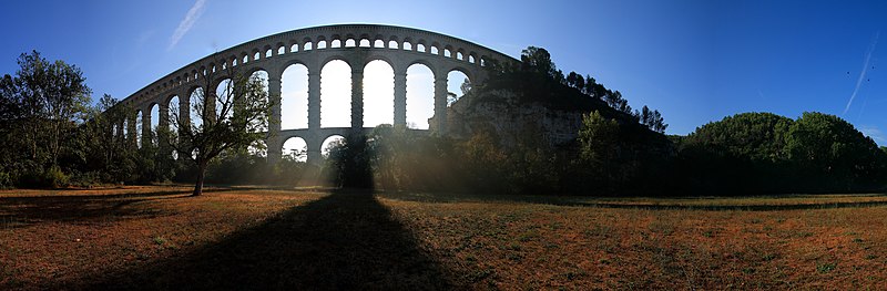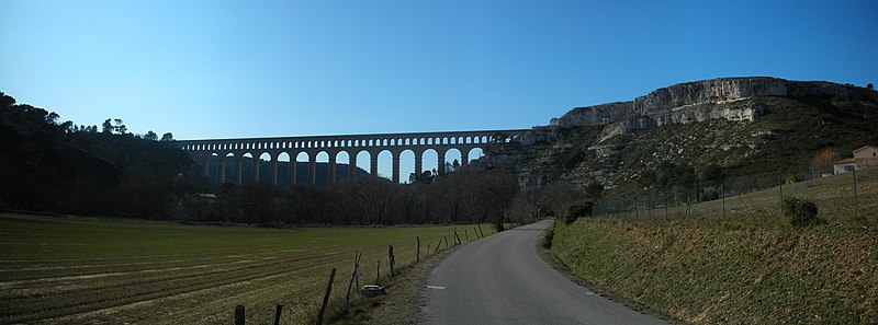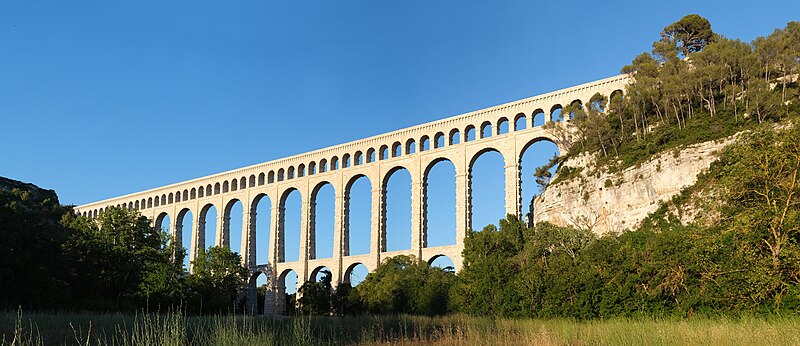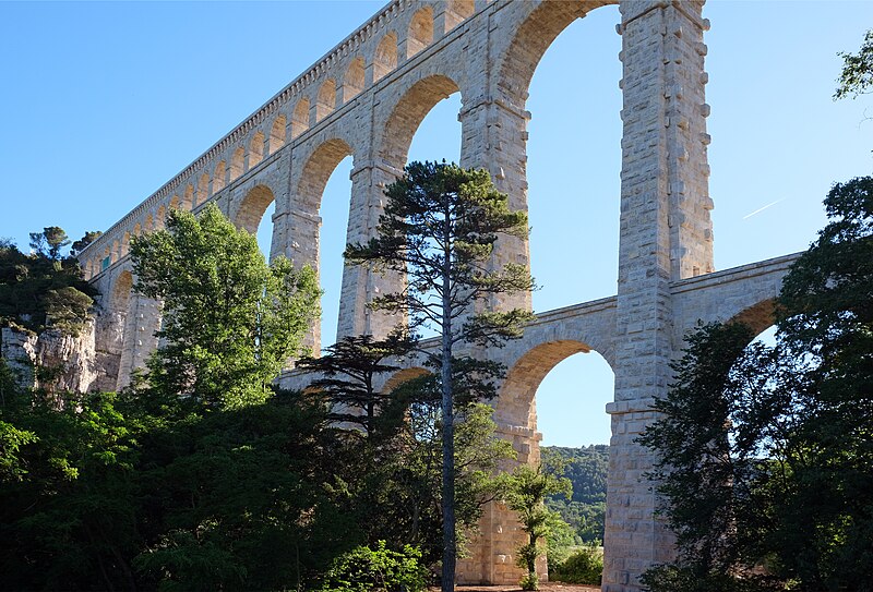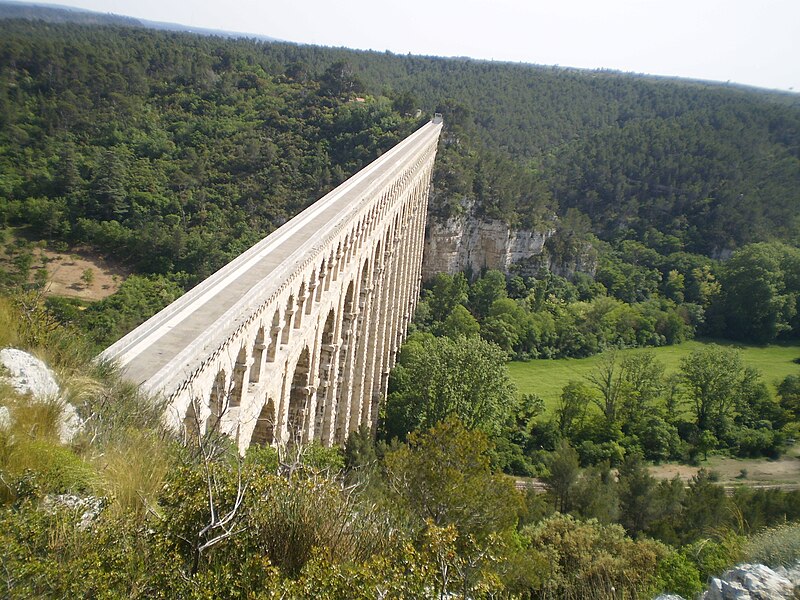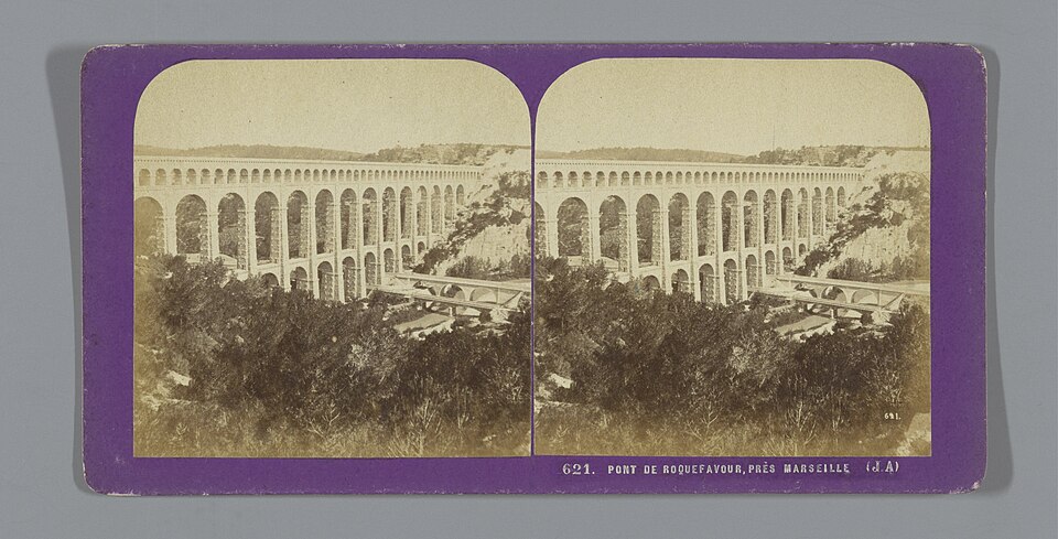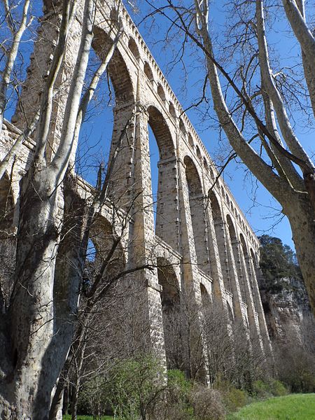 L'aqueduc de Roquefavour est un pont-aqueduc en pierre long de 393 mètres et haut de 82,65 mètres, situé sur la commune de Ventabren (Bouches‑du‑Rhône); il achemine l'eau de la Durance vers Marseille dans le cadre du canal de Marseille et franchit la vallée de l'Arc, la rivière, la route d'Aix-en‑Provence à Berre et la voie ferrée Aix‑Rognac. Sa construction, lancée en 1841 et achevée en 1847, a été dirigée par Jean François Mayor de Montricher; un technicien suisse nommé ingénieur en chef, secondé par William Fraisse, a assuré la conduite du chantier. Le projet, présenté après les sécheresses de 1833‑1834 et les troubles sanitaires qui ont suivi, avait été proposé en 1835 par le maire de Marseille Maximin‑Dominique Consolat; la ville choisit l'option d'un pont‑aqueduc en maçonnerie plutôt qu'un pont‑siphon malgré un coût de 3 784 871 francs‑or, sensiblement supérieur à des ouvrages contemporains. Les sondages et recherches de carrières furent menés en 1839‑1840, l'adjudication intervint en 1840 et les travaux débutèrent l'année suivante. Le chantier mobilisa 5 000 ouvriers, dont environ 300 tailleurs de pierre; les blocs, parfois lourds de 15 tonnes, venaient de carrières à Velaux et étaient acheminés sur une voie ferrée de 9 km créée pour l'occasion. La réalisation se révéla plus complexe et plus coûteuse que prévu; après des tensions contractuelles, le ministre des Travaux publics Jean‑Baptiste Teste ordonna la poursuite des travaux le 16 avril 1842 et la suite se fit en régie. L'ouvrage fut terminé en mai 1847 et, le 30 juin, l'eau de la Durance franchit pour la première fois le pont‑aqueduc. La capacité de transit a été augmentée en 1971 à 4,4 m3/s grâce à deux conduites superposées d'un mètre de diamètre intégrées au troisième niveau, puis en 1975 la cunette a été remplacée par un tuyau de 2,20 mètres de diamètre. L'aqueduc, largement inspiré du pont du Gard et construit sur trois étages, est considéré comme le plus haut aqueduc en pierre du monde; il mesure 393 m de long et sa hauteur atteint pratiquement le double de celle du pont du Gard. Sur le plan architectural, la base comprend 12 arches d'ouverture 15 m et une hauteur de 34,1 m, le deuxième niveau comporte 15 arcades de 16 m d'ouverture et 34,9 m de hauteur, et le troisième niveau compte 53 arches de 5 m d'ouverture pour 13,5 m de hauteur; les faces intérieures des blocs ont été taillées tandis que les parements extérieurs ont été laissés bruts pour des raisons d'économie, produisant des effets d'ombre et de lumière. L'ouvrage a longtemps été présenté comme le plus grand ouvrage en pierre de son type et a joué un rôle symbolique dans l'arrivée de l'eau à Marseille, liée notamment à la construction du Palais Longchamp; Alphonse de Lamartine le qualifia de « merveille du monde ». Le monument a aussi suscité des critiques, par exemple en 1990 de la part de Bernard Marrey au sujet de ses proportions et de son coût; Louis Napoléon Bonaparte récompensa Jean François Mayor de Montricher en lui décernant la croix d'officier de la Légion d'honneur en 1852. L'aqueduc est classé monument historique depuis 2005. En 2016, le canal de Marseille, dont l'aqueduc de Roquefavour, a fourni 240 millions de m3 d'eau potable, soit 80 % de la consommation de Marseille. Des travaux de restauration importants, lancés en 2020 et prévus pour 44 mois afin d'assurer la pérennité de l'ouvrage, se sont achevés avec la pose de la dernière pierre le 17 mai 2024 par Martine Vassal; le chantier a coûté 16,8 millions d'euros hors taxes, financés en majeure partie par la métropole (10,4 M€, soit 62 %), la Direction régionale des Affaires culturelles (2,9 M€) et l'Agence de l'eau (3,5 M€). L'aqueduc a été représenté dès le XIXe siècle, notamment par Édouard Baldus et par un dessin de Freeman, et figure dans des prises de vues modernes ainsi que dans plusieurs productions audiovisuelles, parmi lesquelles des épisodes des séries Draculi & Gandolfi et Tout cela je te le donnerai, ainsi que le film Un petit miracle.
