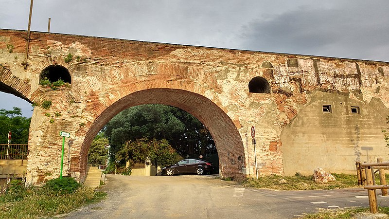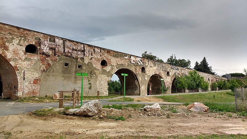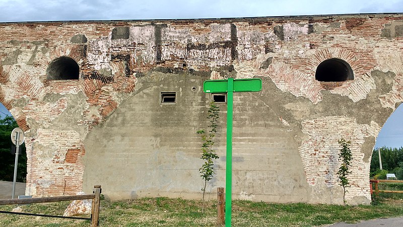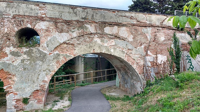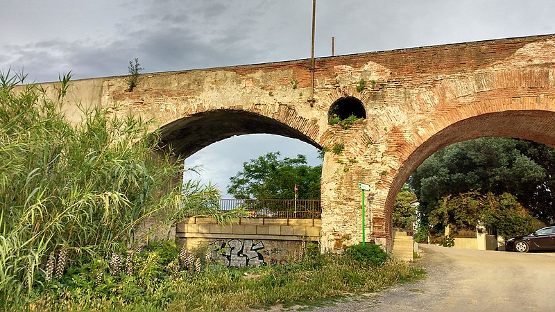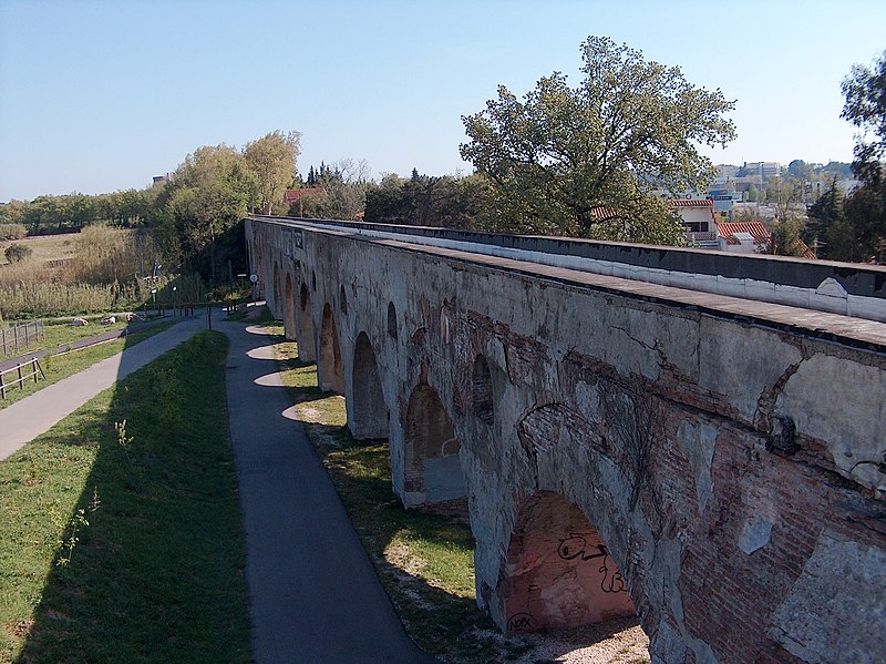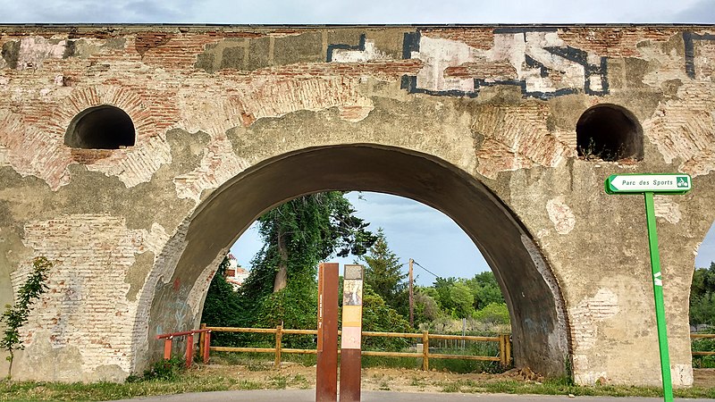 L'aqueduc des Arcades, aussi appelé Rec Comtal ou Las Canals, est un pont‑aqueduc situé avenue d'Espagne à Perpignan, qui relie le canal partant d'Ille‑sur‑Têt au réseau urbain de la ville. Long d'environ 300 mètres, il présente une largeur de 4,60 mètres et une hauteur d'environ 13 mètres, selon un axe nord‑est / sud‑ouest. L'ouvrage se compose de 21 arcades en plein cintre réalisées en cayroux, jointoyées au mortier de chaux ; chacun des piliers est percé d'une niche traversante. La dixième arche, plus large que les autres et dotée d'un arc surbaissé, permettait le franchissement d'un chemin ancien, aujourd'hui remplacé par une ligne de chemin de fer. Considéré comme le principal ouvrage d'art hydraulique du Roussillon au Moyen Âge, il a été aménagé pour assurer un approvisionnement permanent en eau face à l'expansion et aux besoins croissants de Perpignan. Les premières dérivations sous forme de canaux sont attestées dès le XIIe siècle et se développent au fil des siècles sous l'impulsion des rois de Majorque, qui commandent ces travaux entre les XIIe et XIVe siècles. Un ouvrage en bois est mentionné dès 1338 ; il est ensuite reconstruit en maçonnerie entre 1368 et 1378, l'usage du bois laissant place à des matériaux de sable, de cayrou et de chaux. L'aqueduc permit de franchir la dépression naturelle située au sud de la ville, entre la colline du Serrat‑d'en‑Vaquer et celle de Puig‑Joan, et d'acheminer de manière continue les eaux du canal dans la ville et sa périphérie. Outre sa fonction première de distribution d'eau, il contribuait à la gestion des crues grâce à un déversoir en amont, facilitait la circulation des habitants et de leurs troupeaux et assurait la jonction entre des tunnels de "coves". Cette structure témoigne des aménagements hydrauliques successifs mis en place pour répondre aux besoins urbains et économiques de Perpignan au Moyen Âge. Bibliographie principale : notice « Aqueduc des Arcades » (PA00104064) de la base Mérimée, ministère de la Culture.
