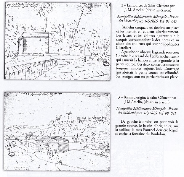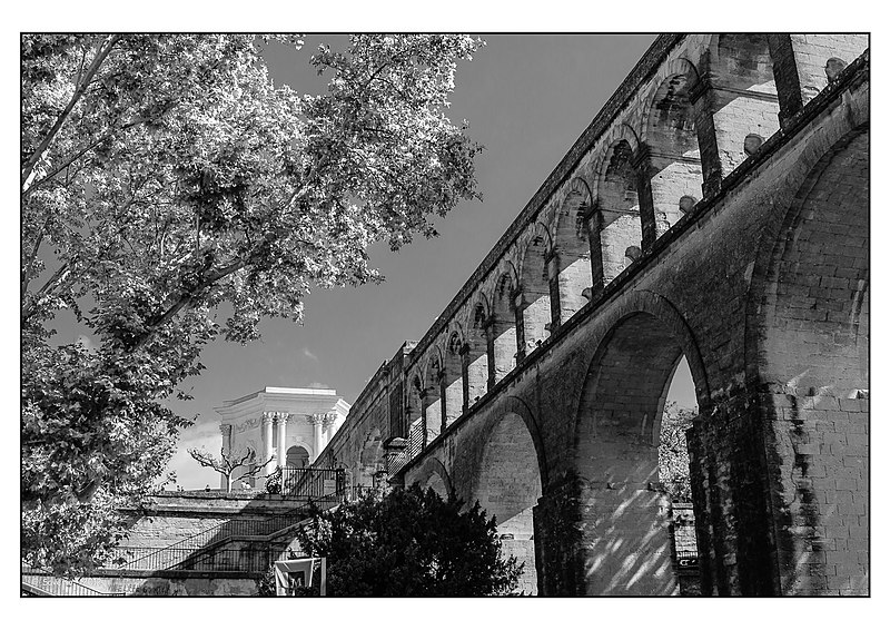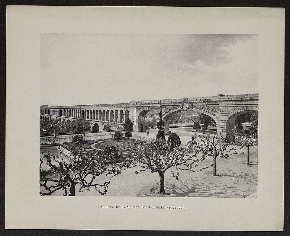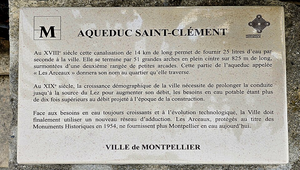 Pont-aqueduc dit Arceaux sur la Lironde, sur la totalité de sa section sur arcades au-dessus de la rivière Lironde et de la route départementale numéro 112E (cad. Montferrier-sur-Lez AD 59 ; Saint-Clément-la-Rivière CD 110) : inscription par arrêté du 19 août 1994 ; L'aqueduc, en totalité, et tous les éléments faisant partie du système d'adduction d'eau et des aménagements de la source du Lez, situé sur les communes de Montferrier-sur-Lez, de Montpellier et de Saint-Clément-de-Rivière, suivants les plans annexés à l'arrêté, pour les parties visibles sur les parcelles cadastrées suivantes : sur la commune de Montferrier-sur-Lez sur les parcelles AD16, AD59, AE32, AE55, AN51, AP72, AS149, AS127, AZ108, AZ124, AY12, AY13, AY14 et AY32 ; sur la commune de Montpellier sur les parcelles AB224, AC213, AD76, AD110, BX255, KL244, KL595, KL911, KP6, KR344, KR566, KR574, KR578, KR580, KS59, KS177, KS511, KT356, KT9, KT82 (allée Fragonard), MS4, MY356, MY357, MY476, MY489, MY732, MY734, MY789, MY795, MY796, MY797, MY805, MY806, MY814, MY815, MY818, MY905, TD144, TD145, TE42, TM3, TM7, TN7 et TN47 ; sur la commune de Saint-Clément-de-Rivière sur les parcelles AC5, AC6, AD3, AE5, AH4, AI6, AI18, AI22, AV23, AV28, AW118, AW119, AX15, AX33, AY4, AY19, AY25, BL2, BL6, BL19, BO46 ; pour les parties enterrées sous les parcelles relevant du domaine public non cadastrées suivantes : sur la commune de Montferrier-sur-Lez : chemin du Val de la Lironde, rond-point de la D112, allée Olympe de Gouges, chemins des Tennis, du Pouget, impasse de la Grande Font, montée des Picadous, chemin Neuf (D127E3), de la Font du Château, Notre-Dame, de la Calade, de l'Ayres des Masques, de la Pinède, du Pioch de Baillos ; sur la commune de Montpellier : rue de la Font-Froide, impasse de la Blanquette, rue de la Lironde, boulevard de la Lironde, route de Ganges (D986), rues André Boulloche, René Etiemble, du Professeur Maximilien Nguyen-Phong, de la Croix de Lavit, Saint-Priest, avenue Ernest Hemingway (D127), avenue des Moulins, D65, rues Jean Bart, Auguste Bérard, de la Goélette, de la Frégate, avenue du Professeur Louis Ravas, rues Edmond Lautard, Paul Rimbaud, Vélasquez, avenue Saint-Clément, rues Croix, de las Cazes, de las Sorbes, de Clémentville, avenue de Lodève, boulevarddes Arceaux ; sur la commune de Saint-Clément-de-Rivière : rond-point au croisement de la D112 et de la D145, rue du Ravin d'Embarre, allée des Lavandins, avenue du Lez, Mas de Fournel : inscription par arrêté du 22 juillet 2022