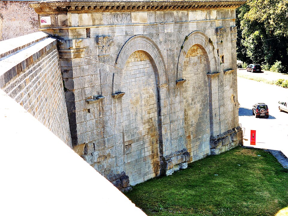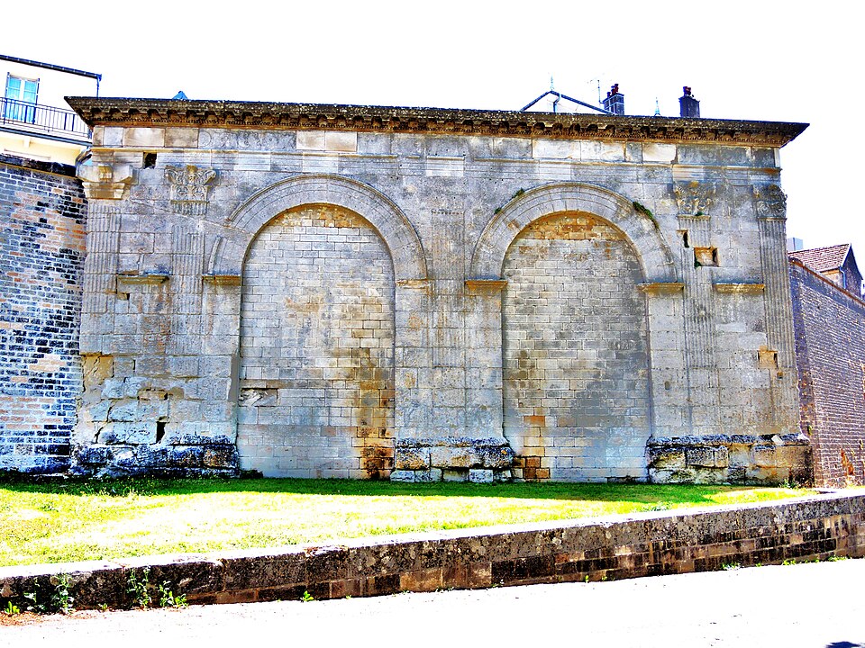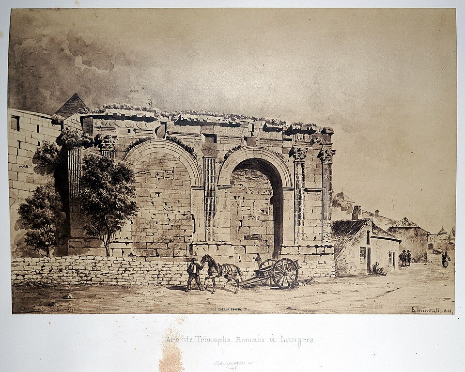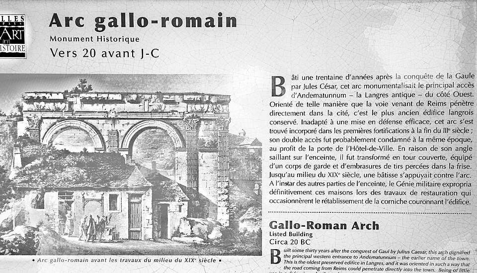 L'arc de triomphe de Langres est le vestige d'un édifice monumental datant du Ier siècle av. J.-C., situé place de l'hôtel de ville, à la bordure nord‑ouest de Langres, en Haute‑Marne (région Grand Est). C'est le plus ancien monument conservé de la ville ; il se trouvait sur la voie menant à Reims. Construit sous le second triumvirat, donc quelques années après la conquête de la Gaule par Jules César, il formait l'entrée d'une ville alors ouverte. Au IIIe siècle, l'arc a été intégré aux remparts défensifs de Langres et ses passages ont été murés. Classé au titre des monuments historiques par arrêté du 20 août 1913, il se caractérise par la rigueur et la simplicité de son tracé. L'édifice présente deux baies séparées par une pile étroite et encadrées par deux piles plus larges ; la façade est rythmée par cinq pilastres toscans coiffés de chapiteaux corinthiens (un sur la pile centrale, deux sur chaque pile extérieure). Au‑dessus des arcades subsiste une frise partiellement visible, surmontée d'une corniche à modillons, sur laquelle sont représentés armes de jets et boucliers. Le monument mesure 19 mètres 97 centimètres de longueur, prise à la hauteur des pilastres, et 10 mètres 65 centimètres d'élévation, du pied du soubassement jusqu'au‑dessus d'une corniche partiellement détruite. Pour aller plus loin, on peut consulter la liste des monuments historiques de Langres et celle des monuments protégés en 1913, ainsi que les notices et ressources disponibles sur Mérimée, Structurae et les portails de la Haute‑Marne, de la Rome antique et des monuments historiques français.