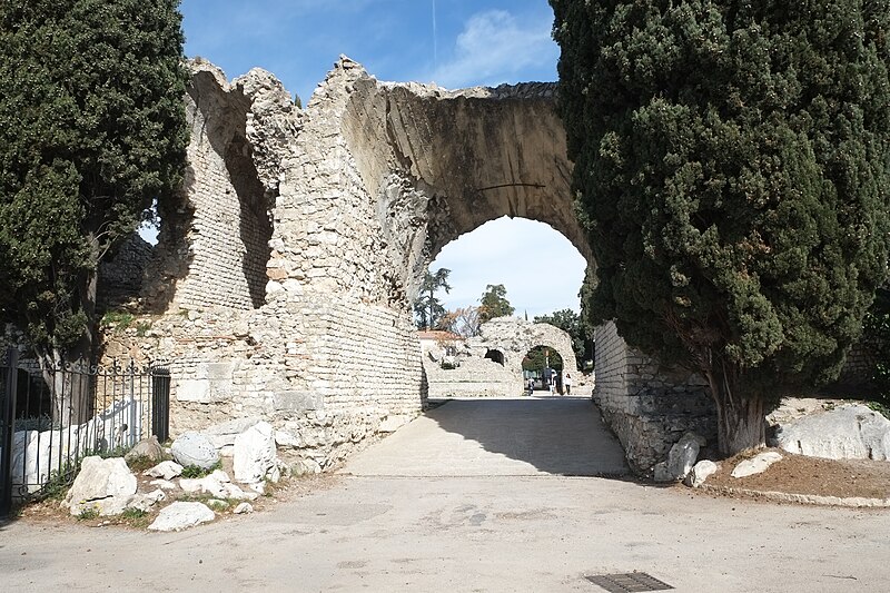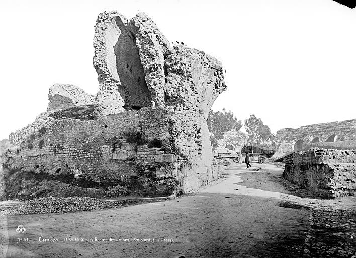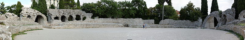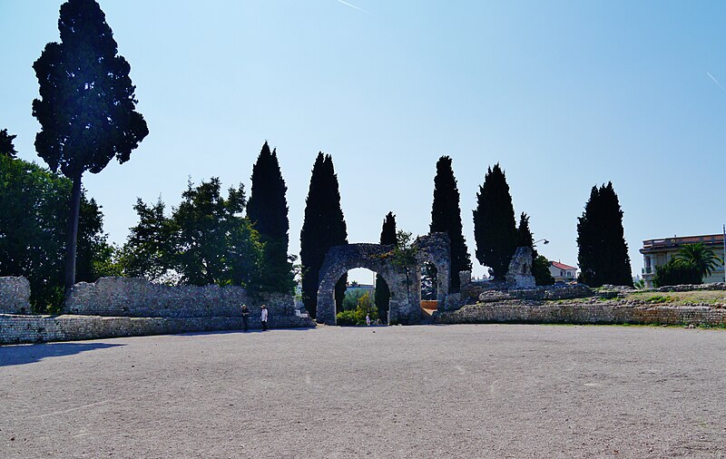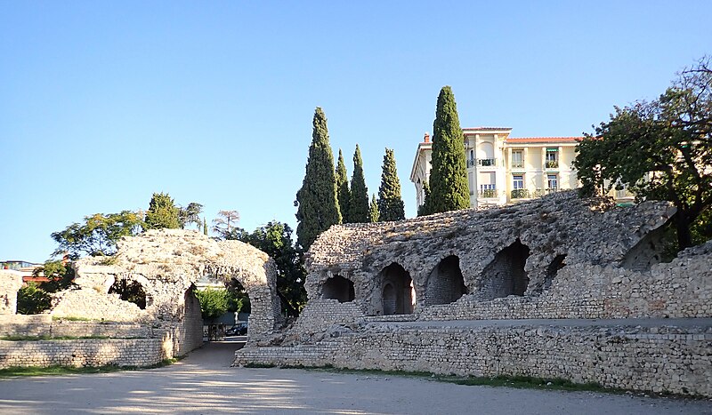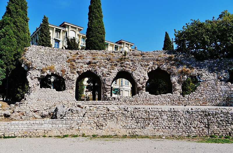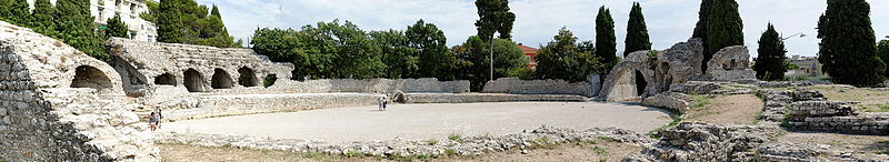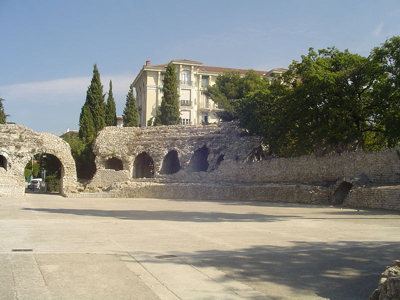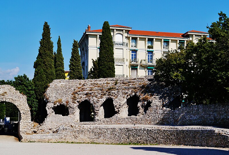 Les Arènes de Cimiez sont un amphithéâtre romain situé à Nice, dans le quartier de Cimiez. Monument de spectacles de la ville antique de Cemenelum, il figure parmi les plus petits amphithéâtres recensés en Gaule, avec une capacité estimée à 4 000 spectateurs. Construit en deux campagnes successives entre 70 et 80 de notre ère, il paraît abandonné au IVe siècle. Fouillé dans les années 1930-1940 puis en 2007, le site est ouvert au public et accueille encore des manifestations culturelles. Classé monument historique en 1965, l'édifice occupe l'angle nord-ouest d'une ville antique couvrant environ vingt hectares, les thermes romains se trouvant au sud-est. Les limites de Cemenelum sont déduites de l'emplacement des nécropoles, situées hors de l'espace urbanisé, ce qui situe l'amphithéâtre dans ce secteur nord-ouest. La première phase de construction concerne l'arène et une cavea réduite à trois rangs de gradins établis sur un remblai issu de la mise à niveau de l'arène ; des fosses du Ier siècle occupaient auparavant cet emplacement. Des trous observés sur la face externe, d'abord interprétés comme supports de gradins en bois, sont aujourd'hui considérés comme des trous de boulins liés au montage des échafaudages. La maçonnerie de cette phase est réalisée en petit appareil de moellons sans emploi de briques ni de tuiles, avec joints au mortier. Lors d'une seconde campagne, probablement au IIIe siècle, l'amphithéâtre est agrandi par la construction de deux gradins supplémentaires, l'incorporation de lits de terre cuite architecturale (opus mixtum) et la modification des accès par un promenoir annulaire et des escaliers. Ces travaux coupent également un aqueduc qui longeait le monument dans son premier état. Dans sa configuration agrandie, l'amphithéâtre forme une ellipse de 67,20 × 56 m, avec une arène de 46 × 34,80 m, et était pourvu d'un velum dont certains points d'ancrage sont encore visibles. Le rôle primitif du monument reste discuté : sa petite taille a fait envisager un usage militaire d'entraînement, mais l'absence de cages et de fosses et la capacité limitée rendent peu vraisemblable la tenue de combats d'animaux ou d'affrontements opposant de nombreux gladiateurs, ce qui suggère plutôt des jeux destinés à distraire la population. Après son abandon, des monnaies retrouvées dans les matériaux de démolition indiquent un abandon au plus tôt à la fin du IIIe siècle, et la reprise des entrées nord et sud avant l'an 350 traduit peut-être un changement d'affectation. L'arène a ensuite servi de jardin et de vignoble ; la partie orientale des gradins a été en partie supprimée au profit d'une rue qui passa plus tard dans l'arène avant des restaurations. Les observations et fouilles depuis le XVIe siècle sont nombreuses — Michel de L'Hospital signale les ruines en 1559, des relevés et fouilles se poursuivent aux XIXe et XXe siècles avec des interventions notables de Nino Lamboglia et de Paul‑Marie Duval, et un programme de fouilles d'études a été mené en 2007. Malgré des dégradations, une grande partie du monument reste visible : le mur-podium de l'arène est conservé sur presque tout son périmètre, les vomitoires nord et sud subsistent, ainsi que les gradins inférieurs et certaines portions des gradins supérieurs au-dessus des voûtes. Les vestiges accessibles forment le « jardin des arènes de Cimiez » et les objets découverts lors des fouilles sont conservés et exposés au musée archéologique de Nice‑Cimiez, situé au sud de l'amphithéâtre. L'édifice conserve son affectation principale de lieu de spectacle en accueillant des concerts et animations, notamment le Nice Jazz Festival de 1974 à 2010 et les manifestations de la Fête des Mai.
