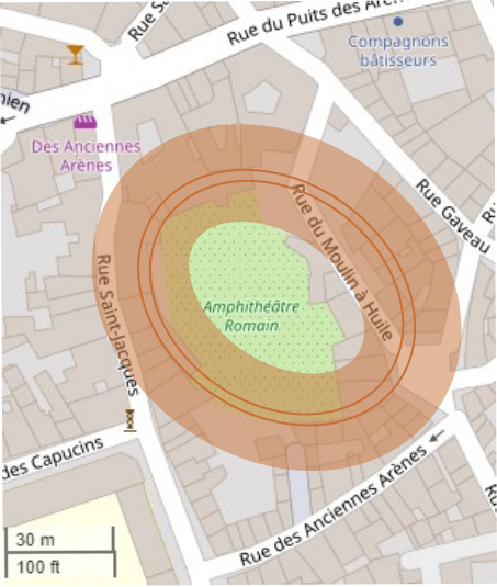 Les vestiges de l'amphithéâtre situés rue Saint-Jacques, rue du Moulin-à-Huile, place du Cirque, rue du Cirque et impasse des Anciennes-Arènes (cad. non cadastré, domaine public ; LX 152 à 154, 256 à 268, 272 à 274, 287 à 293, 295 à 298, 320 à 335, 927, 996 à 1002, 1005, 1006, 1017, 1018, 1020, 1022, 1024, 1026, 1029, 1030, 1034) : inscription par arrêté du 16 mai 2013