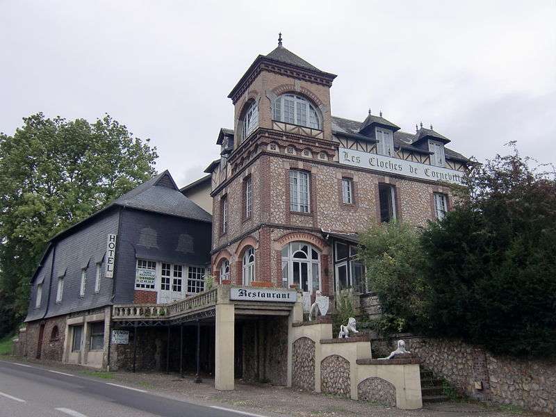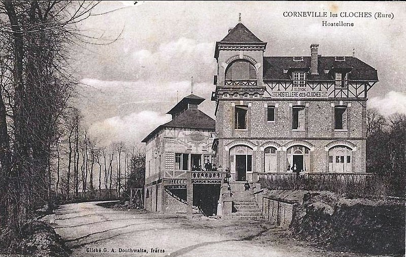 La commune de Corneville doit sa renommée à l'opérette Les Cloches de Corneville, opéra comique sur une musique de Robert Planquette (1877). En 1900, une souscription destinée à financer des cloches pour l'église de Corneville fut lancée ; la coulée était prévue le 22 septembre 1900 par l'entreprise Paccard. La souscription n'ayant pas réuni les fonds nécessaires, les cloches furent achetées par un habitant de la commune, qui les céda ensuite au patron d'une guinguette. Dans ce contexte furent édifiés successivement le pavillon des cloches, surmonté d'un campanile et flanqué d'une terrasse bordée d'un mur couronné de grilles (existants en 1903), puis le corps principal de l'auberge, installé sur une terrasse sensiblement agrandie et inauguré en 1907. La construction connut par la suite divers agrandissements. Un carillon de douze cloches fut installé dans le comble du pavillon des cloches ; ce pavillon perdit ensuite son campanile au profit d'une toiture à quatre pans, après suppression des abat-sons, et le bâtiment fut entièrement revêtu d'ardoises. Parallèlement, une procédure de classement du carillon, considéré comme instrument de musique, a été engagée.