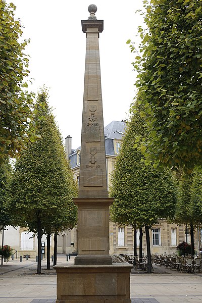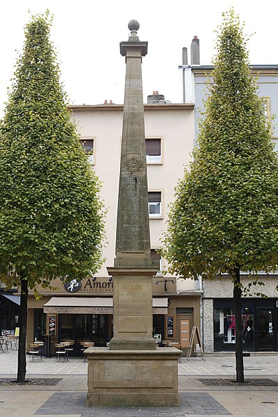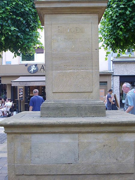 L'autel de la Patrie est situé à Thionville (Moselle) et classé aux monuments historiques depuis 1995. Il figure parmi les rares autels de la Patrie ayant survécu au Premier Empire. L'édifice, une colonne néo-classique en calcaire jaune, a été exécuté par le maçon Mathias Robert pour 150 livres après la décision municipale du 26 messidor an IV (14 juillet 1796), prise à la suite du décret de la Convention du 6 juillet 1792 pour remplacer un autel provisoire en bois. Il fut élevé en 1796 sur la place du Marché, alors appelée place de la Révolution. La colonne porte l'inscription « Érigé à la mémoire de la Révolution et des conquêtes du peuple français, le 1er vendémiaire an V » ; la date mentionnée correspond à l'anniversaire de la fondation de la République. L'ornement comporte le symbole déiste et maçonnique d'un œil entouré de rayons, interprété comme symbole de la connaissance. En 1810, pour lui éviter la destruction, l'autel fut transféré au cimetière Saint‑François où il fut surmonté d'une croix. En 1948, le conseil municipal décida de le réinstaller sur la place Claude‑Arnould ; une grande cérémonie présidée par Vincent Auriol accompagna ce déplacement et l'on ajouta alors les deux décorations (la Légion d'honneur, 1920, et la croix de guerre, 1948) ainsi que l'inscription « Thionville a bien mérité de la patrie ». L'inauguration originelle a été décrite dans une lettre au député Merlin de Thionville datée du 3 pluviôse an V (22 janvier 1798), qui relate une fête républicaine organisée par le citoyen Mangin avec salves de canon et sonneries de cloches, troupes sous les armes et défilé depuis la maison commune jusqu'à l'autel sur la place du marché. Le cortège comprenait, selon ce récit, la gendarmerie, une pyramide porteuse d'inscriptions, d'anciens défenseurs blessés, vingt‑quatre nymphes vêtues de blanc chantant des hymnes patriotiques, un char antique aux couleurs nationales tiré par trois chevaux et portant deux déesses dont l'une était la Paix, l'état‑major, des détachements de dragons, la municipalité et divers employés. Au moment de la cérémonie, la municipalité et les chefs militaires montèrent sur un amphithéâtre, des parrainages eurent lieu pour trois enfants présentés par des sages‑femmes, puis des couronnements militaires et la remise de branches de laurier furent exécutés par les déesses. Les décors ajoutés en 1948 et l'inscription commémorative figurent aujourd'hui sur le monument. Il est possible qu'il s'agisse du dernier autel de la Patrie subsistant en France.