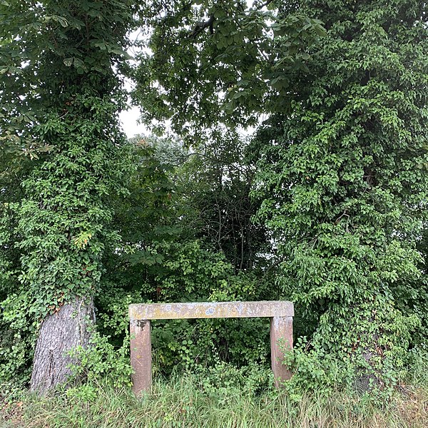 Banc commandité par le préfet et daté 1856 sur la traverse, ce banc-reposoir a été élevé à la suite de la circulaire de 1853 du préfet du Bas-Rhin Auguste-César West ; il a toutefois été entièrement refait au XXe siècle. Les bancs-reposoirs d'Alsace sont des bancs publics du XIXe siècle destinés à faciliter les haltes des paysans lors des marchés et foires. Lourdement chargées, les paysannes posaient leurs paniers protégés par un coussinet dit der Wisch et pouvaient déposer leurs fardeaux sur le linteau supérieur pour s'asseoir sur la dalle inférieure, souvent à l'ombre d'une rangée de quatre tilleuls. Deux bornes disposées de part et d'autre servaient à soutenir les hottes des hommes ou à permettre aux cavaliers de se remettre en selle. On distingue traditionnellement deux grandes séries de ces monuments : les bancs dits du Roi de Rome (ou Marie‑Louise), datés de 1811, et les bancs de l'Impératrice Eugénie, datés de 1854. Les premiers ont été érigés en 1811-1812 à l'initiative du préfet Adrien de Lezay‑Marnésia pour commémorer la naissance de l'Aiglon ; dans une lettre du 22 avril 1811 il proposait d'implanter un reposoir en pierre tous les demi‑lieu et d'y associer arbres et bancs. Les communes prirent à leur charge les frais et 125 bancs furent construits en 1811, mais très peu ont survécu. L'initiative reprise par Auguste‑César West répondait en 1853 à un vœu de l'Impératrice Eugénie ; cette fois le département finança l'achat et la taille des pierres, ce qui permit d'édifier 448 monuments commémoratifs en grès des Vosges en 1854. Souvent mutilés par le temps et par les hommes, ces bancs subsistent néanmoins dans de nombreuses campagnes. Des précédents existent : des bancs du XVIIIe siècle, conçus pour le repos ou l'agrément, sont encore attestés, notamment à la sortie de Molsheim, et certains exemplaires de Ribeauvillé pourraient être antérieurs aux séries napoléoniennes. Des formes postérieures apparaissent ensuite : des bancs‑sièges en grès datés des années 1875-1880 autour d'Erstein et Obernai, des bancs commémoratifs liés à des travaux routiers et des bancs supplétifs plus simples en bois. Durant l'annexion allemande, des prescriptions d'entretien furent émises en 1906 après une campagne de presse, sans effet notable, puis l'administrateur de Basse‑Alsace, le 27 juillet 1910, jugea la forme de ces bancs inadaptée aux usages contemporains et estima la dalle supérieure inutile ; il déclara qu'il n'était plus nécessaire de restaurer les bancs brisés. À partir des années 1980, plusieurs bancs‑reposoirs d'Alsace ont été inscrits à l'inventaire des monuments historiques et bénéficié d'arrêtés de protection. Les exemplaires conservés présentent des variantes de forme, notamment selon la disposition des dalles‑sièges et des montants, témoignant de l'adaptation locale de ce mobilier routier commémoratif.