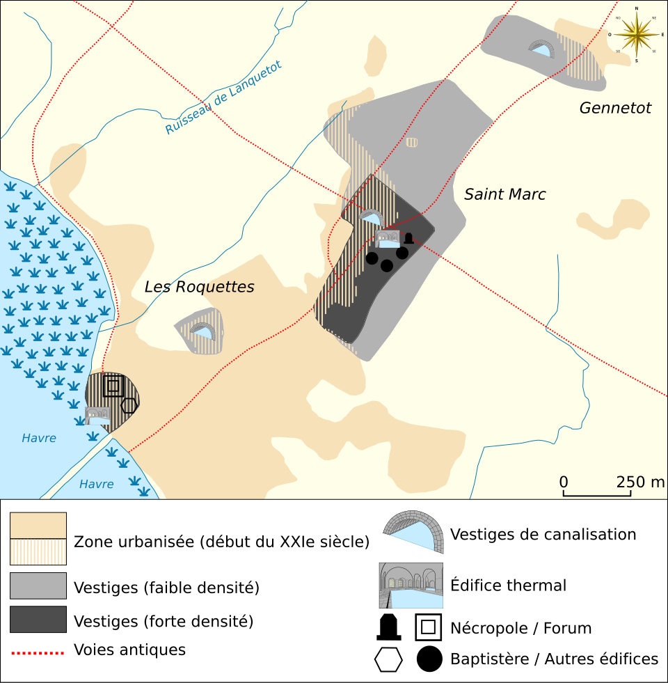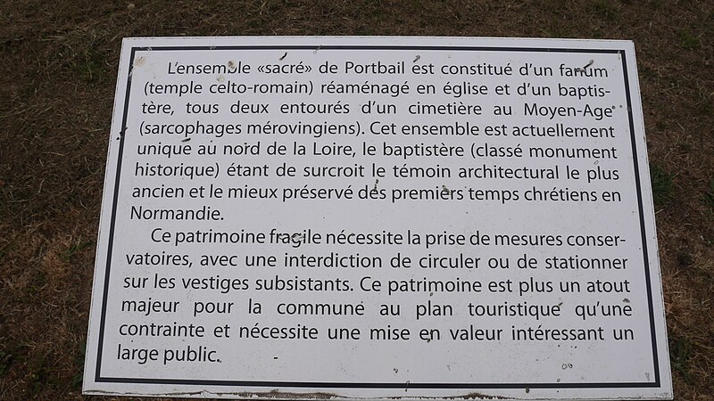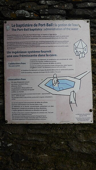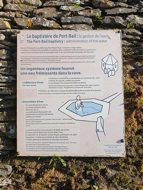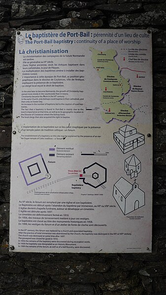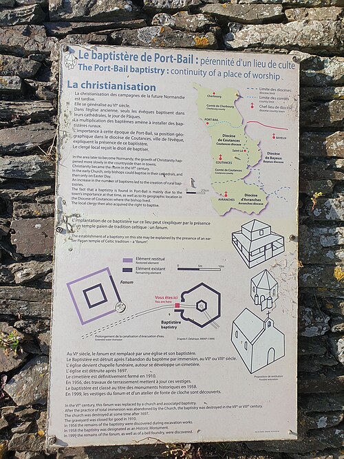 Les vestiges du baptistère paléochrétien de Portbail (Manche) se dressent au lieu-dit le Clos Michel, près du collège André-Miclot et derrière la mairie, au sein de la commune nouvelle de Port-Bail-sur-Mer. L'ensemble est classé au titre des monuments historiques par arrêté du 1er juillet 1958. Daté du IVe ou Ve siècle, ce baptistère a été mis au jour en 1956 lors de travaux pour l'école primaire. Des fouilles menées entre 1956 et 1978 par Michel de Boüard et Christian Pilet, puis une nouvelle étude en 1998 dans le cadre d'un projet de restructuration du bâtiment de protection réalisé par les Beaux-Arts en 1977, ont permis d'en documenter la structure. En 1999, des sondages dirigés par François Caligny Delahaye ont mis au jour les fondations d'un fanum situé à une quinzaine de mètres à l'est, alors encore en élévation, et ont montré que le canal d'évacuation de la piscine baptismale avait été infléchi pour longer le mur sud de la galerie du sanctuaire. À la seconde moitié du VIIe siècle, l'ensemble fut réoccupé par un cimetière où l'on a découvert de nombreux sarcophages en calcaire et une chapelle funéraire dédiée à saint Michel ; cette chapelle fut détruite après 1697 et le cimetière fermé en 1910. Une poudrière a par ailleurs été édifiée sur les vestiges du baptistère. Les fouilles ont permis de dresser le plan de l'édifice et de reconnaître la piscine baptismale, les canalisations d'adduction et d'évacuation, la partie basse des murs extérieurs et plusieurs inhumations en sarcophage. Le bâtiment présente un plan hexagonal concentrique, les murs extérieurs mesurant de 4,80 à 5,20 mètres, et s'ouvre à l'ouest par deux absidioles encadrant la porte d'entrée et le vestibule. La piscine centrale, également hexagonale, a une profondeur de 60 centimètres et des côtés extérieurs de 1,20 à 1,50 mètre ; elle était recouverte de dalles de schiste bleu locales et alimentée par une conduite venant du sud-est. Il s'agit, à ce jour, du seul baptistère de plan hexagonal daté du Ve siècle trouvé au nord de la Loire. La présence d'un tel édifice à Portbail, alors que le baptême des adultes relevait habituellement de l'évêque et d'un bâtiment proche d'une cathédrale, pose la question de sa vocation. Deux hypothèses ont été avancées : François Fichet de Clairfontaine suggère que l'évêque de Coutances disposait ici d'une résidence, tandis que Julien Deshayes propose qu'il s'agisse d'un baptistère monastique lié à une abbaye antérieure aux invasions scandinaves et réactivée par la suite. Dans la donation de Richard III à son épouse en 1026, le terme abbatia est employé, le lieu y figurant comme dépendance du domaine ducal donnée en dot à Adèle de France. Des fouilles pratiquées à Meysse et à Roanne ont par ailleurs révélé l'existence de baptistères en dehors d'une cité épiscopale, fournissant un parallèle possible à la situation de Portbail.