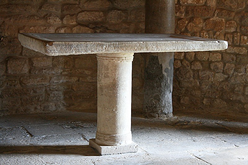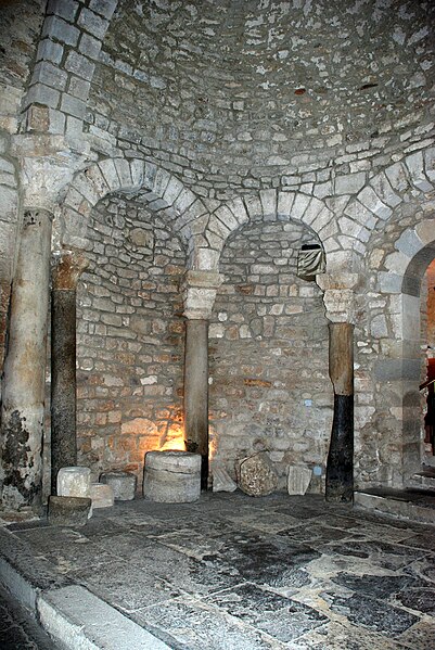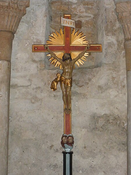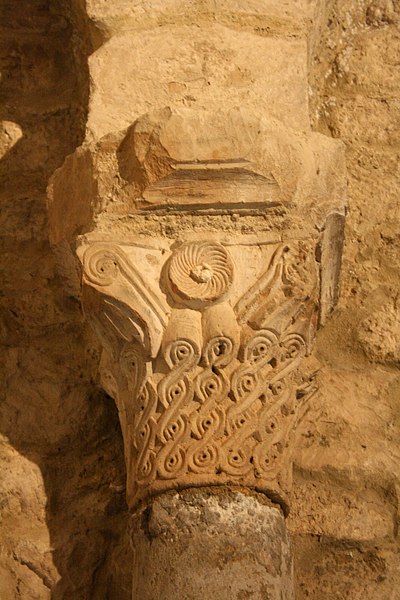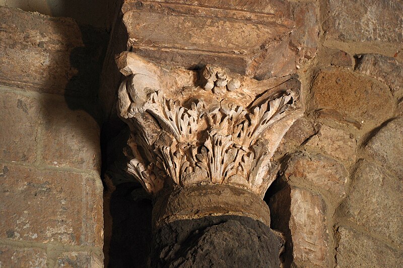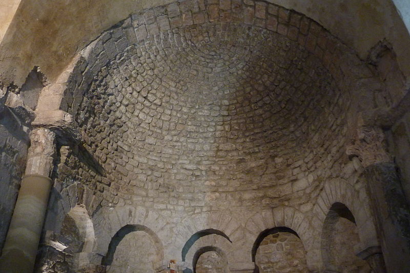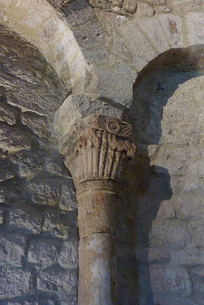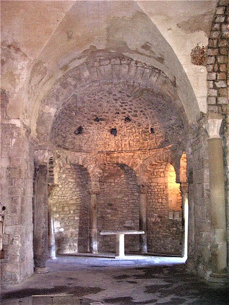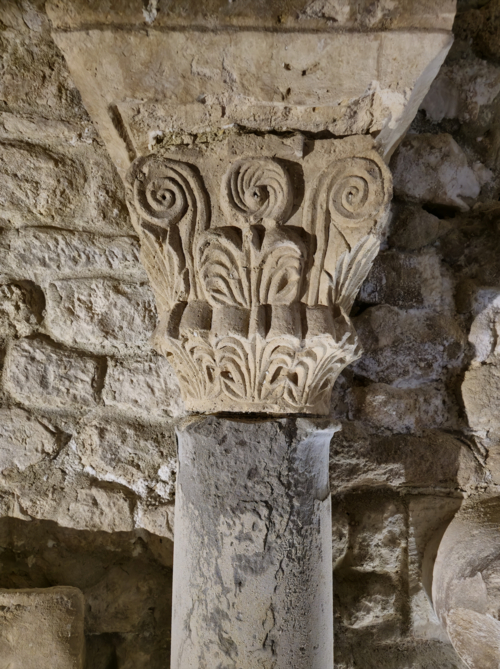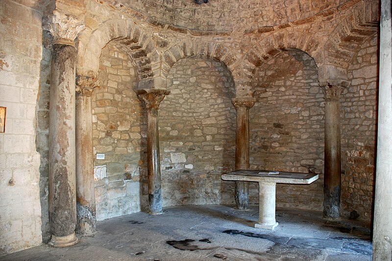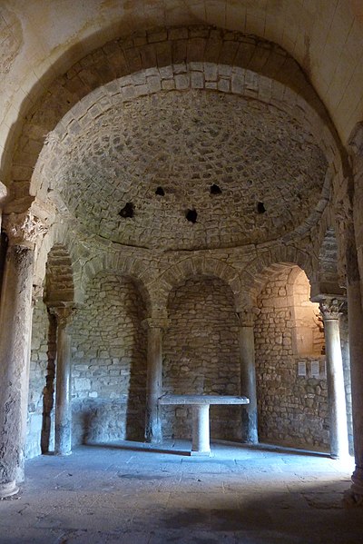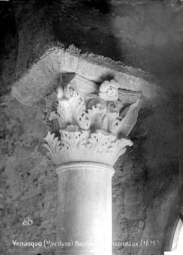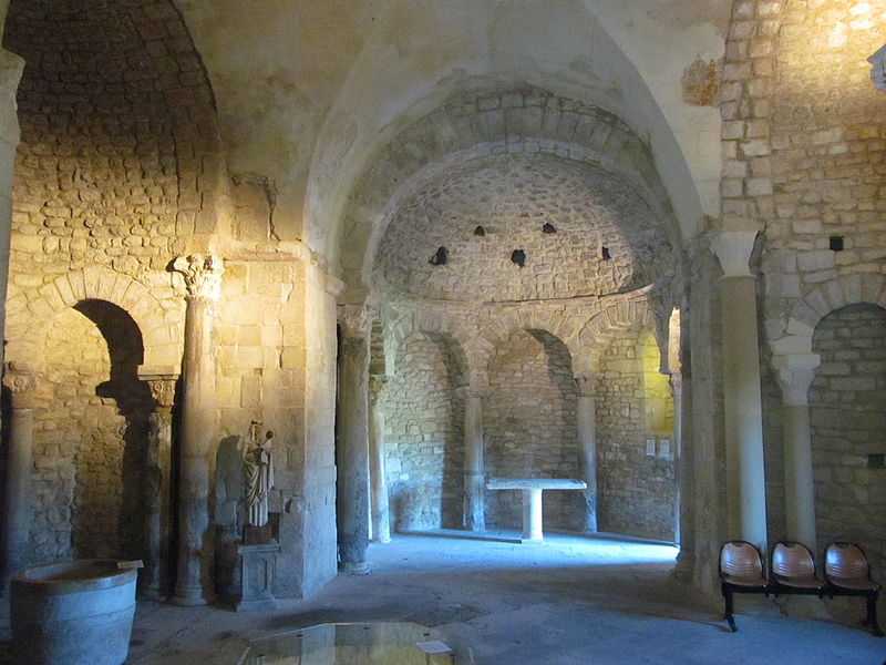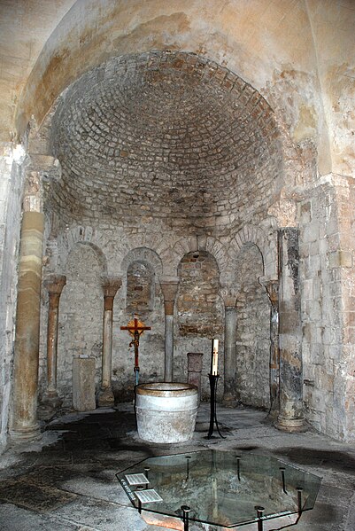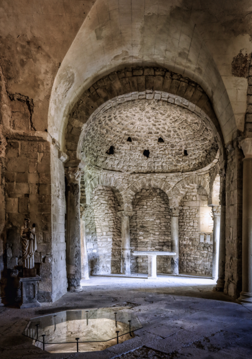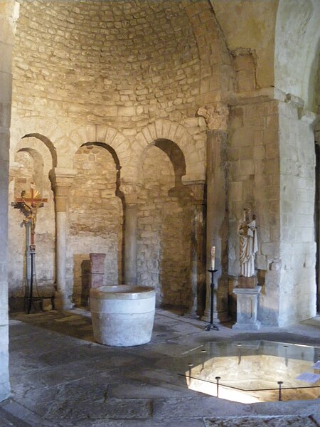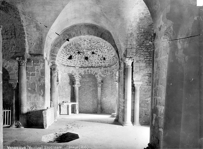 Le baptistère de Venasque, situé dans le Vaucluse, a été construit à l'époque mérovingienne et remanié à plusieurs reprises jusqu'à la période romane. Il est classé au titre des monuments historiques depuis 1840. À l'origine, l'édifice serait un temple romain dédié soit à Diane, soit à Vénus, soit à Mercure. Selon la tradition, le baptistère Saint-Jean-Baptiste a été fondé à l'époque mérovingienne par saint Siffrein, moine de l'abbaye de Lérins devenu évêque de Venasque à la fin du VIe siècle. Il servait au baptême par immersion des catéchumènes adultes, un rite célébré uniquement par l'évêque et n'ayant lieu que deux fois par an, d'où la nécessité d'un édifice de grande taille. L'édifice est composé de quatre absides, chacune précédée d'un arc triomphal porté par deux grandes colonnes monolithes. Chaque abside présente une voûte en cul-de-four soutenue par cinq arcs, eux-mêmes appuyés sur six colonnes monolithes de plus petite taille. Certaines colonnes et chapiteaux proviennent probablement de matériaux de réemploi d'origine romaine, tandis que des chapiteaux à cannelures et entrelacs appartiennent à la phase mérovingienne. L'abside nord abrite un autel de marbre et l'abside ouest une cuve de marbre provenant probablement d'un ancien pressoir à huile. Le baptistère conserve une cuve baptismale octogonale décentrée. Les quatre absides ont été remaniées à partir du XIe siècle. Symboliquement, les quatre absides évoquent les bras de la croix et les points cardinaux, les cinq arcs de chaque abside renvoient aux cinq sens, et l'octogone de la cuve symbolise la résurrection du Christ et la notion d'une nouvelle création.