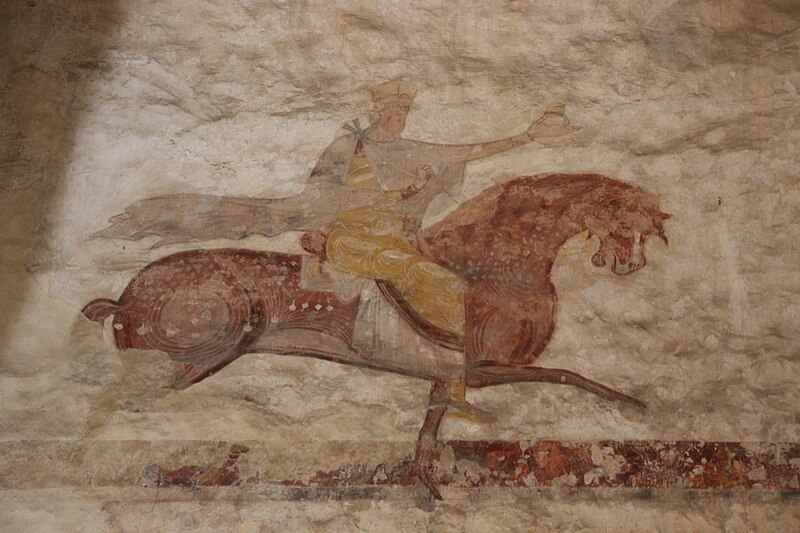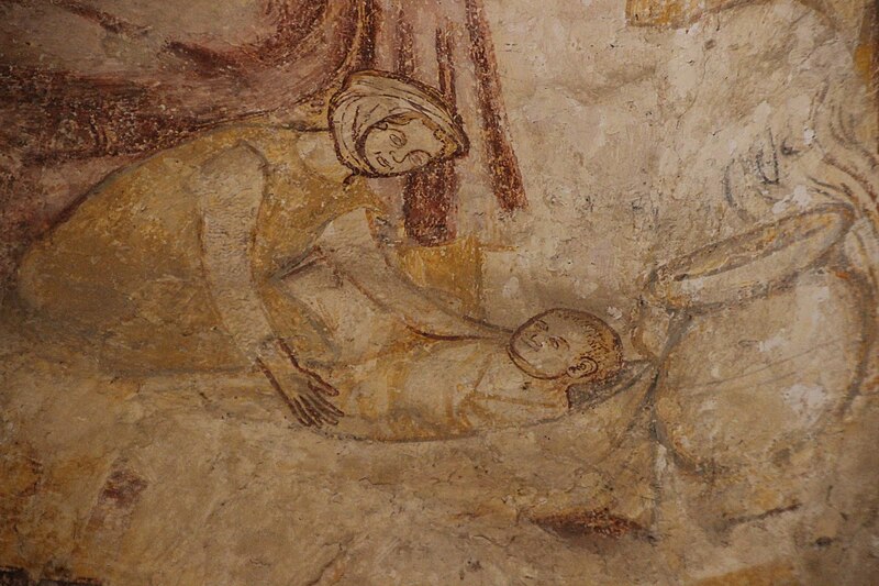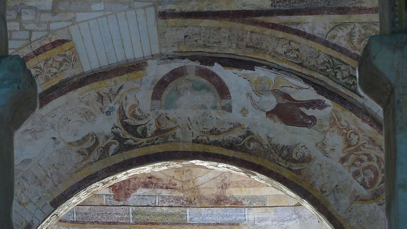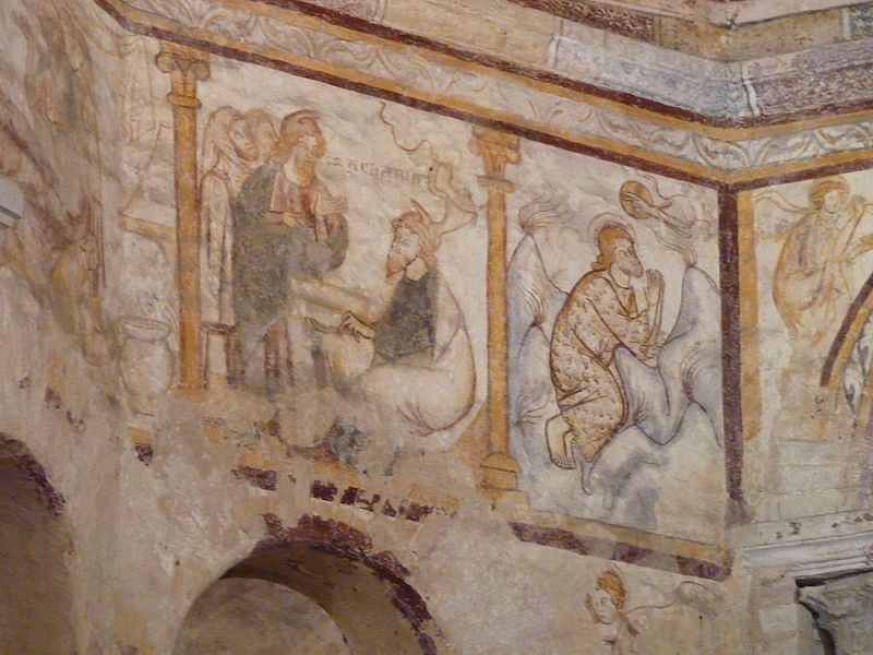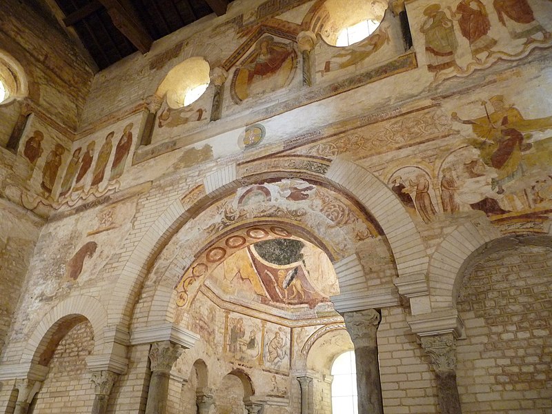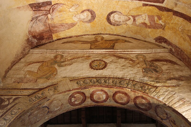 Les peintures romanes du XIe siècle forment un programme iconographique dense : sur le mur est, un Christ en majesté dans une mandorle, des apôtres, inscriptions latines et motifs symboliques se conjuguent avec des scènes et des motifs plus tardifs superposés, tandis que d’autres murs présentent paons, saints identifiables et scènes dont certaines portent des inscriptions remarquables. Les fresques gothiques, qui recouvraient largement les murs, développent notamment dans l’abside polygonale la vie de saint Jean-Baptiste et d’autres figures sacrées, tandis que des traces de décors des siècles suivants subsistent encore.