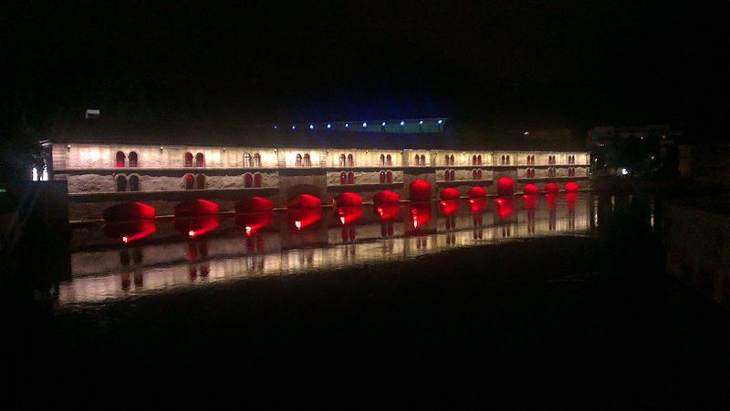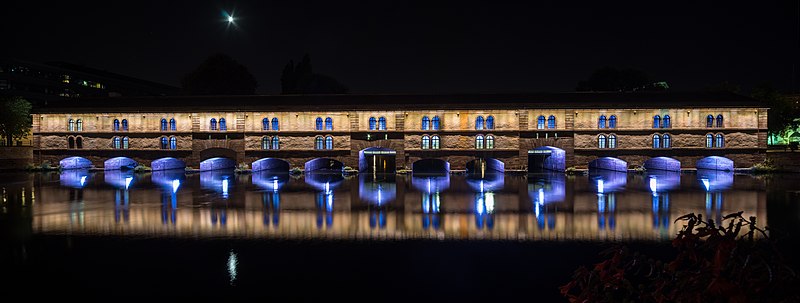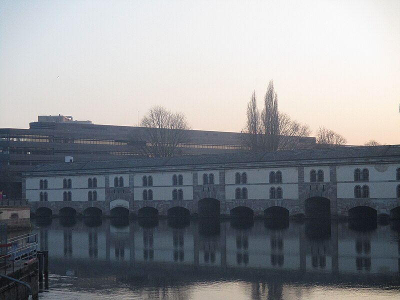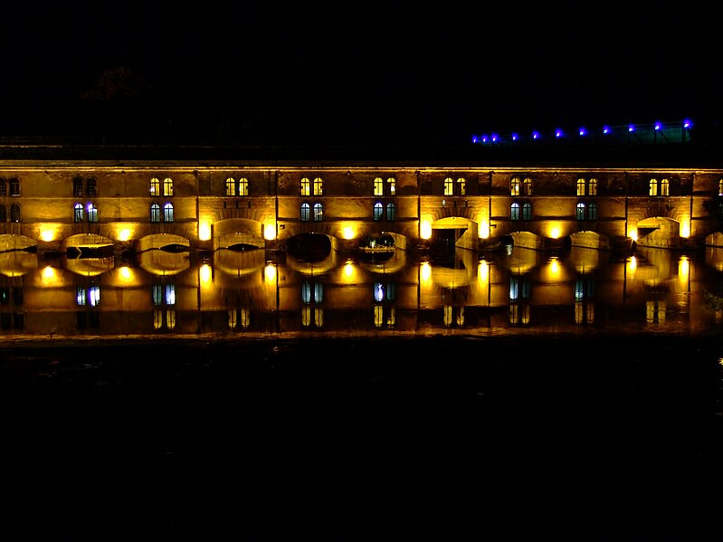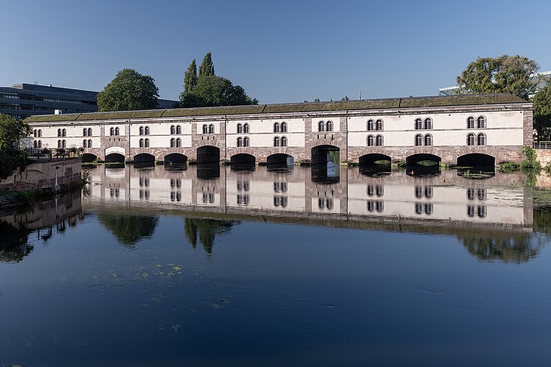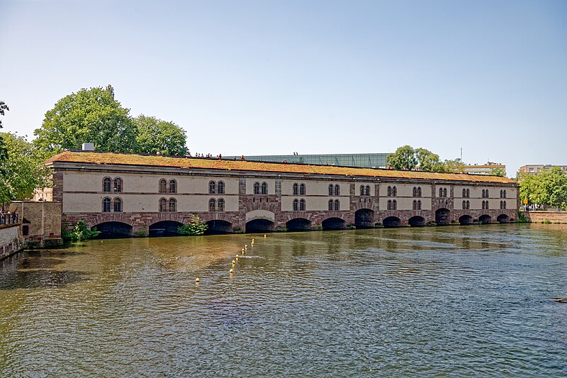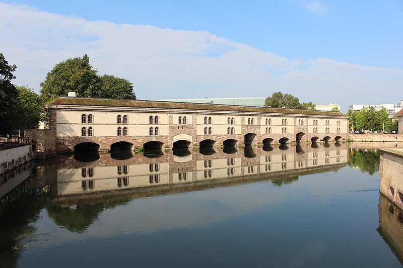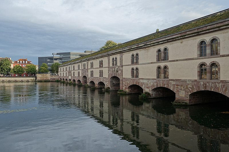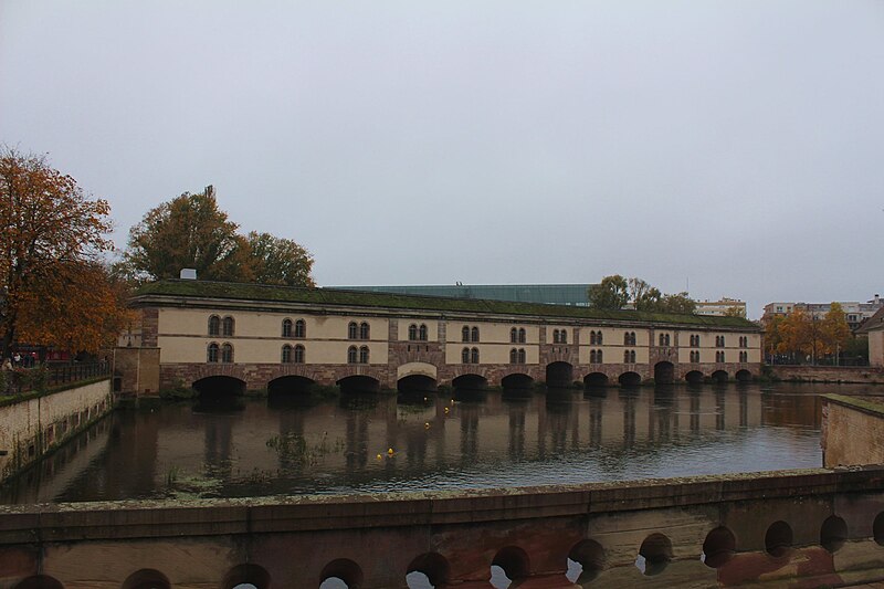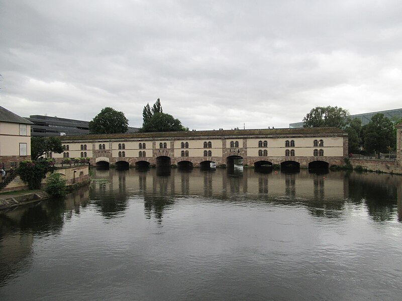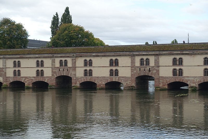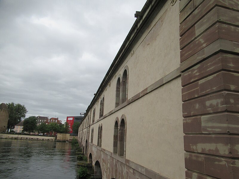 L’édifice comporte treize arches équipées de vannes fermées par des panneaux de fer mobiles permettant de contrôler les inondations, ainsi que des herses empêchant le passage des embarcations ; les trois arches marinières, plus hautes, étaient relevées pour la navigation. Remanié en 1865 pour résister aux bombardements, le barrage a vu sa façade aval en pan de bois maçonnée et sa toiture comblée de terre afin d’absorber les impacts. Il joue aussi le rôle de passage entre les rives de l’Ill et comporte trois ponts‑levis. Deux escaliers intérieurs et un ascenseur pour les personnes à mobilité réduite donnent accès au toit qui sert de terrasse et offre une vue sur les ponts couverts et la cathédrale. Le « passage public » porte le nom de Georges Frankhauser ; on y expose des statues et des moulages en plâtre des statues de la cathédrale, et des expositions temporaires y sont présentées, parmi lesquelles la Biennale Internationale du Verre en 2013 et 2015.
