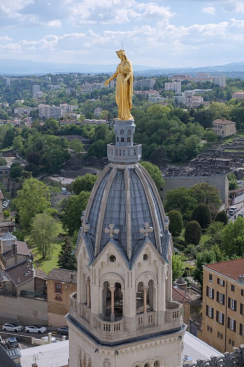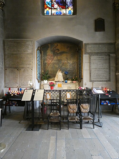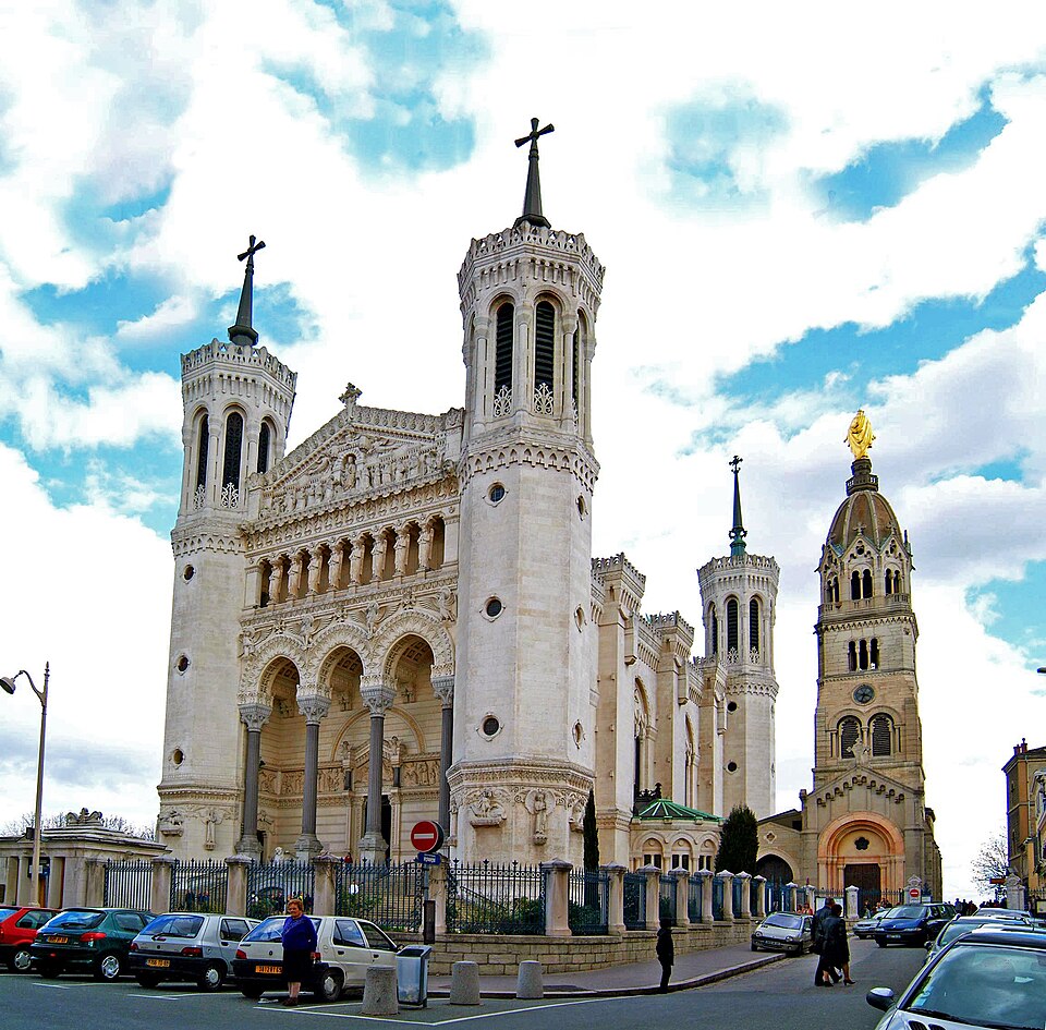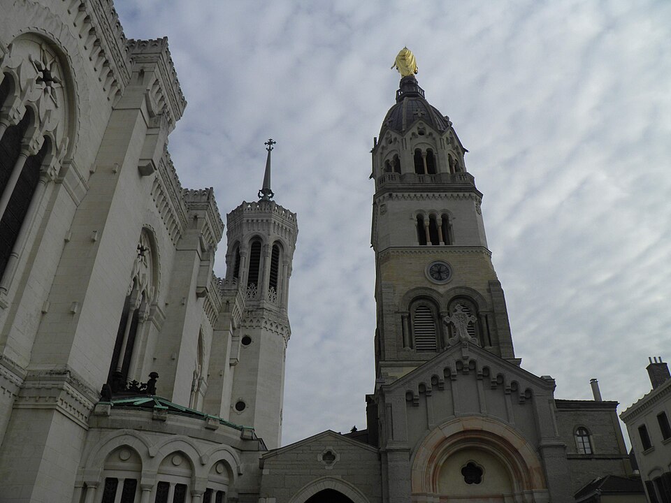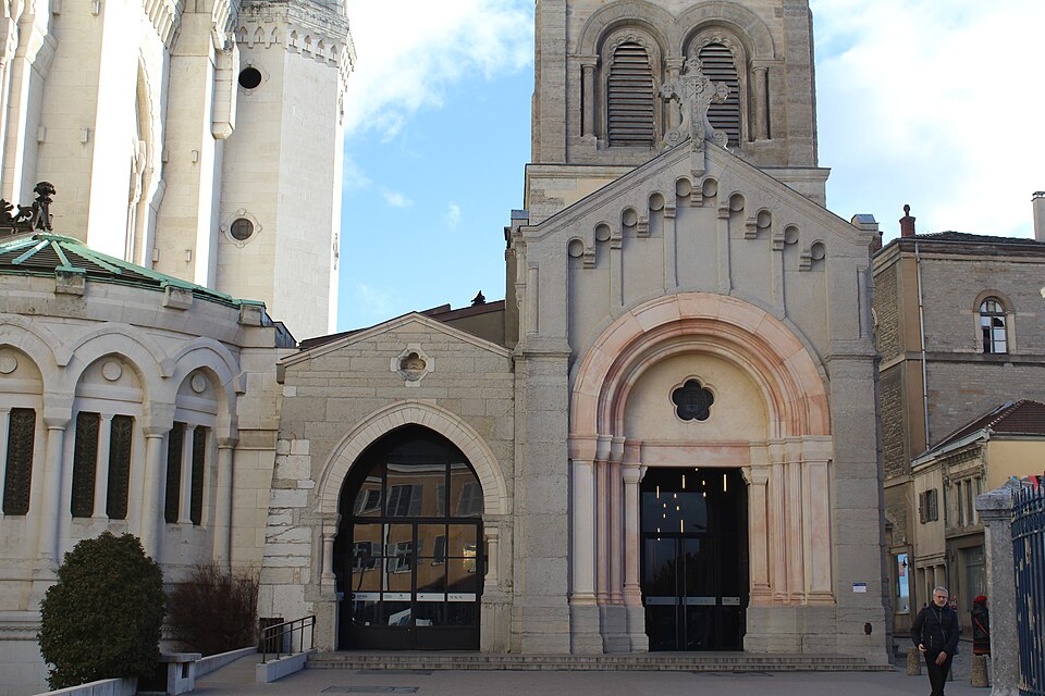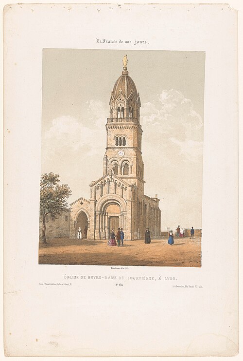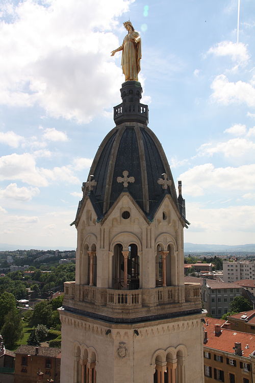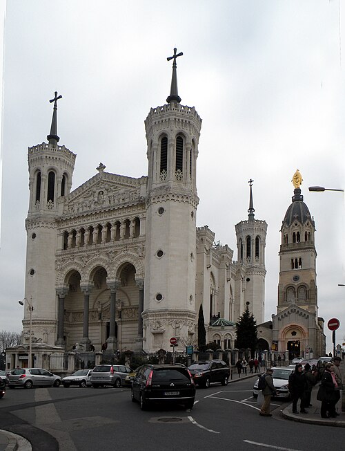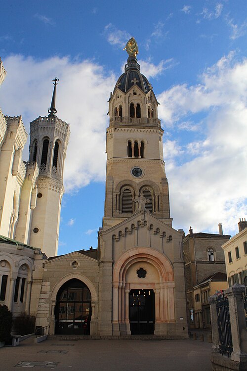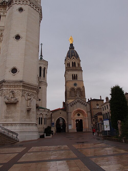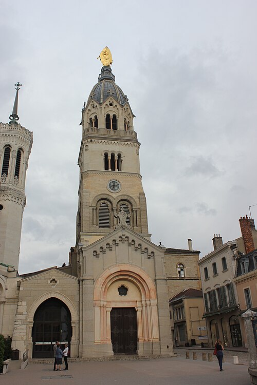Érigé sur la colline de Fourvière, le sanctuaire actuel est l'œuvre de Pierre Bossan dont le chantier a commencé en 1872 ; de style néo-byzantin, il se distingue par une silhouette blanche extérieure évoquant une forteresse et un intérieur riche en mosaïques et vitraux colorés. L'emplacement remonte à l'Antiquité et, au Moyen Âge, la colline abrite déjà une chapelle dédiée d'abord à saint Thomas puis à la Vierge ; cette dévotion se structure avec la chapelle Saint-Thomas édifiée à partir de 1630. En 1642–1643, en réponse aux épidémies de peste, les échevins instituent un vœu et un pèlerinage annuel, fixé au 8 septembre, qui ancre la tradition de pèlerinage à Fourvière. Au milieu du XIXe siècle, le clocher de la chapelle est rehaussé et, en 1852, une grande statue dorée de la Vierge réalisée par Joseph-Hugues Fabisch est placée au sommet, donnant naissance à la fête des Lumières lors de son inauguration reportée au 8 décembre. La création en 1850 de la Commission de Fourvière vise à protéger et sanctuariser la colline ; elle joue un rôle majeur dans l'acquisition des terrains et le portage du projet de basilique. Bossan, contraint par la santé à superviser le chantier à distance, confie une large part de l'exécution à Louis Sainte‑Marie Perrin ; malgré les critiques, son architecture trouve de nombreux partisans. La première pierre, bénie par Pie IX en 1869, est posée dans des fondations profondes le 8 novembre 1872 en raison de la piètre qualité du sous-sol, qui exige des pieux, des citernes de drainage et des massifs importants. Le financement repose essentiellement sur une souscription populaire ; le devis initial est dépassé et, à l'achèvement en 1896, les montants engagés se chiffraient à plusieurs millions de francs. La construction fait appel à des matériaux choisis pour leur couleur et leur maniabilité : choins d'Hauteville‑Lompnes pour les soubassements, calcaire dit « pierre du Midi » pour la superstructure, travertin du Bugey pour les voûtes et marbre bleu pour certaines colonnes. L'édifice est consacré comme église le 16 juin 1896 puis élevé au rang de basilique mineure en mars 1897. Depuis sa fondation la basilique appartient à la Commission de Fourvière et non à l’archevêché, statut qui lui a permis d'échapper aux effets de la loi de 1905 ; cette propriété collective a aussi contribué à son inscription progressive comme monument lyonnais. L'édifice obtient diverses protections et reconnaissances : inscription à l'inventaire supplémentaire des monuments historiques en septembre 1977, reconnaissance d'utilité publique et inscription au patrimoine mondial au titre du site historique de Lyon en 1998, puis classement au titre des monuments historiques en mars 2014. Monument emblématique de la ville et symbole de sa vocation mariale, la basilique accueille environ deux millions de pèlerins et de visiteurs chaque année et forme un ensemble comprenant la chapelle Saint‑Thomas, la statue, l’esplanade panoramique et le jardin du Rosaire. Au XXe et XXIe siècles, des travaux successifs ont été menés pour consolider la tour-lanterne et restaurer les décors, notamment des mosaïques dont certaines avaient été endommagées par des infiltrations ; d'importantes campagnes de restauration ont eu lieu entre 2006 et 2013. Ces interventions ont porté sur le renforcement des structures, le remplacement d'éléments de maçonnerie et de couverture, la reprise des mosaïques et la rénovation de l'éclairage, pour un coût total estimé et financé en grande partie par des collectivités publiques complétées par des dons. La basilique reste un lieu de culte actif et un point de repère urbain très visible, équipé aussi d'antennes FM implantées dans les croisillons sommitaux et desservi par le funiculaire de Fourvière, dont la station donne directement accès au parvis. Enfin, certaines compositions décoratives, comme les mosaïques dites « des hérésies », ont suscité des débats publics et, en 2005, une démarche œcuménique a abouti à une déclaration commune visant à dépasser des ruptures historiques.