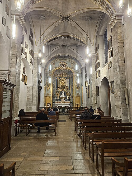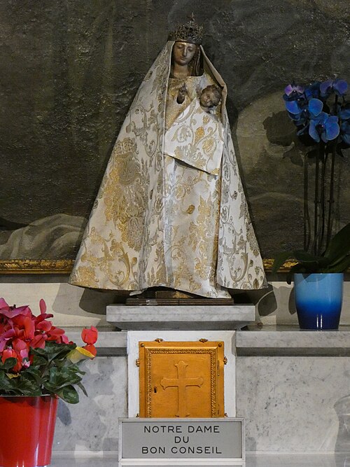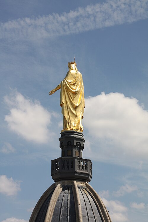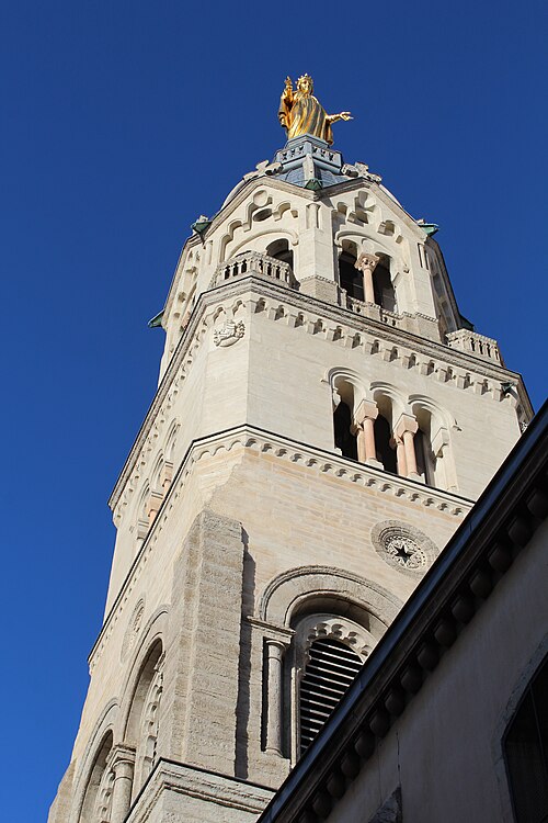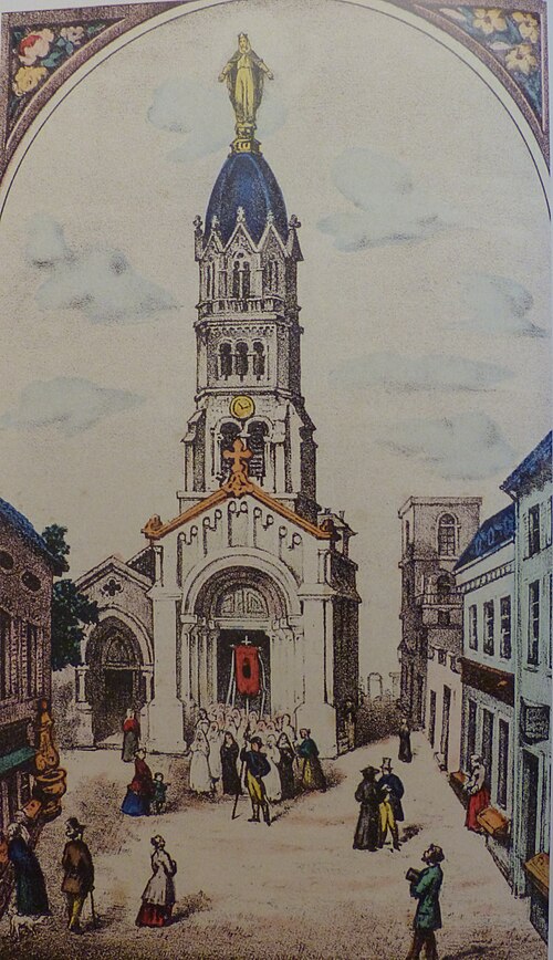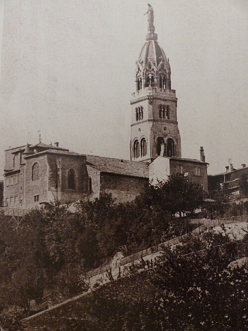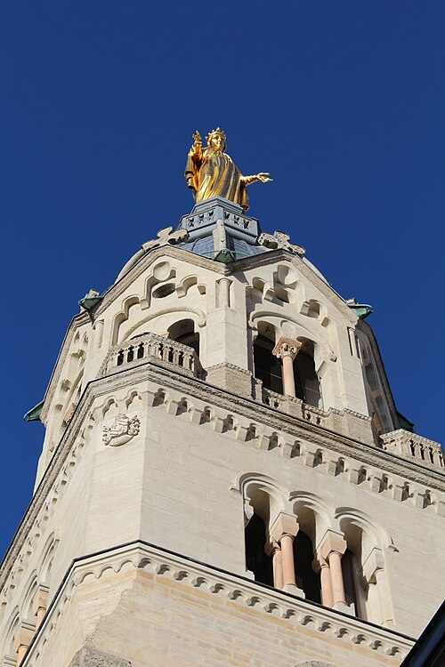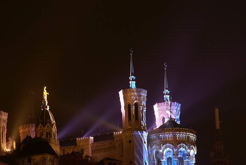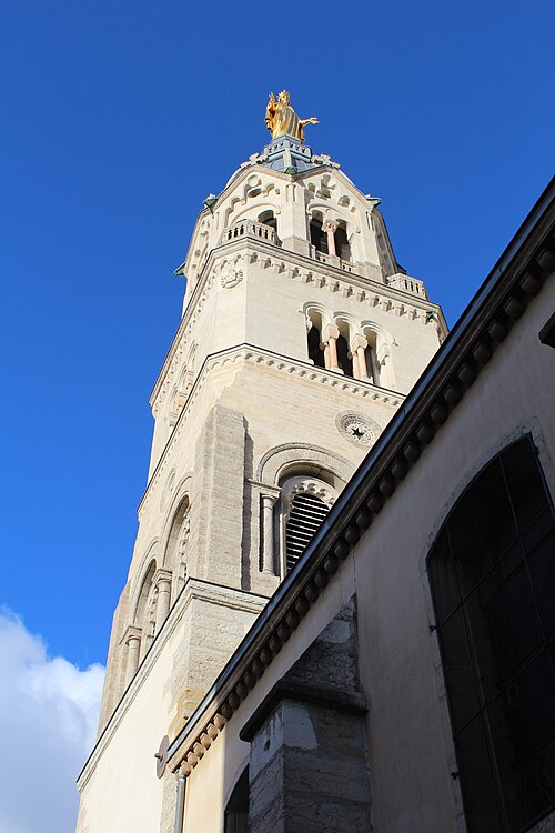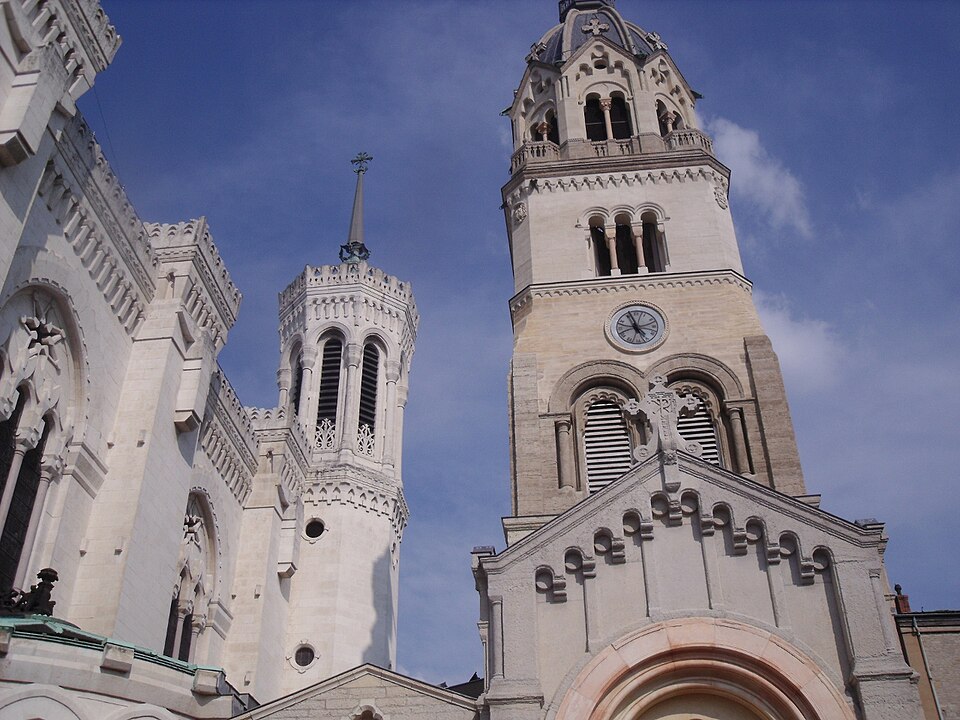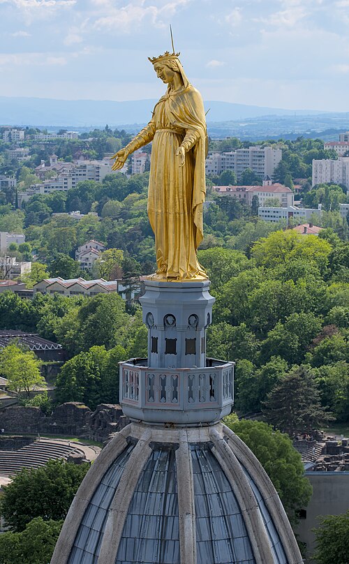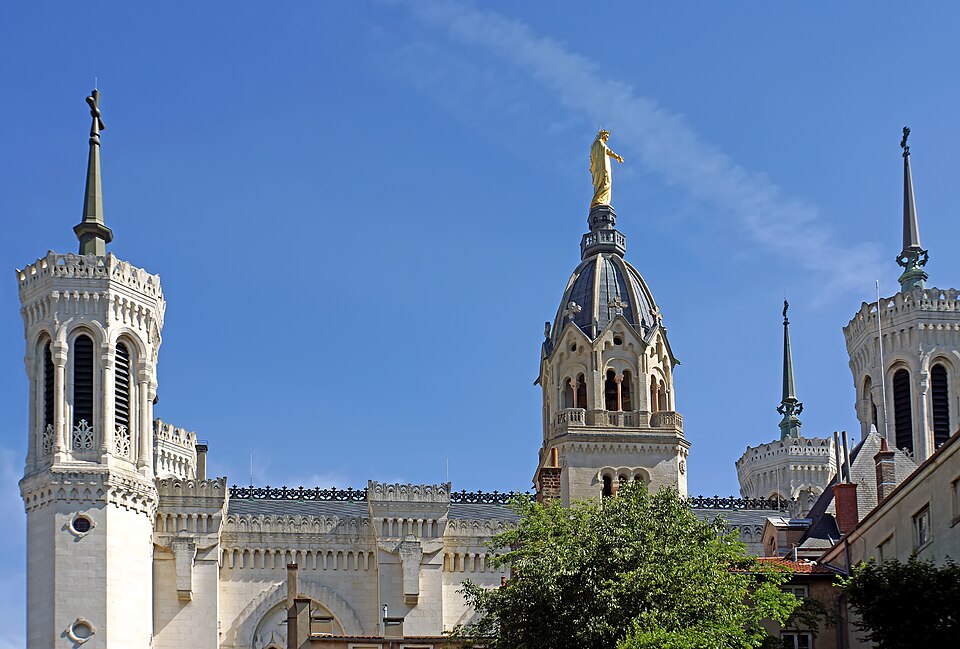 Érigé sur la colline de Fourvière, le sanctuaire actuel est l'œuvre de Pierre Bossan dont le chantier a commencé en 1872 ; de style néo-byzantin, il se distingue par une silhouette blanche extérieure évoquant une forteresse et un intérieur riche en mosaïques et vitraux colorés. L'emplacement remonte à l'Antiquité et, au Moyen Âge, la colline abrite déjà une chapelle dédiée d'abord à saint Thomas puis à la Vierge ; cette dévotion se structure avec la chapelle Saint-Thomas édifiée à partir de 1630. En 1642–1643, en réponse aux épidémies de peste, les échevins instituent un vœu et un pèlerinage annuel, fixé au 8 septembre, qui ancre la tradition de pèlerinage à Fourvière. Au milieu du XIXe siècle, le clocher de la chapelle est rehaussé et, en 1852, une grande statue dorée de la Vierge réalisée par Joseph-Hugues Fabisch est placée au sommet, donnant naissance à la fête des Lumières lors de son inauguration reportée au 8 décembre. La création en 1850 de la Commission de Fourvière vise à protéger et sanctuariser la colline ; elle joue un rôle majeur dans l'acquisition des terrains et le portage du projet de basilique. Bossan, contraint par la santé à superviser le chantier à distance, confie une large part de l'exécution à Louis Sainte‑Marie Perrin ; malgré les critiques, son architecture trouve de nombreux partisans. La première pierre, bénie par Pie IX en 1869, est posée dans des fondations profondes le 8 novembre 1872 en raison de la piètre qualité du sous-sol, qui exige des pieux, des citernes de drainage et des massifs importants. Le financement repose essentiellement sur une souscription populaire ; le devis initial est dépassé et, à l'achèvement en 1896, les montants engagés se chiffraient à plusieurs millions de francs. La construction fait appel à des matériaux choisis pour leur couleur et leur maniabilité : choins d'Hauteville‑Lompnes pour les soubassements, calcaire dit « pierre du Midi » pour la superstructure, travertin du Bugey pour les voûtes et marbre bleu pour certaines colonnes. L'édifice est consacré comme église le 16 juin 1896 puis élevé au rang de basilique mineure en mars 1897. Depuis sa fondation la basilique appartient à la Commission de Fourvière et non à l’archevêché, statut qui lui a permis d'échapper aux effets de la loi de 1905 ; cette propriété collective a aussi contribué à son inscription progressive comme monument lyonnais. L'édifice obtient diverses protections et reconnaissances : inscription à l'inventaire supplémentaire des monuments historiques en septembre 1977, reconnaissance d'utilité publique et inscription au patrimoine mondial au titre du site historique de Lyon en 1998, puis classement au titre des monuments historiques en mars 2014. Monument emblématique de la ville et symbole de sa vocation mariale, la basilique accueille environ deux millions de pèlerins et de visiteurs chaque année et forme un ensemble comprenant la chapelle Saint‑Thomas, la statue, l’esplanade panoramique et le jardin du Rosaire. Au XXe et XXIe siècles, des travaux successifs ont été menés pour consolider la tour-lanterne et restaurer les décors, notamment des mosaïques dont certaines avaient été endommagées par des infiltrations ; d'importantes campagnes de restauration ont eu lieu entre 2006 et 2013. Ces interventions ont porté sur le renforcement des structures, le remplacement d'éléments de maçonnerie et de couverture, la reprise des mosaïques et la rénovation de l'éclairage, pour un coût total estimé et financé en grande partie par des collectivités publiques complétées par des dons. La basilique reste un lieu de culte actif et un point de repère urbain très visible, équipé aussi d'antennes FM implantées dans les croisillons sommitaux et desservi par le funiculaire de Fourvière, dont la station donne directement accès au parvis. Enfin, certaines compositions décoratives, comme les mosaïques dites « des hérésies », ont suscité des débats publics et, en 2005, une démarche œcuménique a abouti à une déclaration commune visant à dépasser des ruptures historiques.
