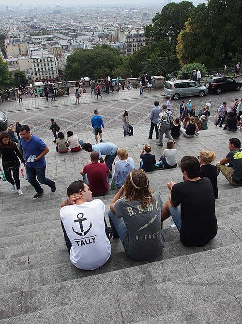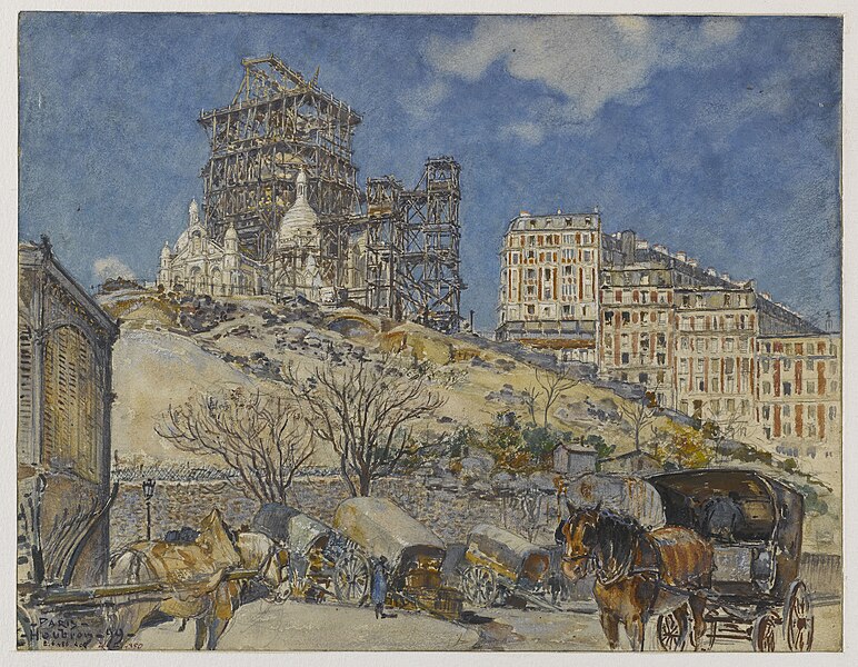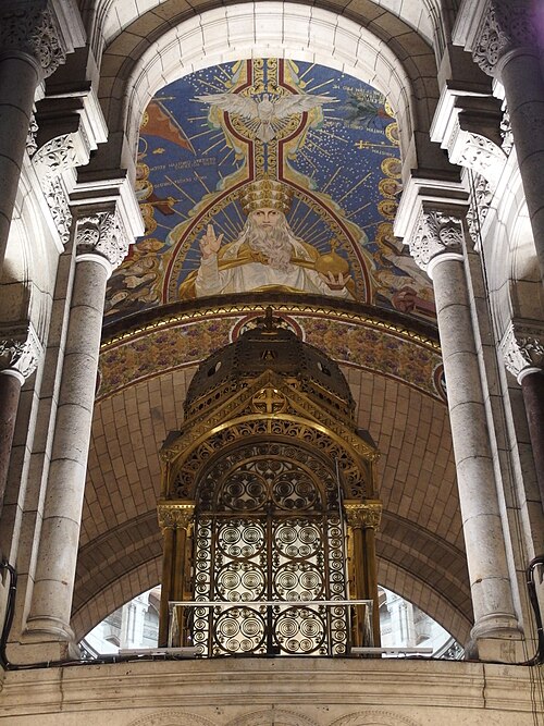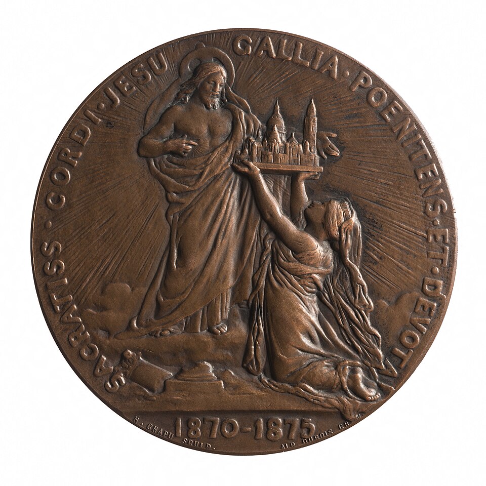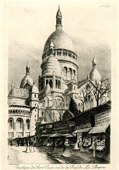 La basilique du Sacré-Cœur est née d'un vœu formulé par Alexandre‑Félix Legentil, soutenu notamment par Hubert Rohault de Fleury, à la suite des événements de la guerre de 1870. Souvent désignée sous le nom de « Vœu national », elle illustre la dimension religieuse et nationale du projet. Le chantier prend une dimension publique après la loi la déclarant d'utilité publique en 1873 et le concours de 1874 remporté par Paul Abadie. La colline de Montmartre a été choisie pour l'implantation en raison du manque d'églises dans l'ancien village annexé, de sa charge religieuse liée au martyre de saint Denis et de sa situation dominante, visible de tout Paris. Financée par une vaste souscription nationale, la construction et la décoration s'étalent sur près d'un demi‑siècle. Les fondations sont engagées en 1877 et la crypte, de dimensions équivalentes à l'église haute, est édifiée entre 1878 et 1889. La construction de l'édifice haut commence en 1881 ; les façades sont terminées en 1891, les coupoles en 1899 et le clocher en 1914. La basilique est mise en service dès 1891 et consacrée en 1919, tandis que la décoration intérieure se poursuit ensuite. La grande mosaïque du chœur est achevée en 1923, la chapelle Saint‑Ignace‑de‑Loyola en 1934 et l'ensemble des vitraux, détruits pendant la Seconde Guerre mondiale, est refait entre 1946 et 1977. Après la mort de Paul Abadie en 1884, plusieurs architectes se succèdent — Honoré Daumet, Charles Laisné, Henri Rauline, Lucien Magne et Jean Hulot — avec Charles Garnier intervenant comme architecte‑conseil, chacun faisant évoluer le projet dans le respect de ses grandes lignes. Le décor associe une soixantaine d'artistes, parmi lesquels Hippolyte Lefebvre, Pierre Séguin, Léon Fagel, Jean‑Auguste Dampt, Léon‑François Sicard, Luc‑Olivier Merson, Raymond Subes, Louis‑Ernest Barrias, Henri Pinta et René Martin. Les annexes, conçues par Jean Hulot, comprennent un premier bâtiment à l'est, réalisé au début des années 1930 et relié à la basilique par un pont‑galerie abritant la sacristie, un second édifice accolé dans les années 1950 et une seconde galerie construite vers 1962 selon des procédés plus économiques. La ville de Paris, propriétaire de la basilique depuis 1908, a fait aménager la partie sud de la butte dans les années 1920 par Jean‑Camille Formigé et Léopold Bévière ; cet aménagement met en valeur l'édifice par une perspective formée de deux grands escaliers droits, flanqués d'escaliers diagonaux en zigzag. Conçue pour accueillir les pèlerins, l'église présente un plan basilical avec déambulatoire et chapelles rayonnantes ; sa nef, couverte de cinq coupoles, lui confère aussi l'apparence d'un plan centré. Propriété de la commune de Paris et qualifiée de sanctuaire de l'adoration eucharistique et de la miséricorde divine, la basilique du Sacré‑Cœur est un édifice religieux majeur de la capitale.