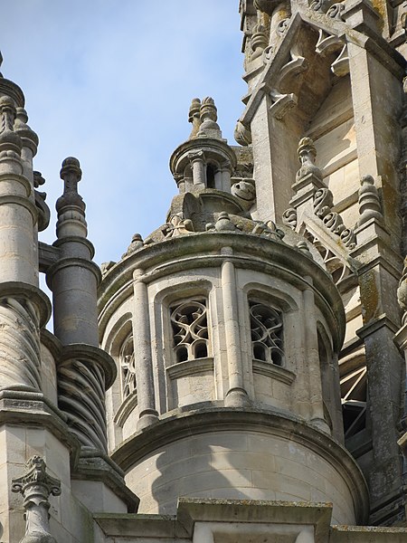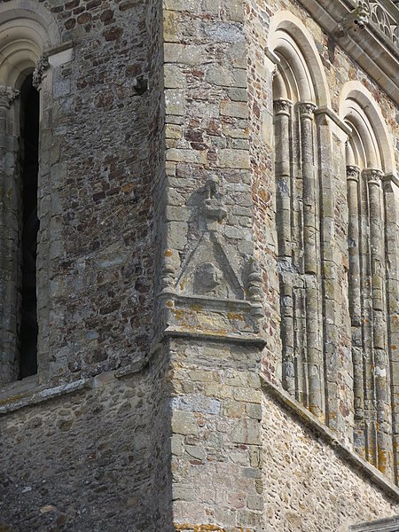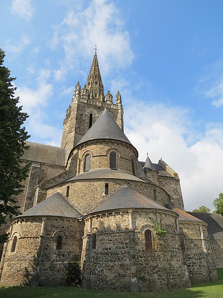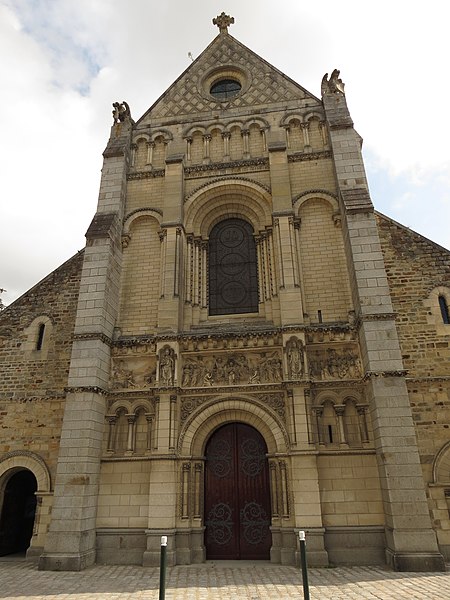 Architecturalement, l'édifice présente un plan en croix latine et un chevet légèrement désaxé, caractéristique de l'art roman dans l'ensemble, le clocher mêlant pour sa part des éléments gothiques et de Renaissance. Le chevet est la partie la plus ancienne et la plus remarquable, avec un déambulatoire desservant cinq chapelles rayonnantes voûtées en cul‑de‑four, et un transept saillant doté lui aussi de chapelles. Le chœur s'organise autour de sept arcades reposant sur des colonnes monocylindriques, un triforium de douze arcs en plein‑cintre et sept fenêtres hautes, chaque arc et baie étant encadrés par de petites colonnes dont les chapiteaux, de diverses époques, affichent une riche variété de motifs sculptés.